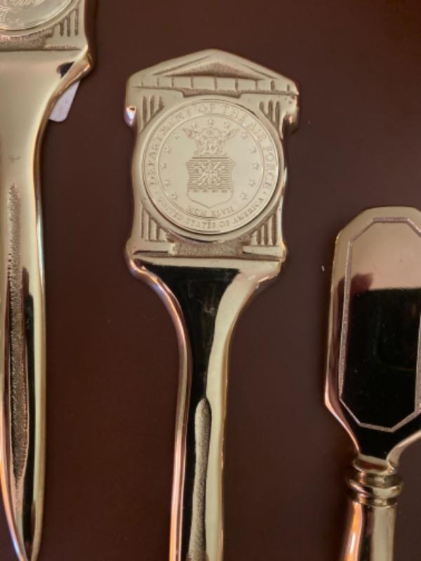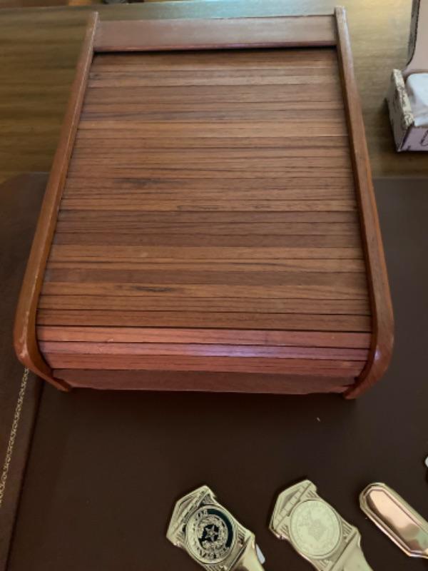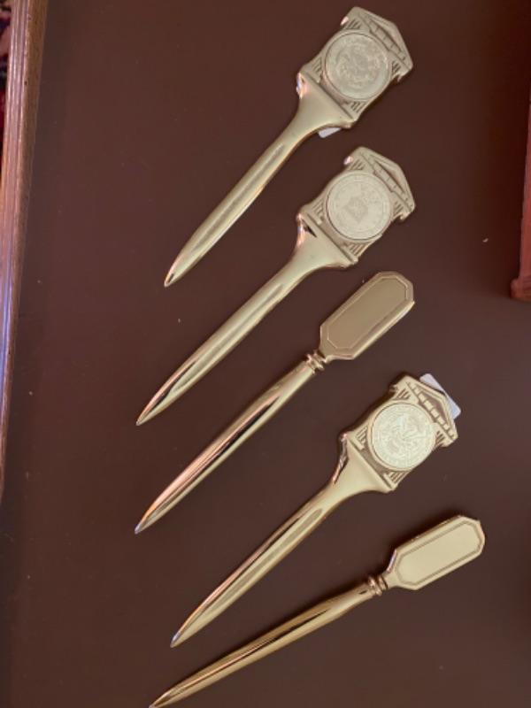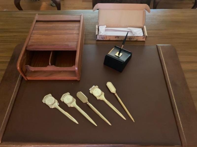 Mid Century Desk Lot with VA. Brass Letter Openers, Leather Desk Pad with Rolling Paper storage