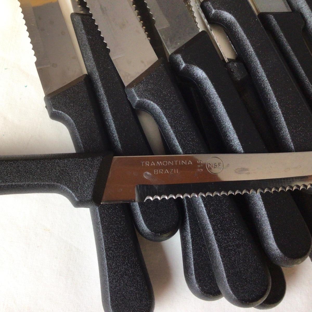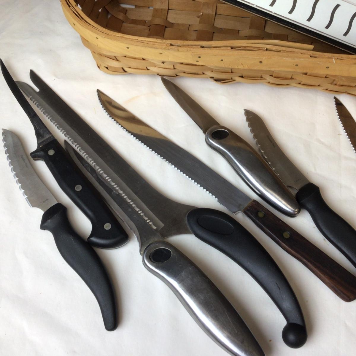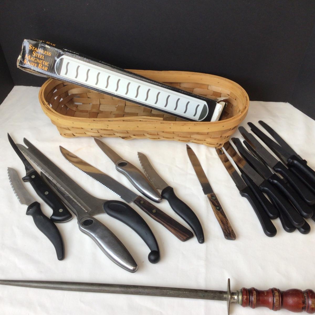Assorted kitchen prep knives, steak knives and magnetic knife bar with basket.