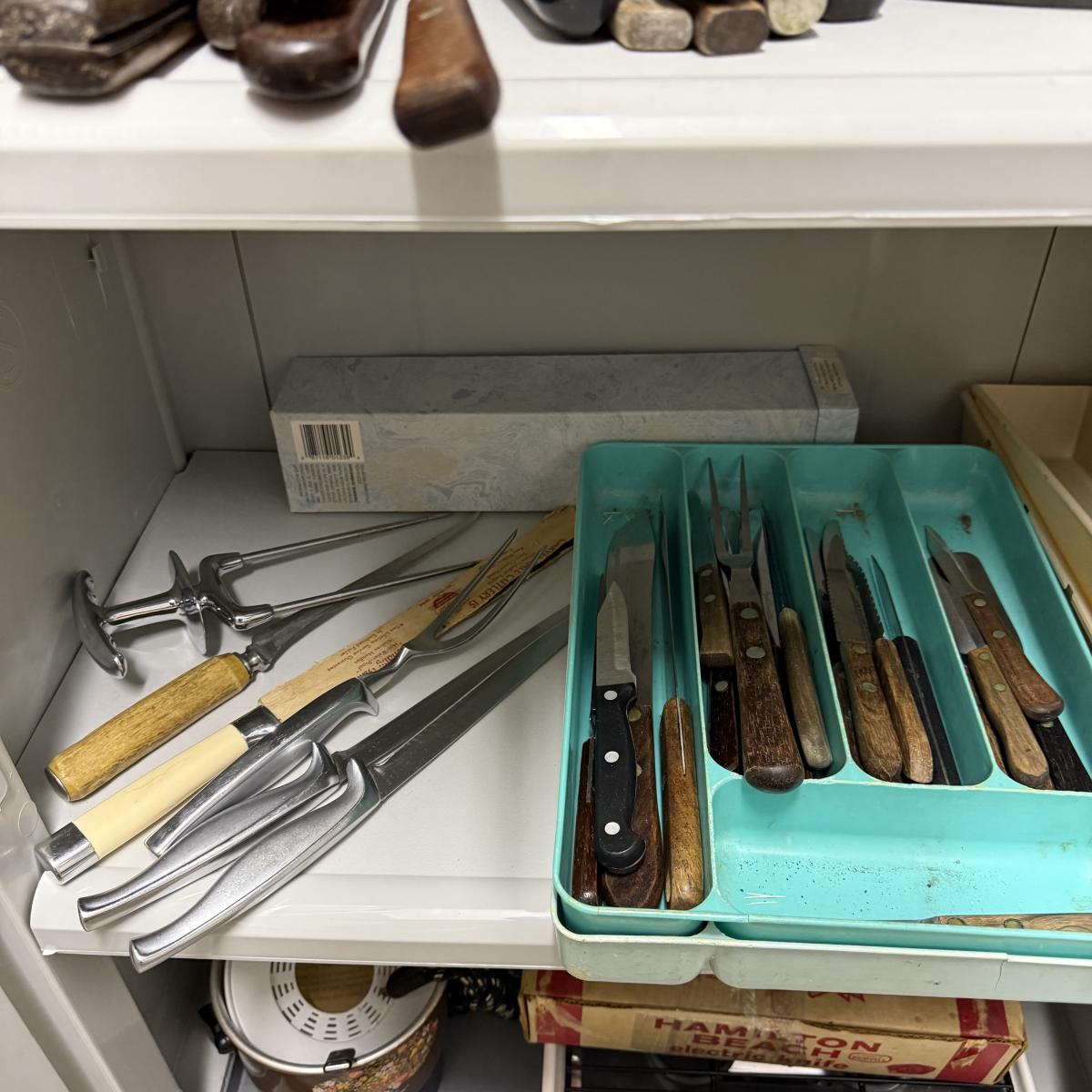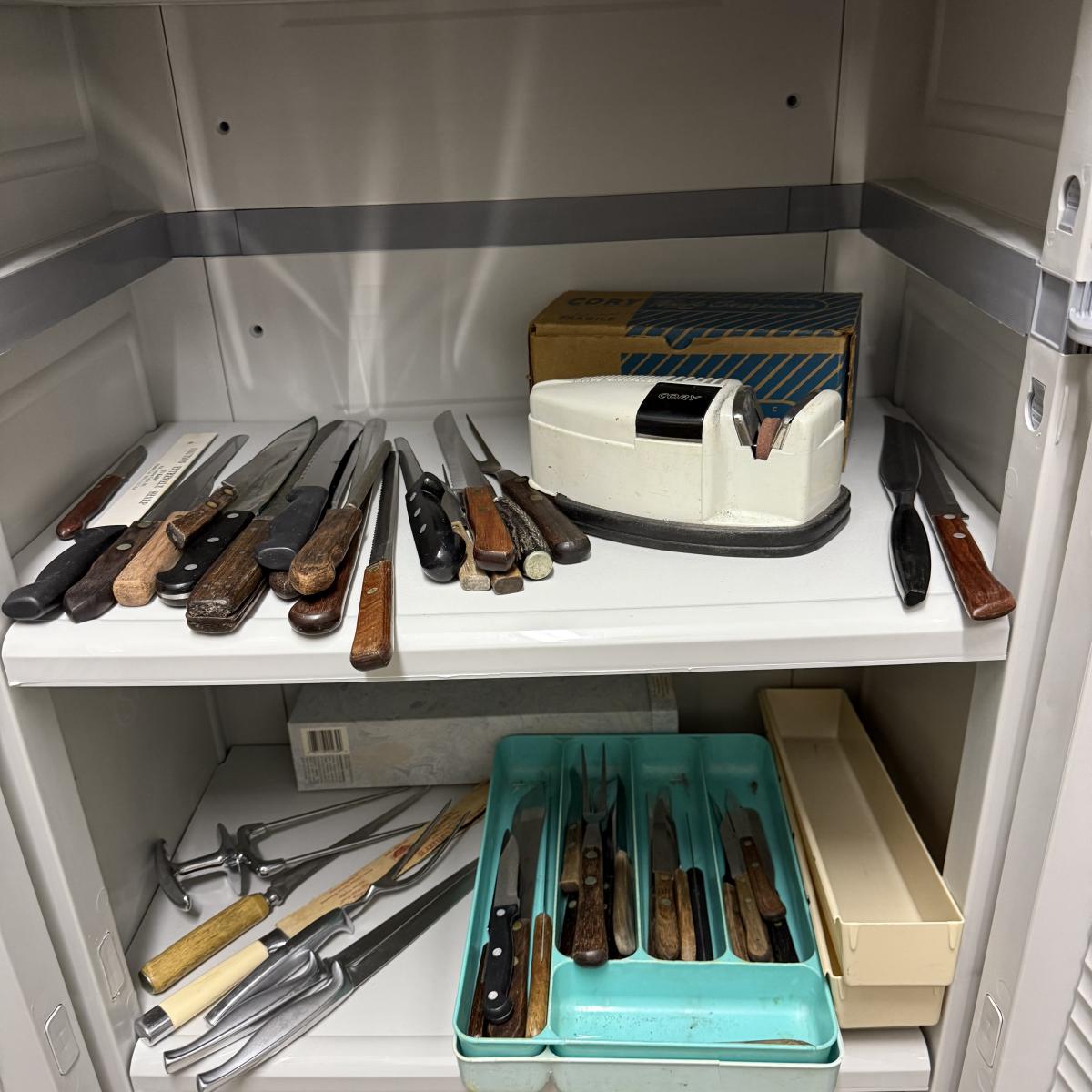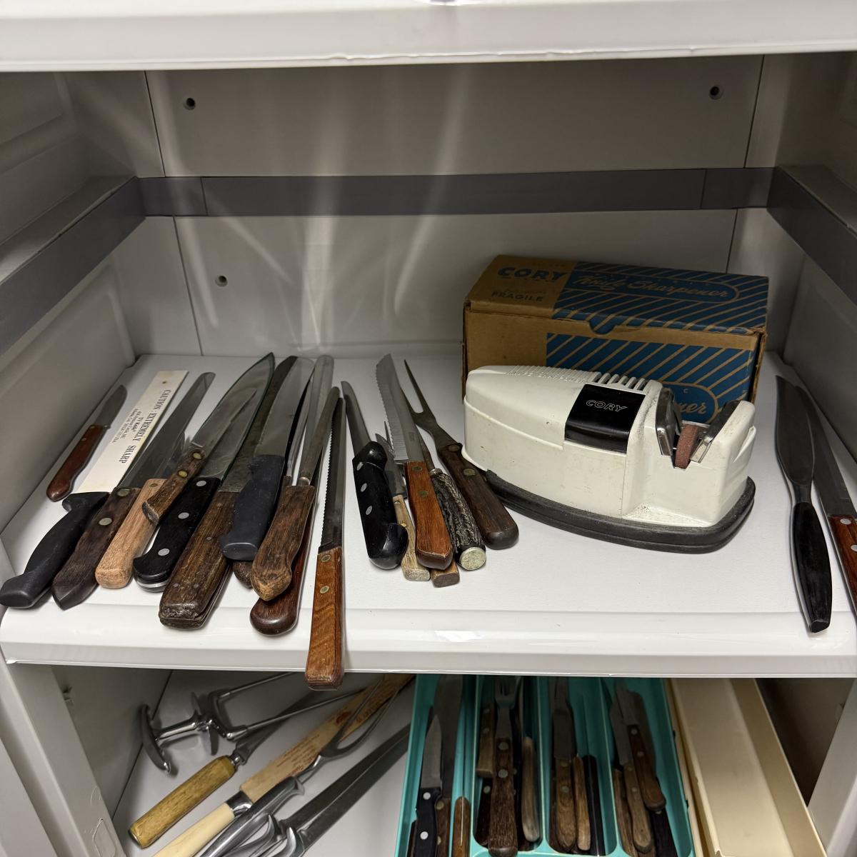 Comes with two shelves of vintage knives and vintage Cory knife sharpener