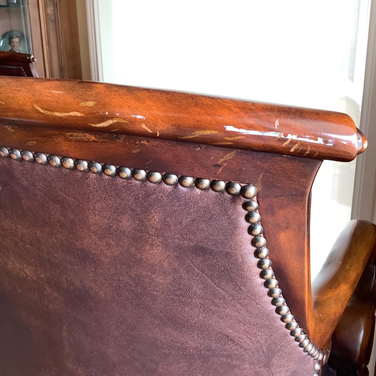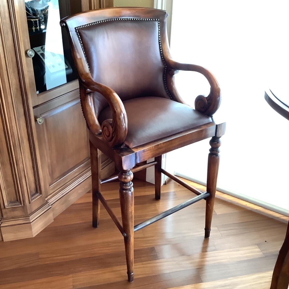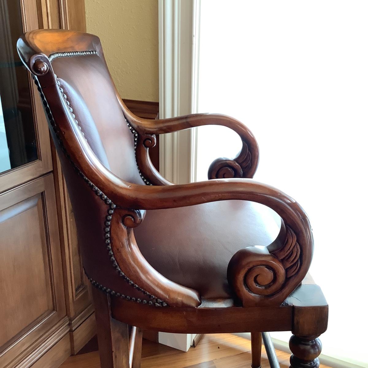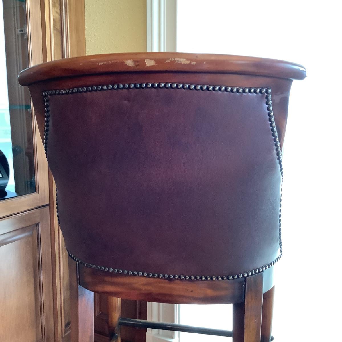 Chairs are leather with stud trim with curved arms measureing 46" high x 23" wide x 16" seat depth x 29" seat height