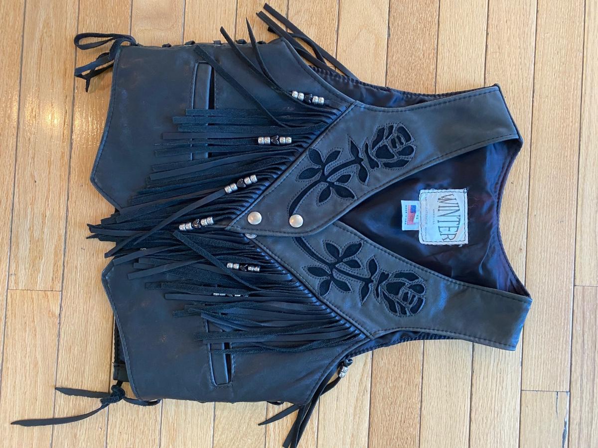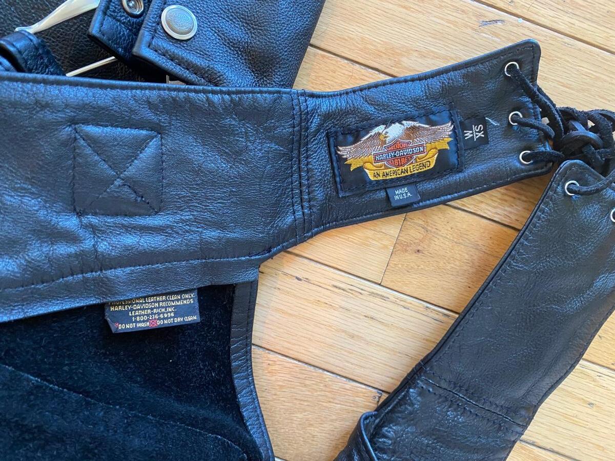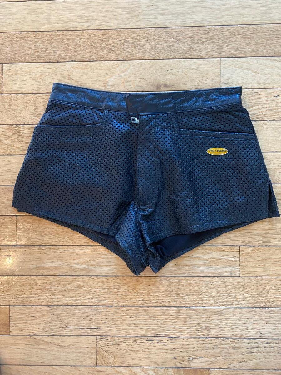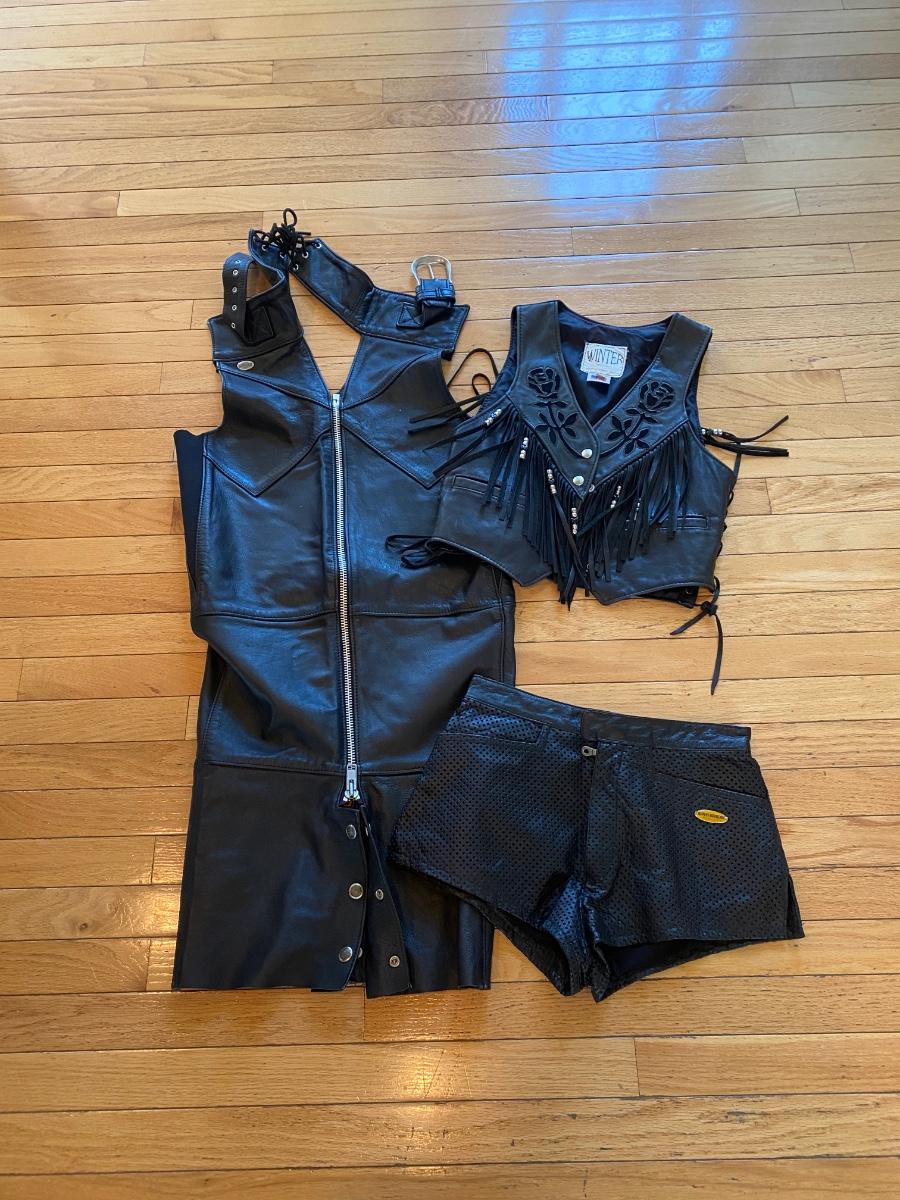 Women’s leather clothes. Women’s leather vest by Winter size small. Women’s leather shorts by Harley Davidson size 4. Women’s leather chaps by Harley Davidson size extra small.