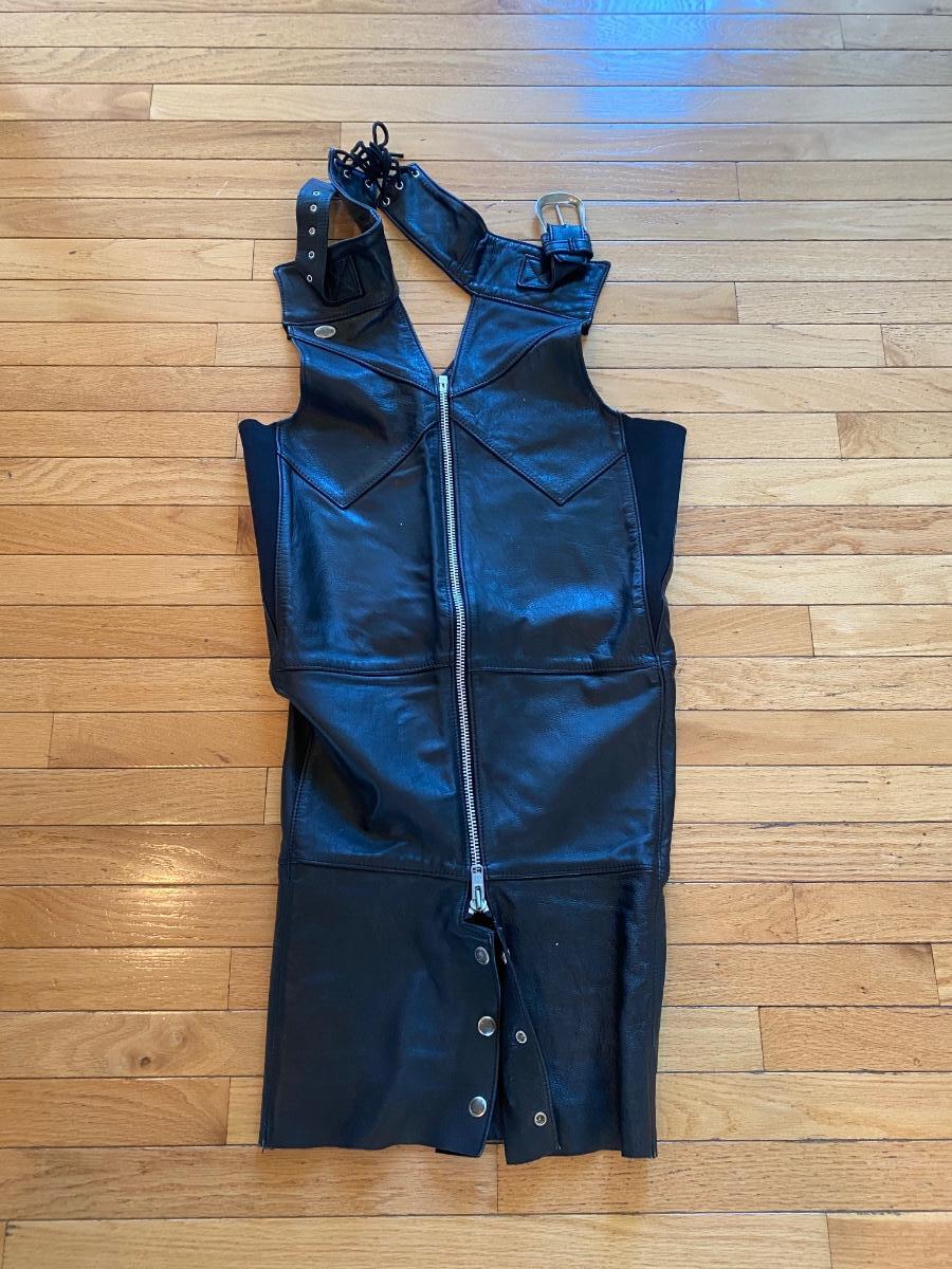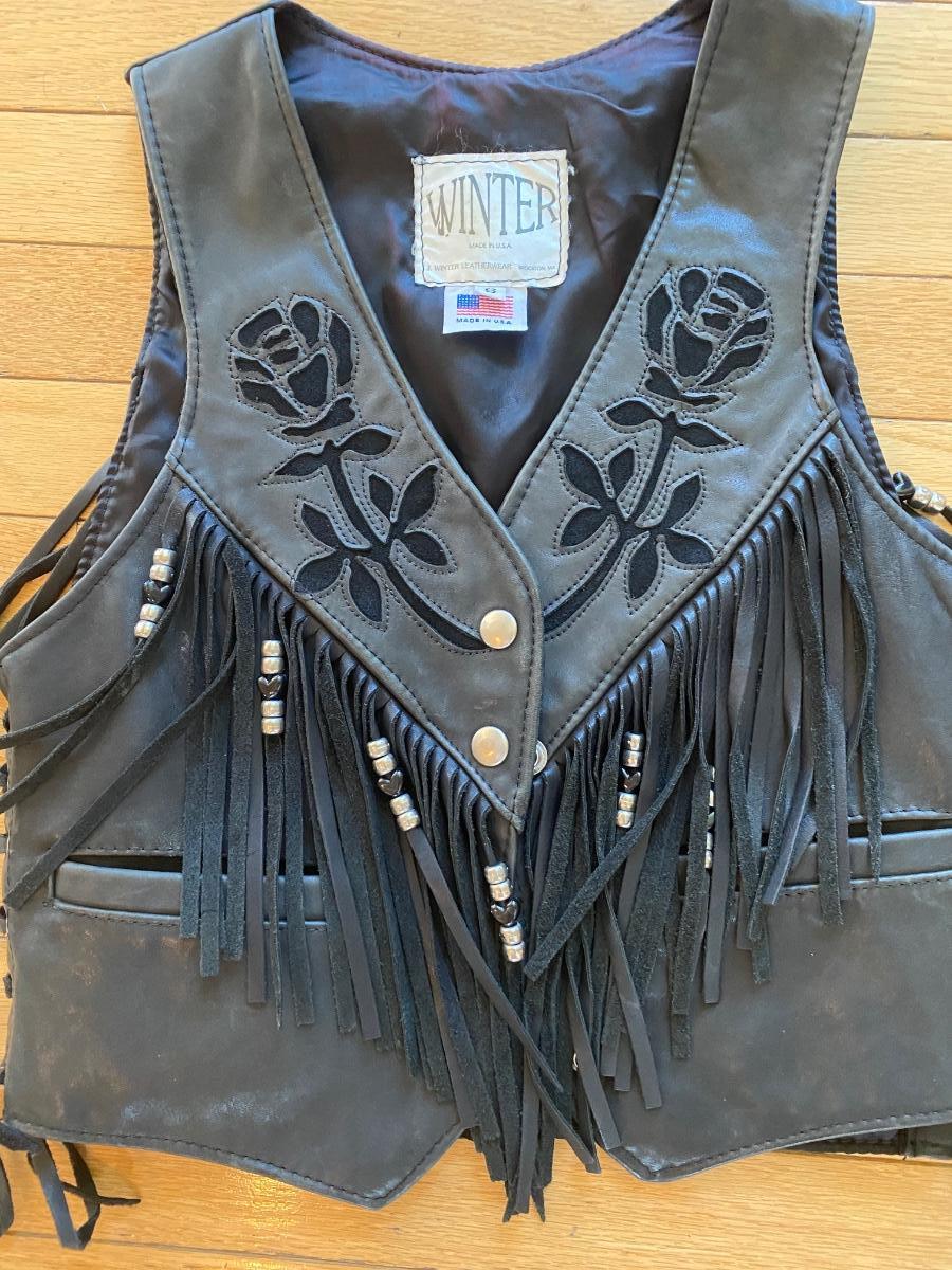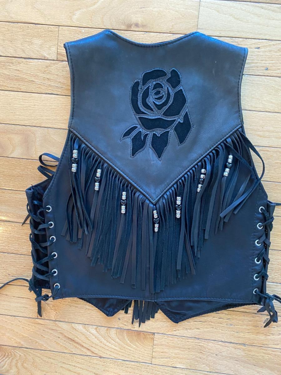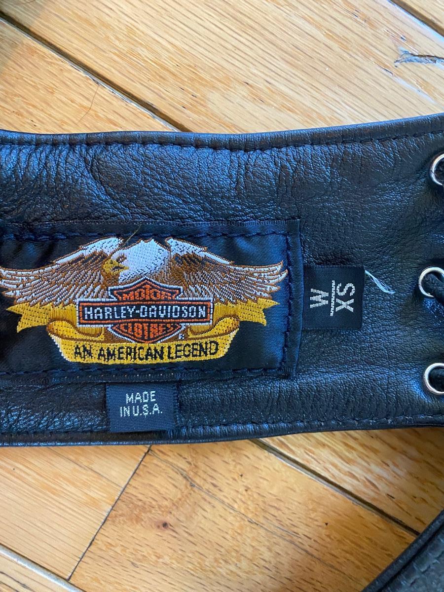 Women’s leather clothes. Women’s leather vest by Winter size small. Women’s leather shorts by Harley Davidson size 4. Women’s leather chaps by Harley Davidson size extra small.