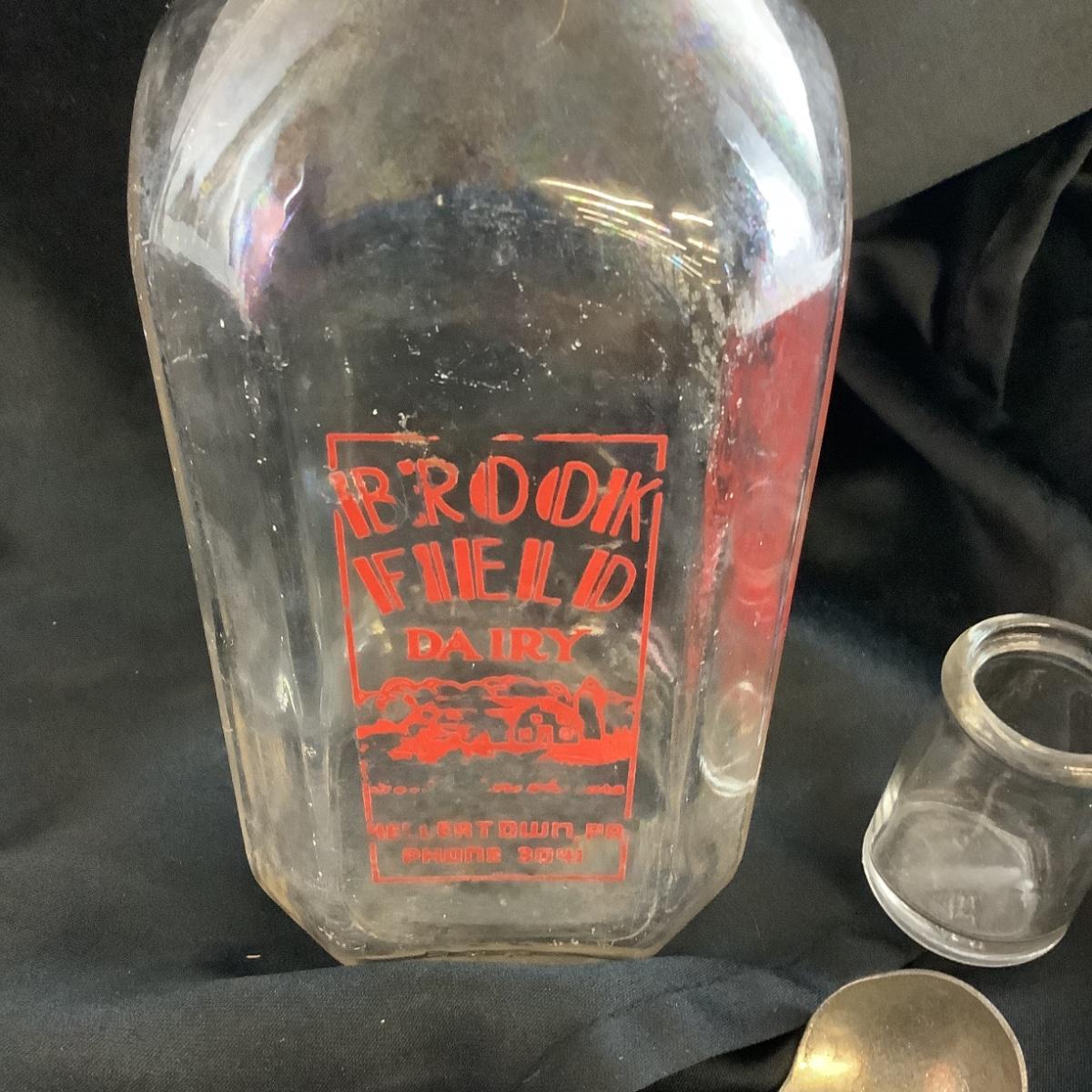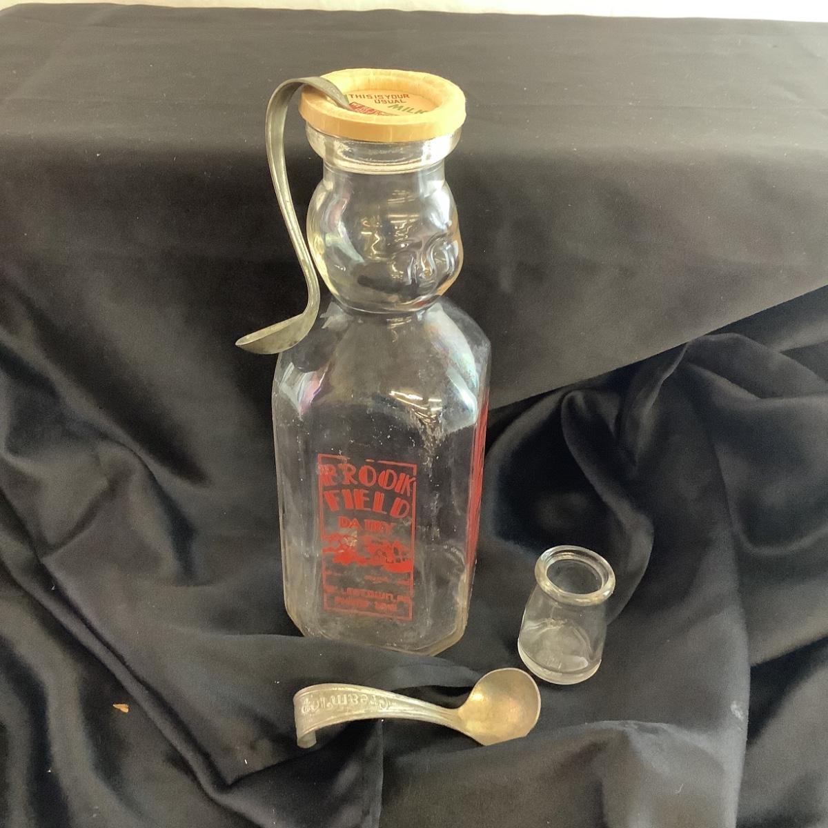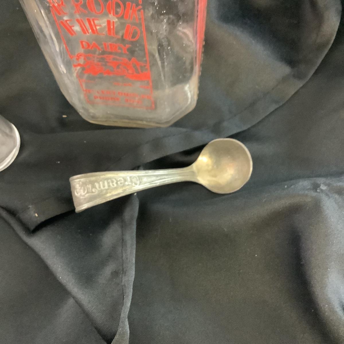 Antique Brookfield Cream Top Baby Face Milk Bottle with Creamer and Two Creamer spoons