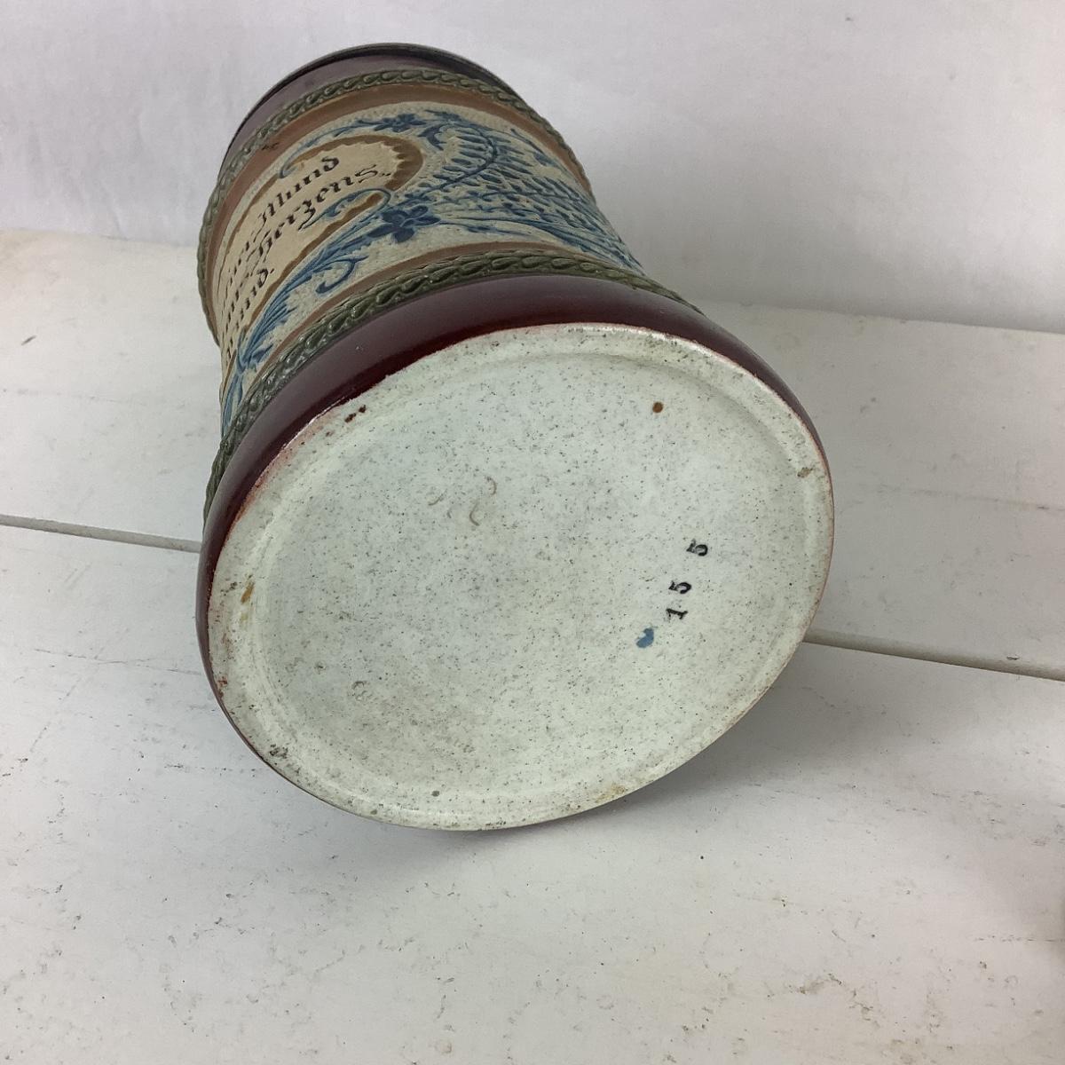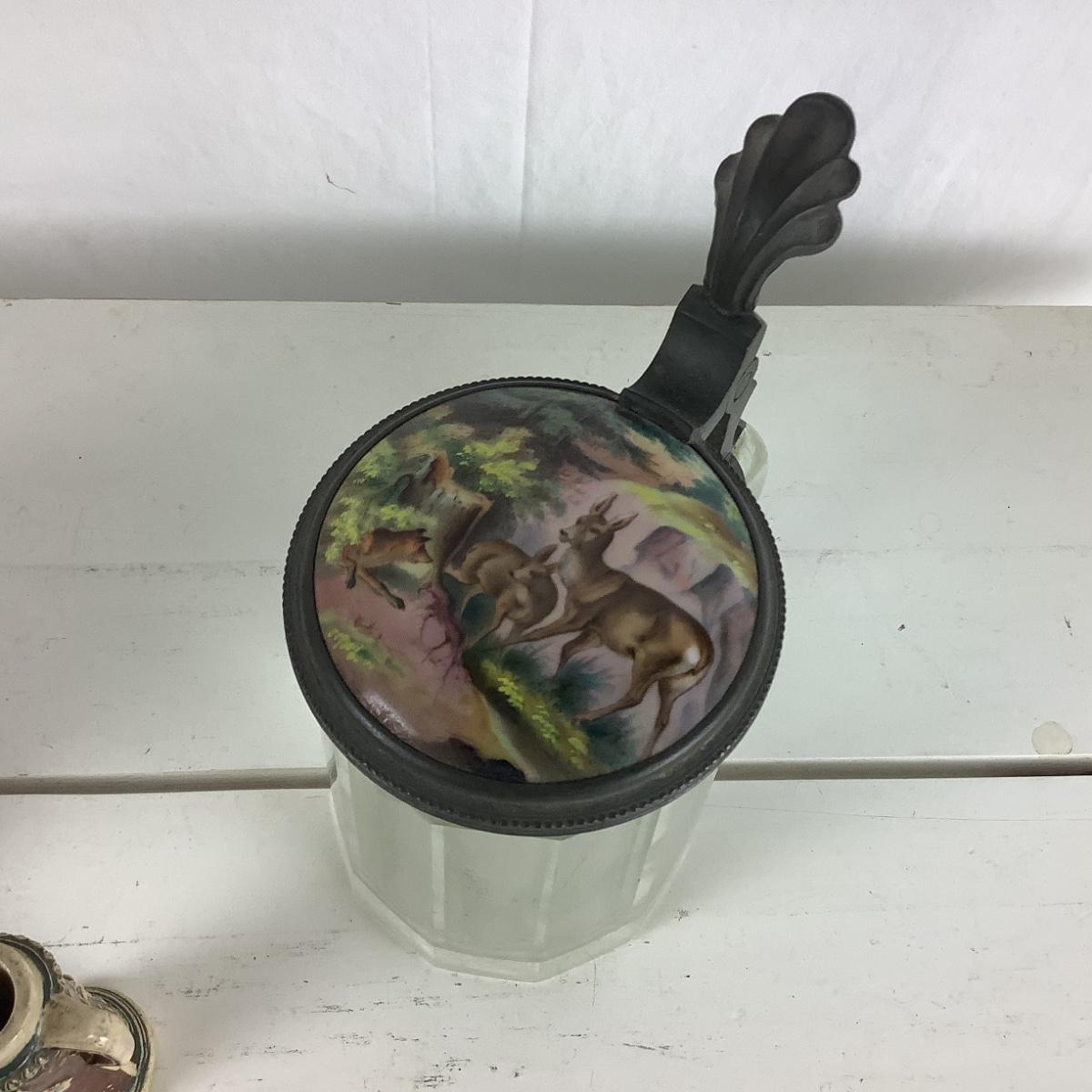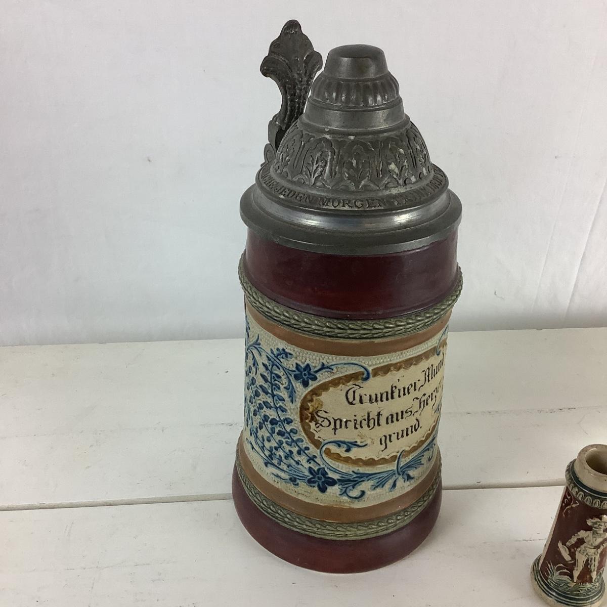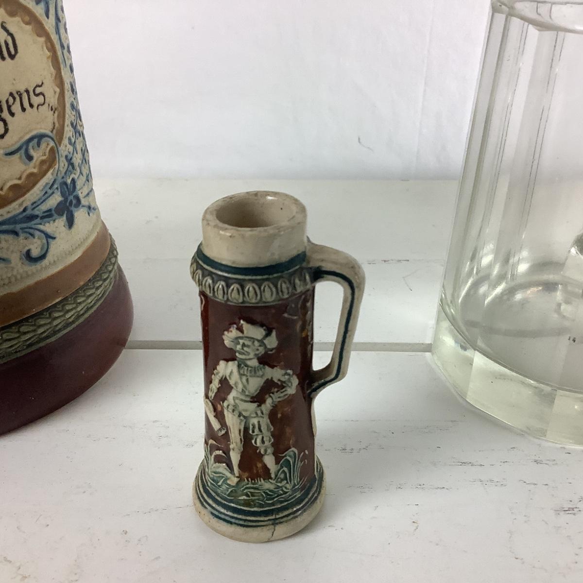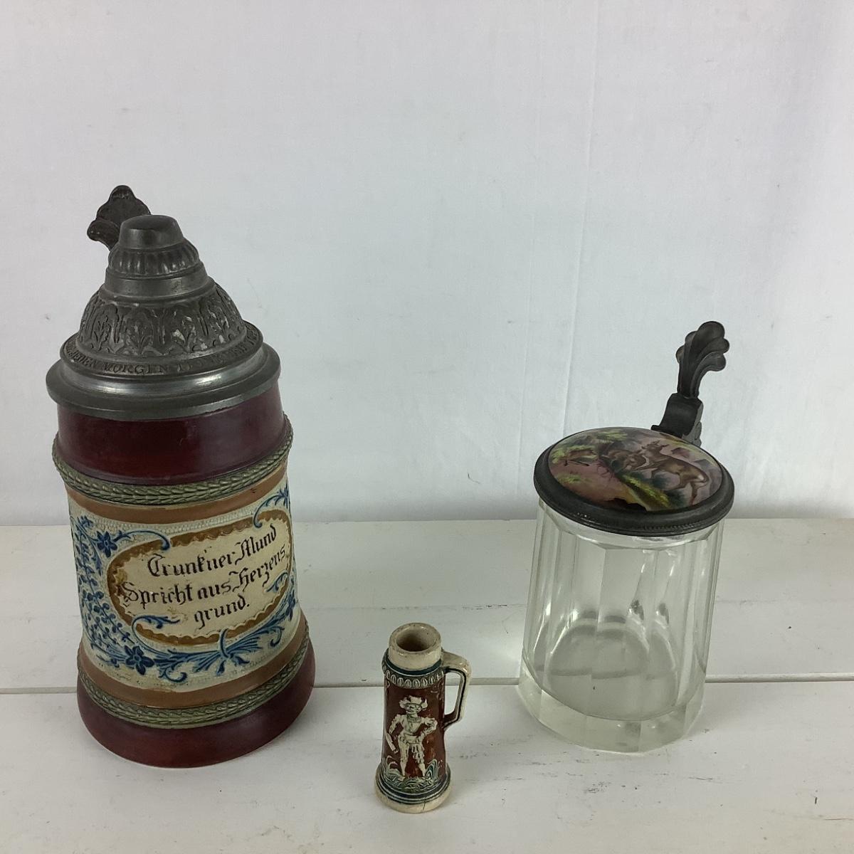 Antique pottery german stein measuring 8" high , miniature Stein, and glass stein measures 4" high