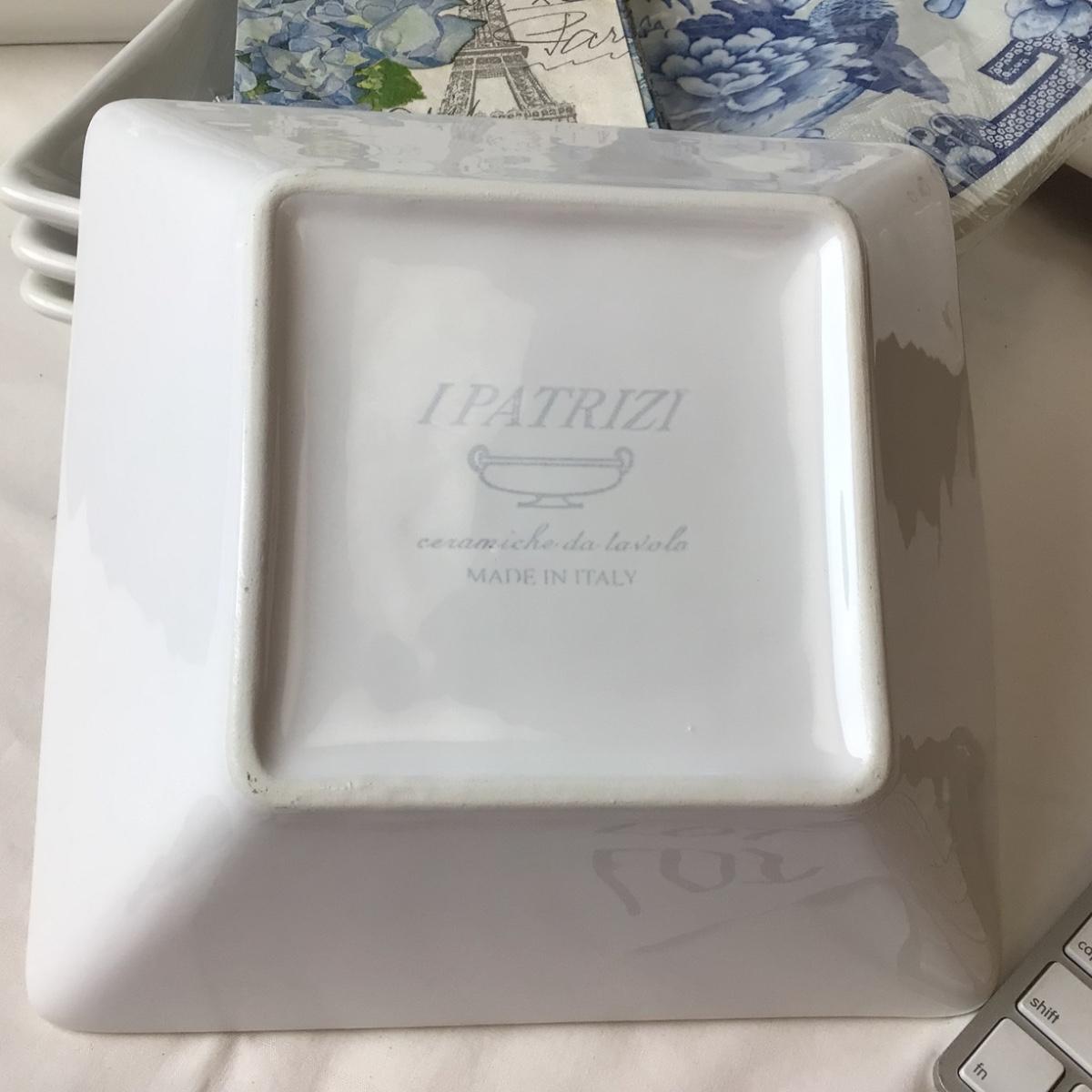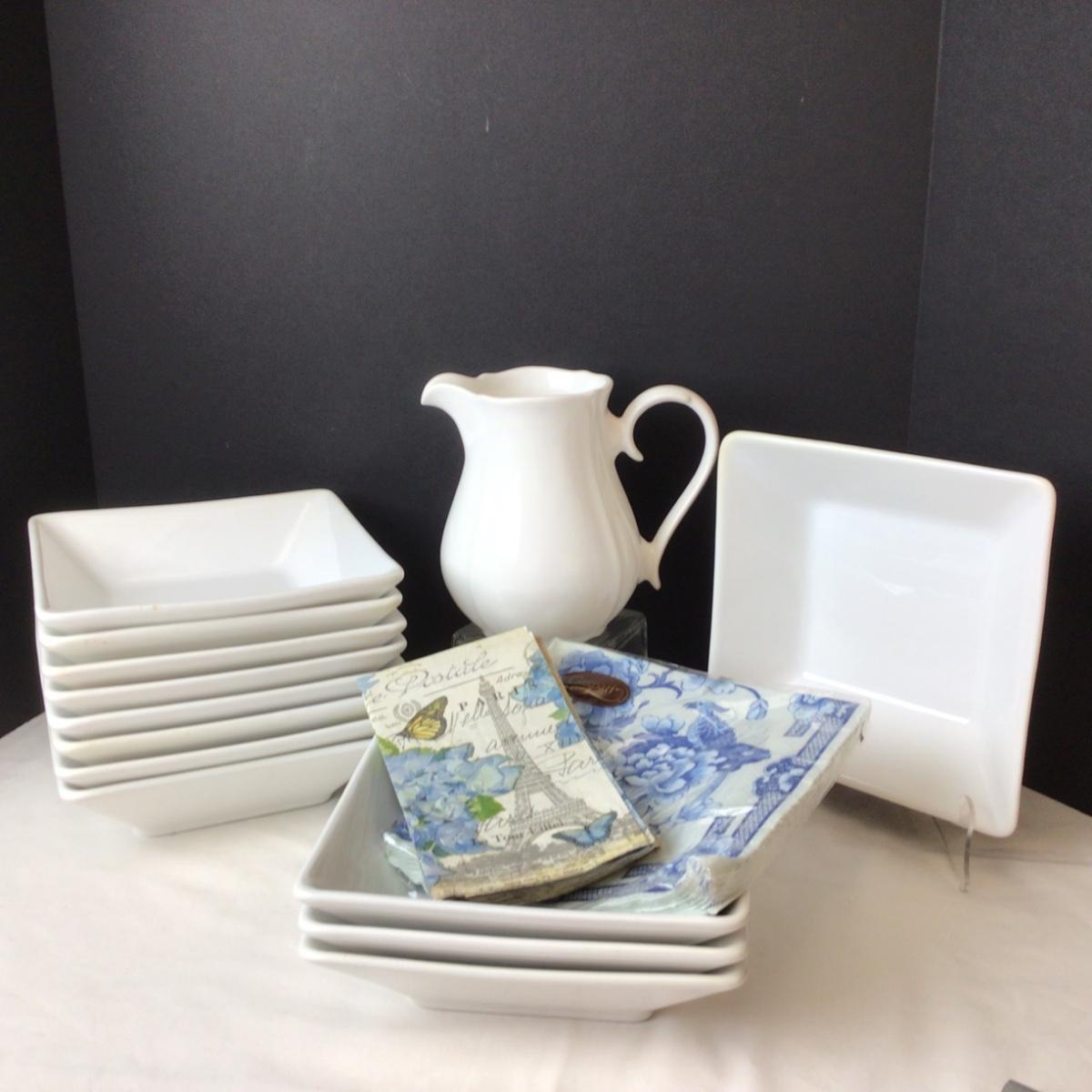 Lot contains 12 square pasta dishes with normal signs of use and wear, white ceramic pitcher and assorted napkins.