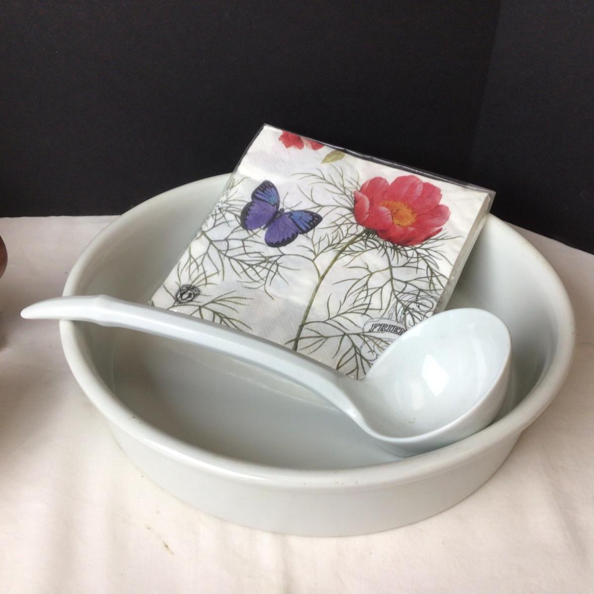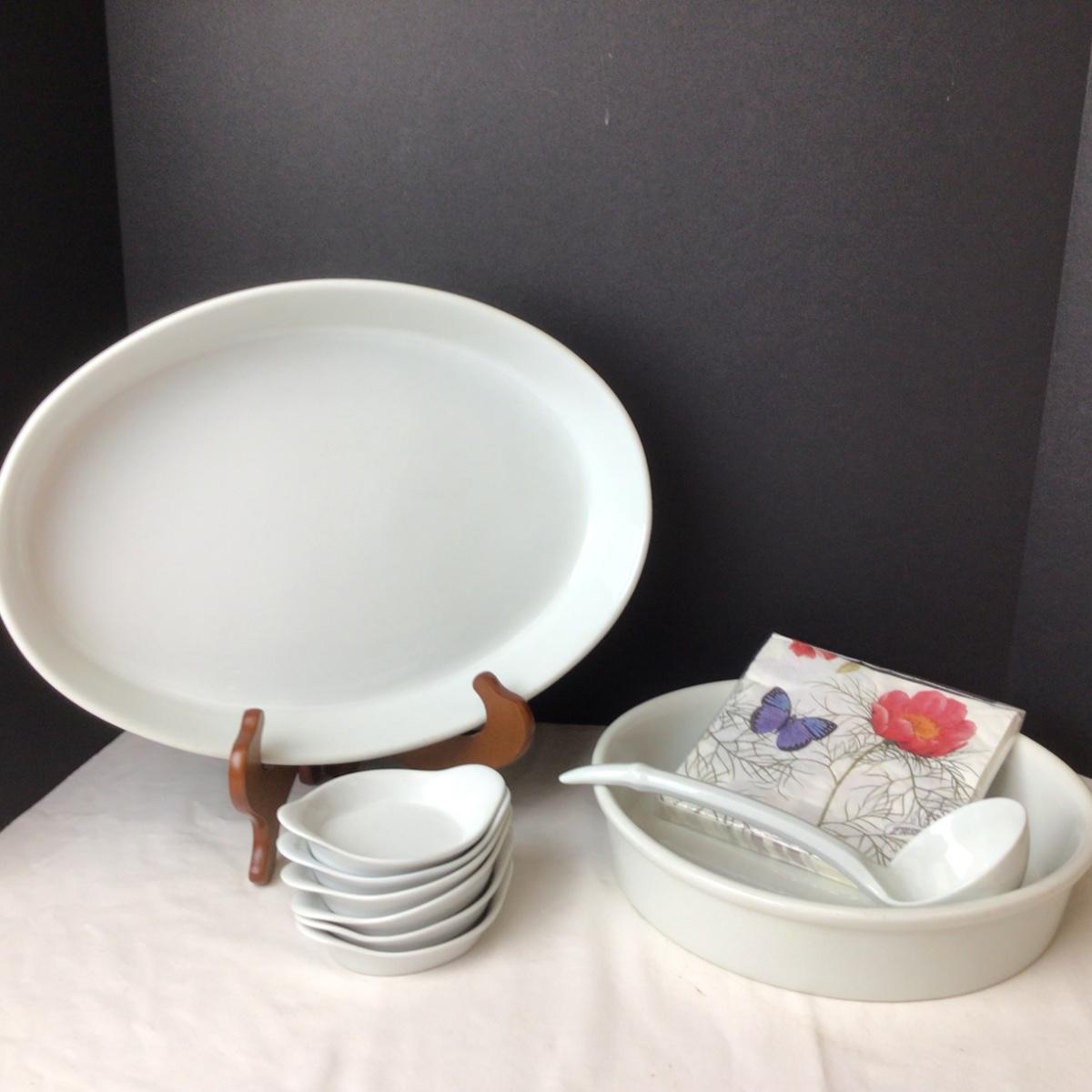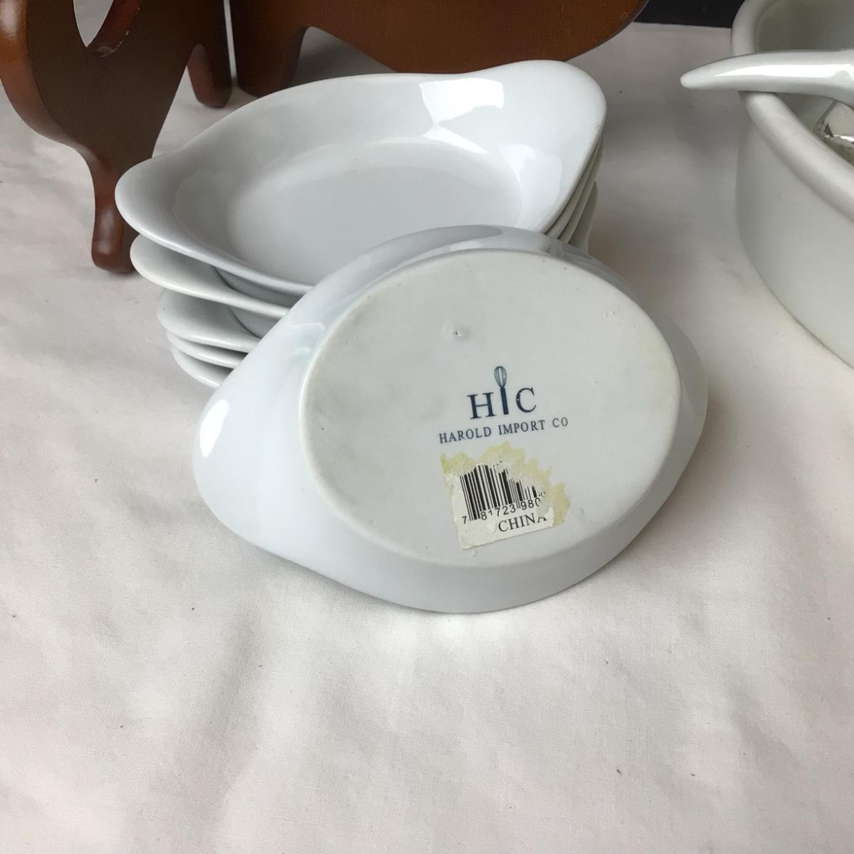There are 2 large baking dishes that measure 2.5 qt and 3 qt. There are 6 sauce side dishes that are by Harold Import Co, and more.