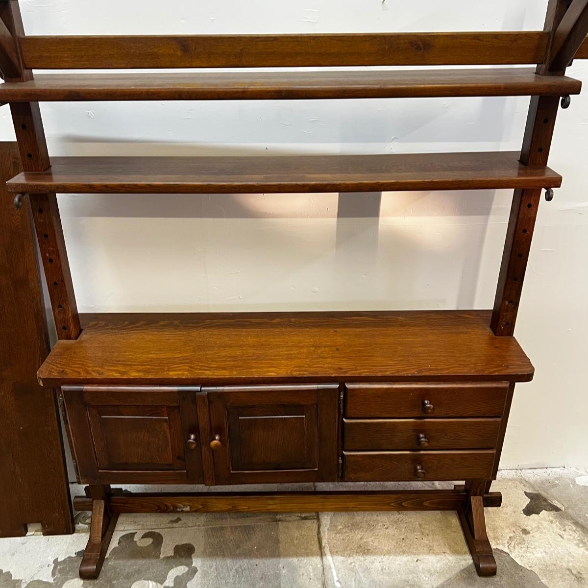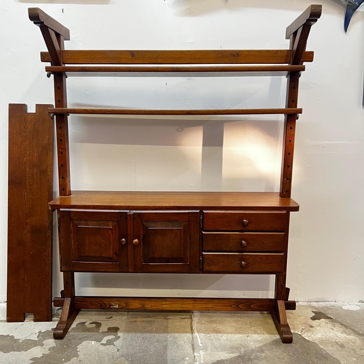 includes extra self but missing wrought iron pins , veneer missing on cabinet edges, can be taken apart and customized