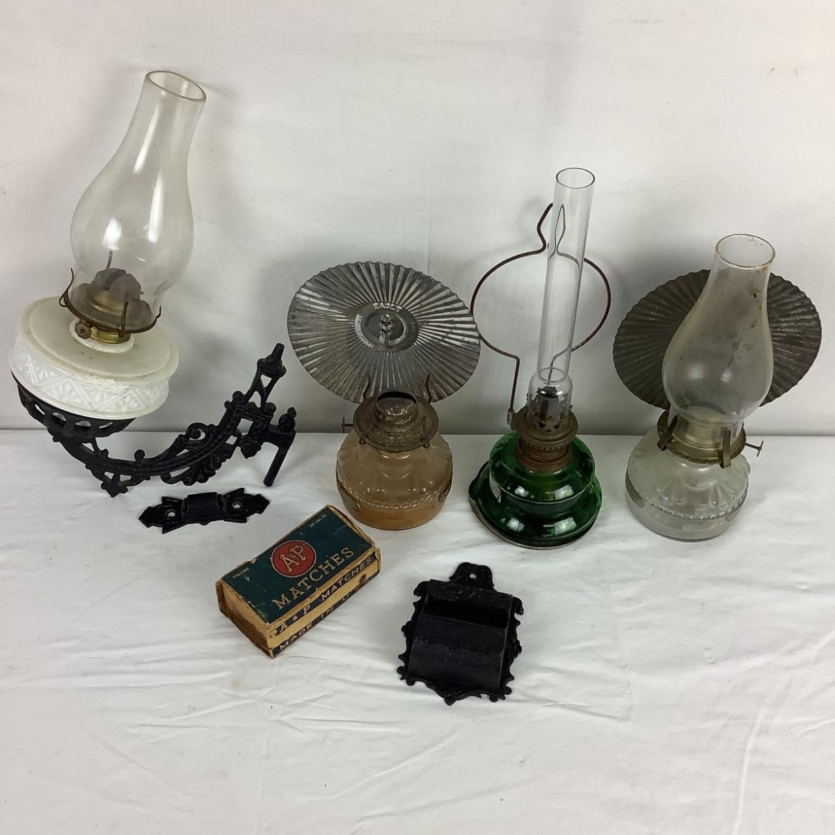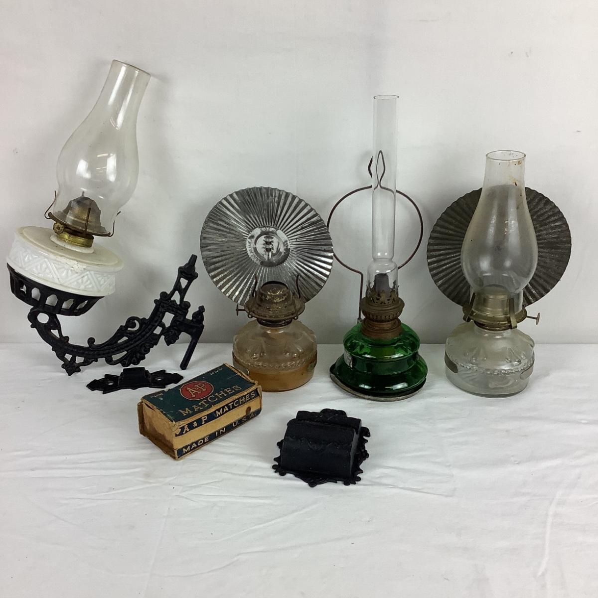 Assorted Antique Kerosine Lamps, Matches & Matches Holder.