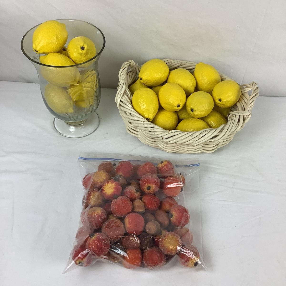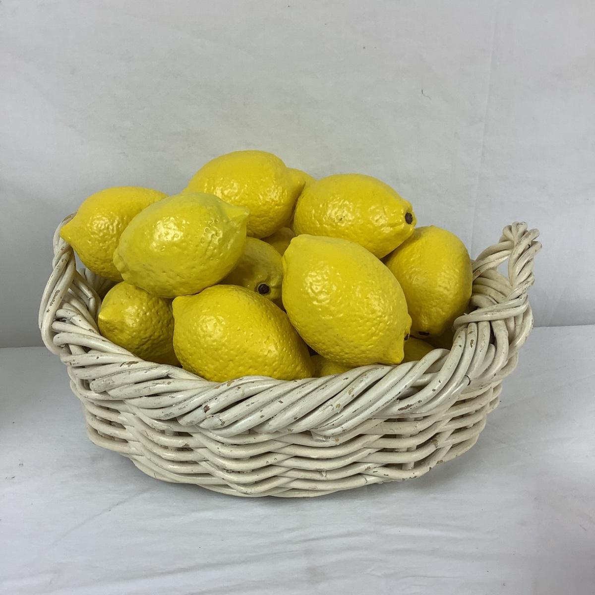 Heavy Faux Lemons & Faux Decor w/ Basket and Palm Tree Glass. 22 Lemons.