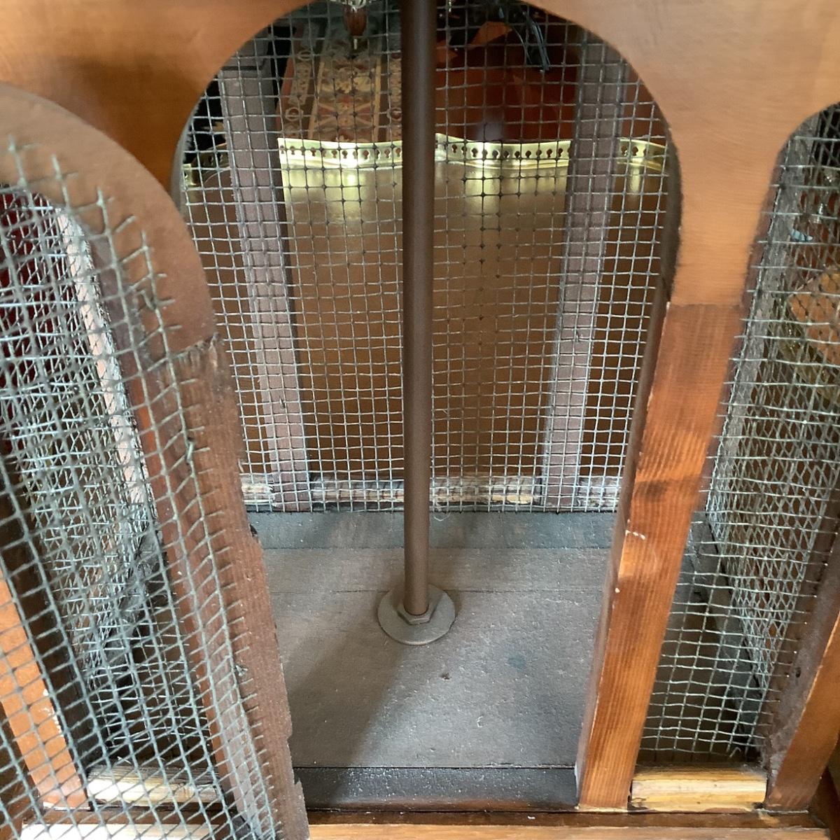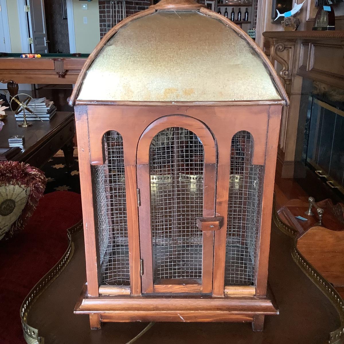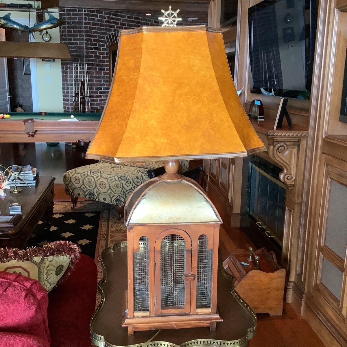 509 Vintage Wood and Metal Birdcage Lamp with Faux Leather Shade