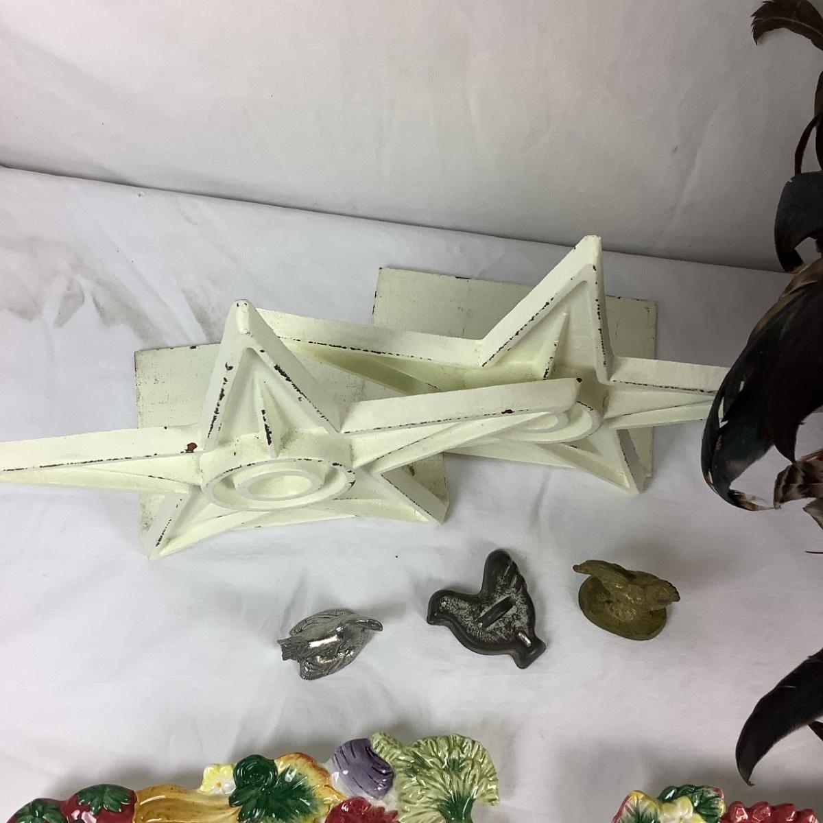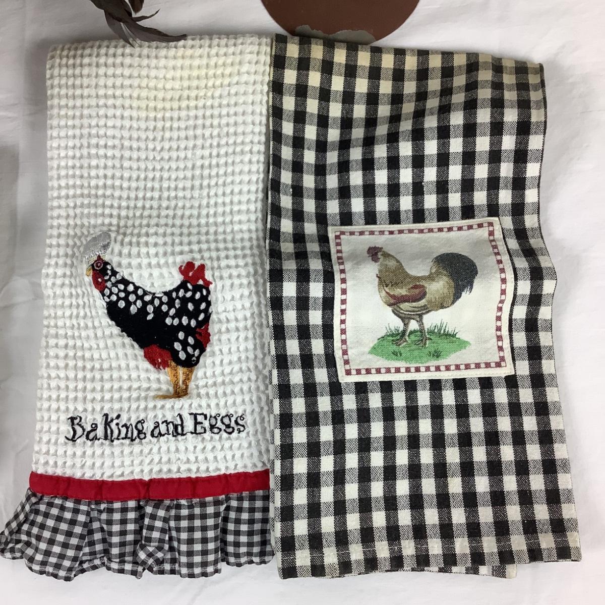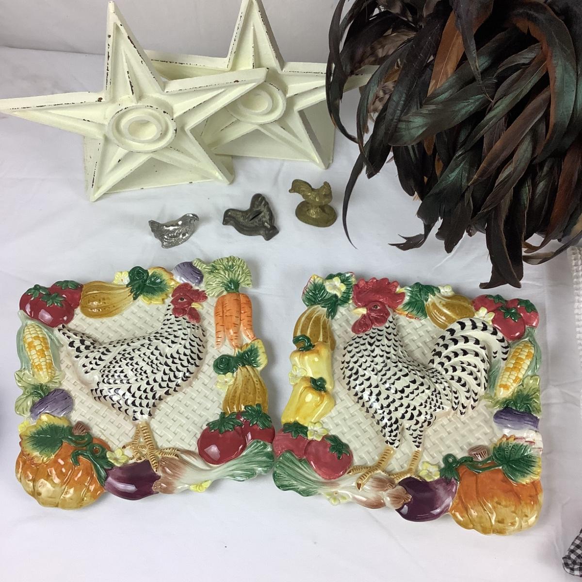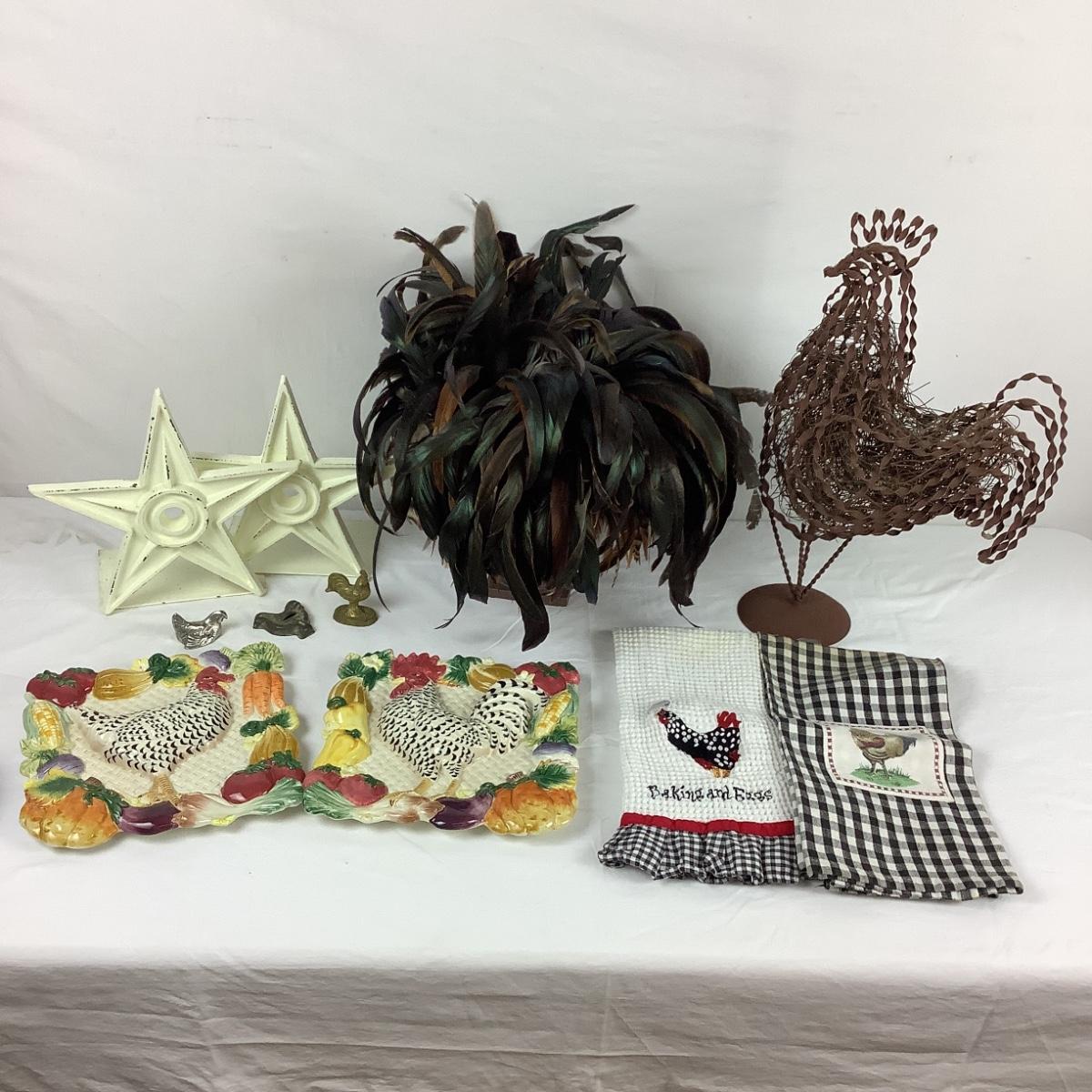 Rooster Decor Lot. 2 Hand towels, 2 Wall Plates, Star Bookends, Metal Rooster Figure, & Feathers Decor