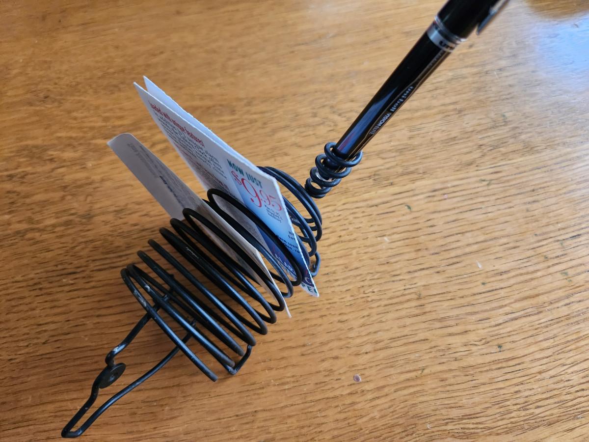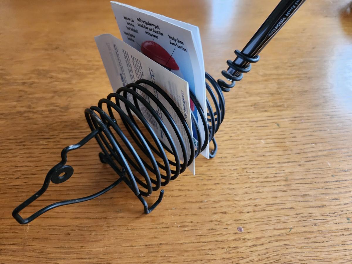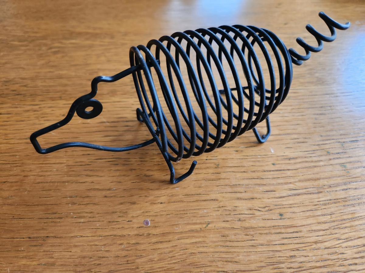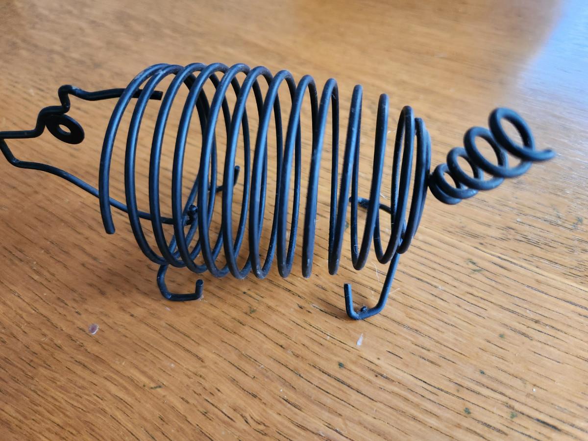 This auction lot is for a fun 50s Desk Pig. This little oinker measures about 6X3X3-inches. Made of a heavy wire and painted black. Sits on the desk and holds notes, letters and a pen. Where you gonna find this decor completer.