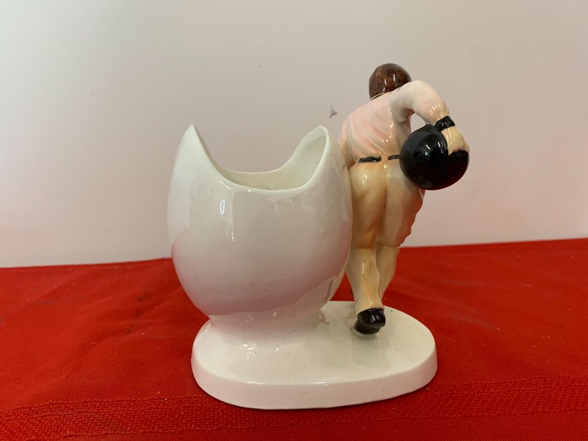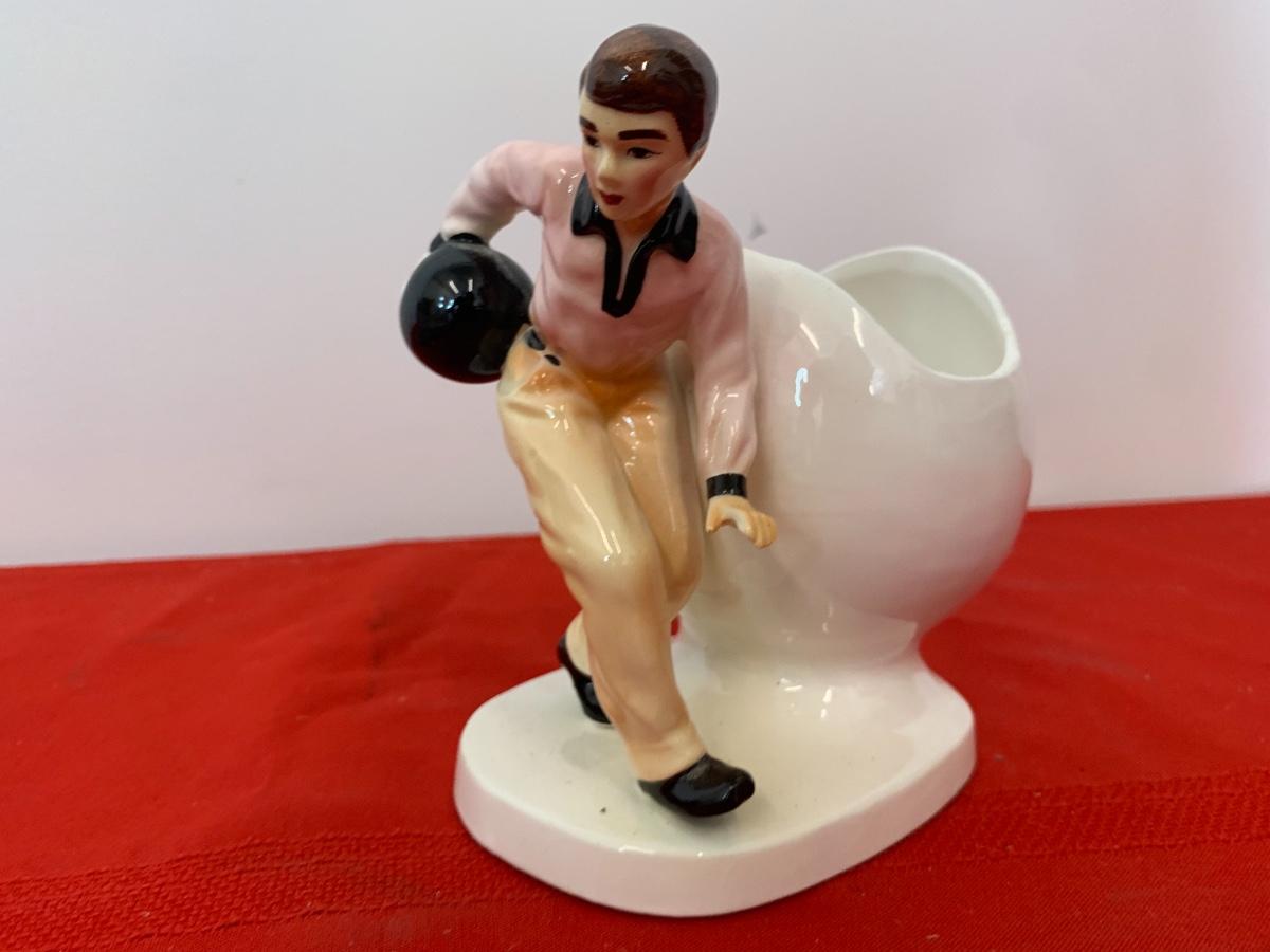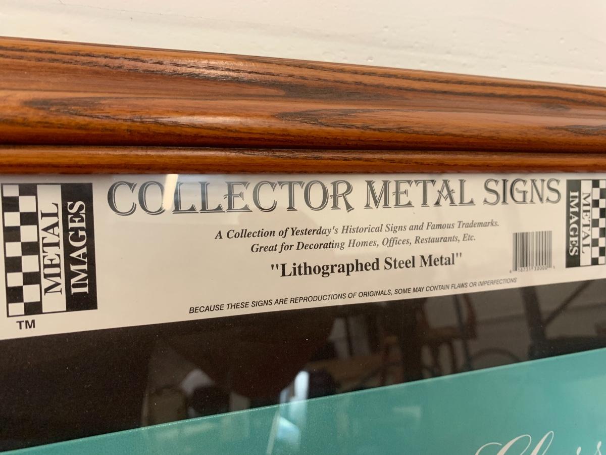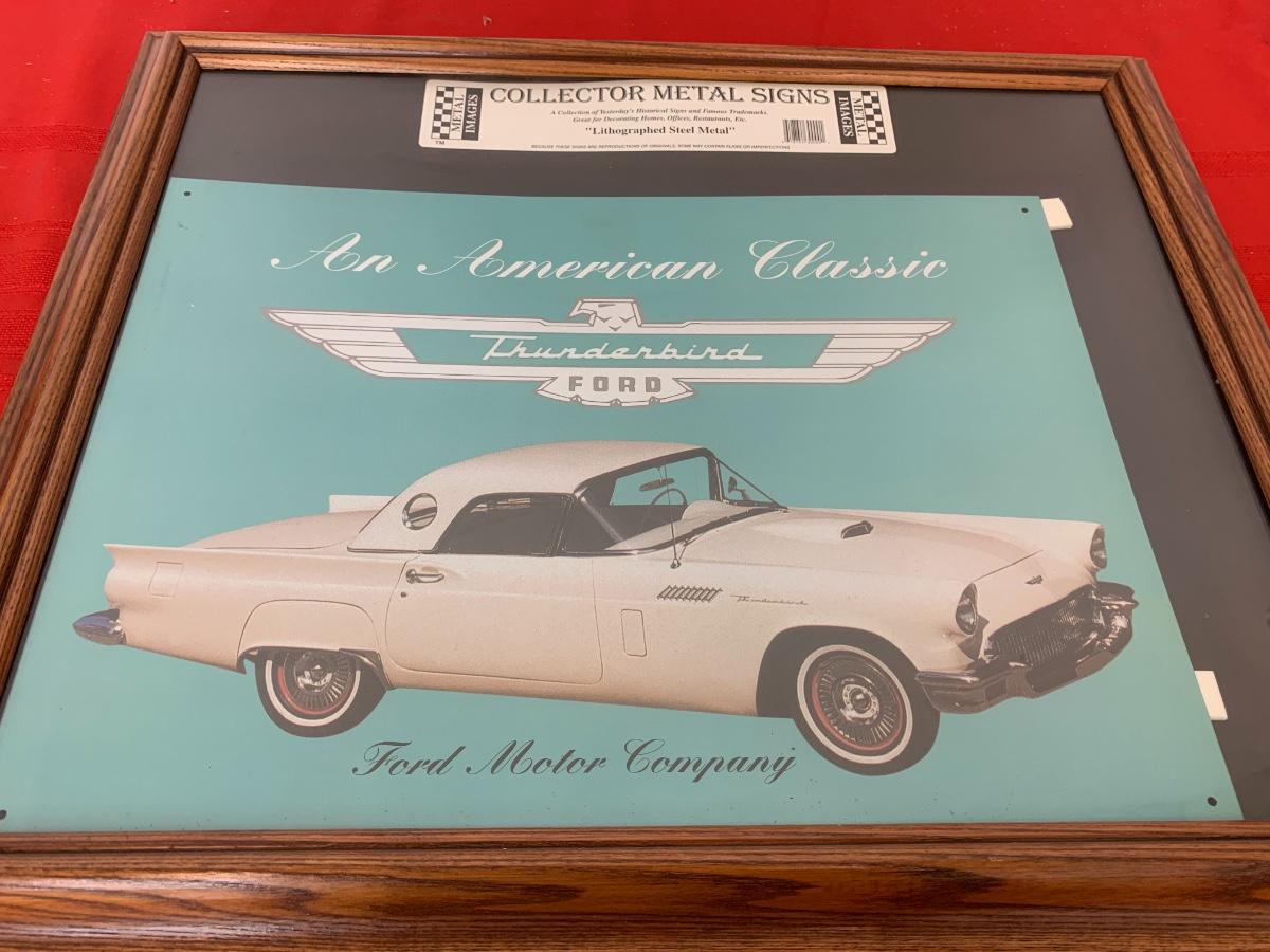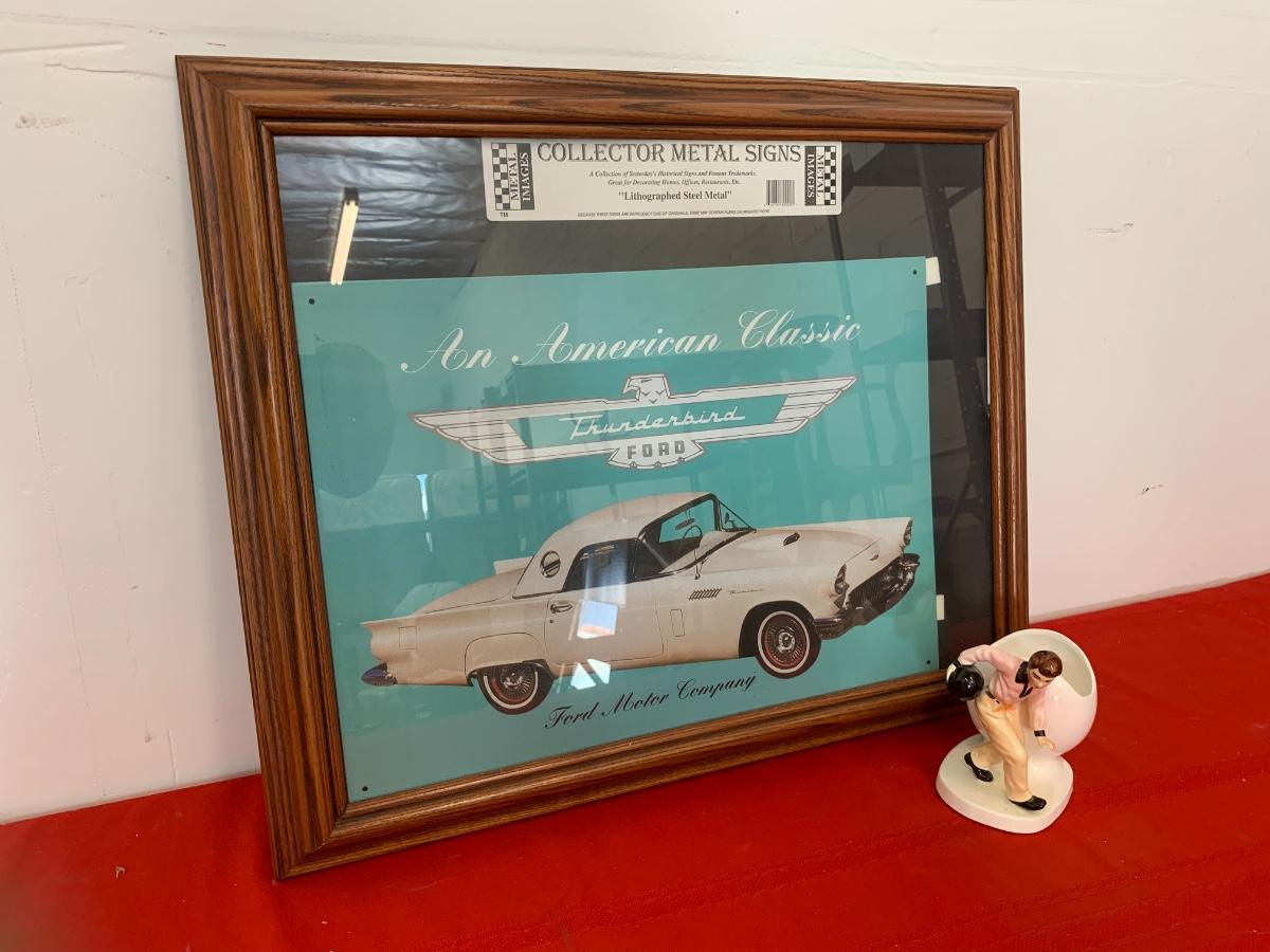 Framed collectors metal sign lithographed steal metal of a Ford Thunderbird with a bowling figurine.