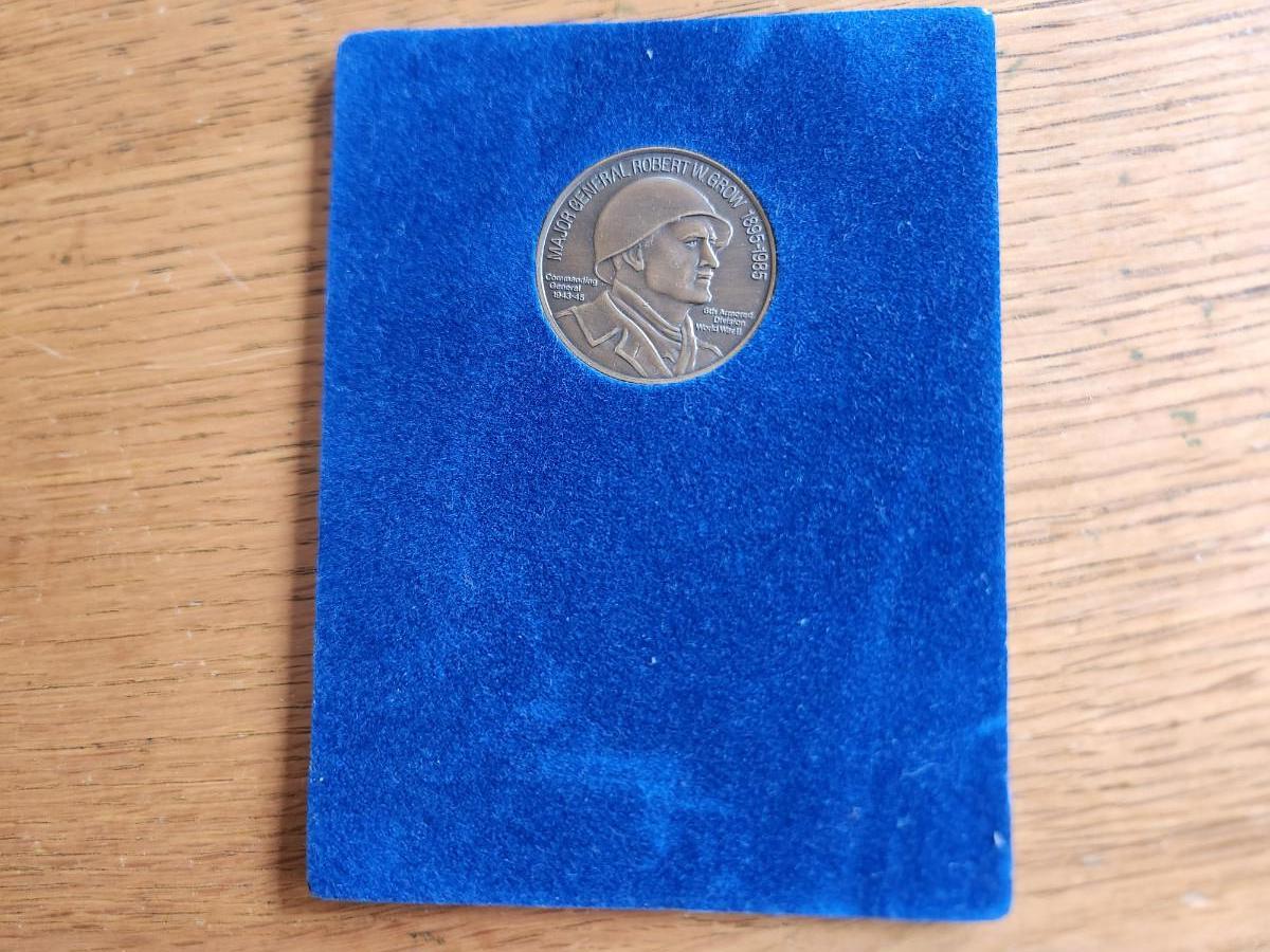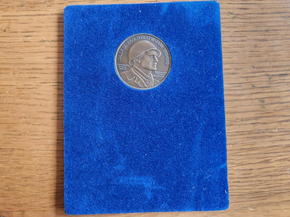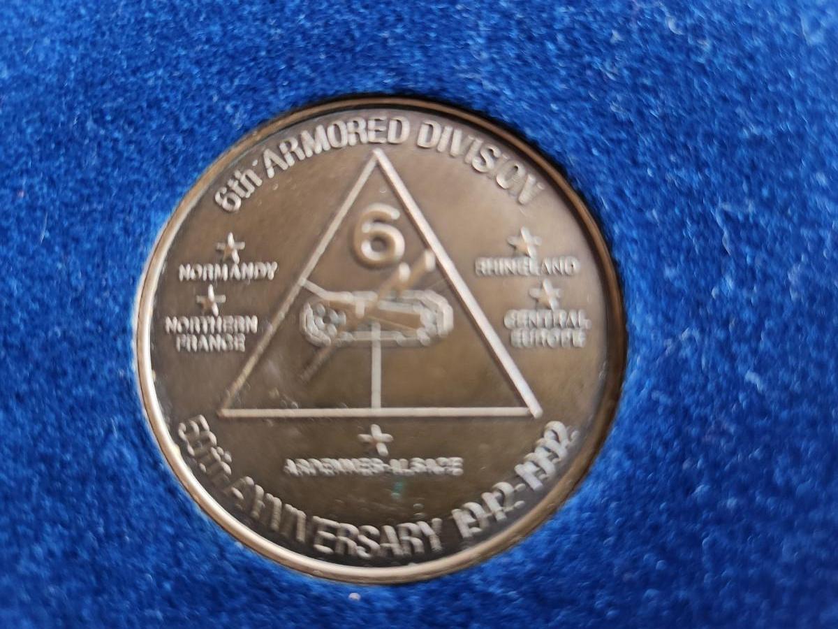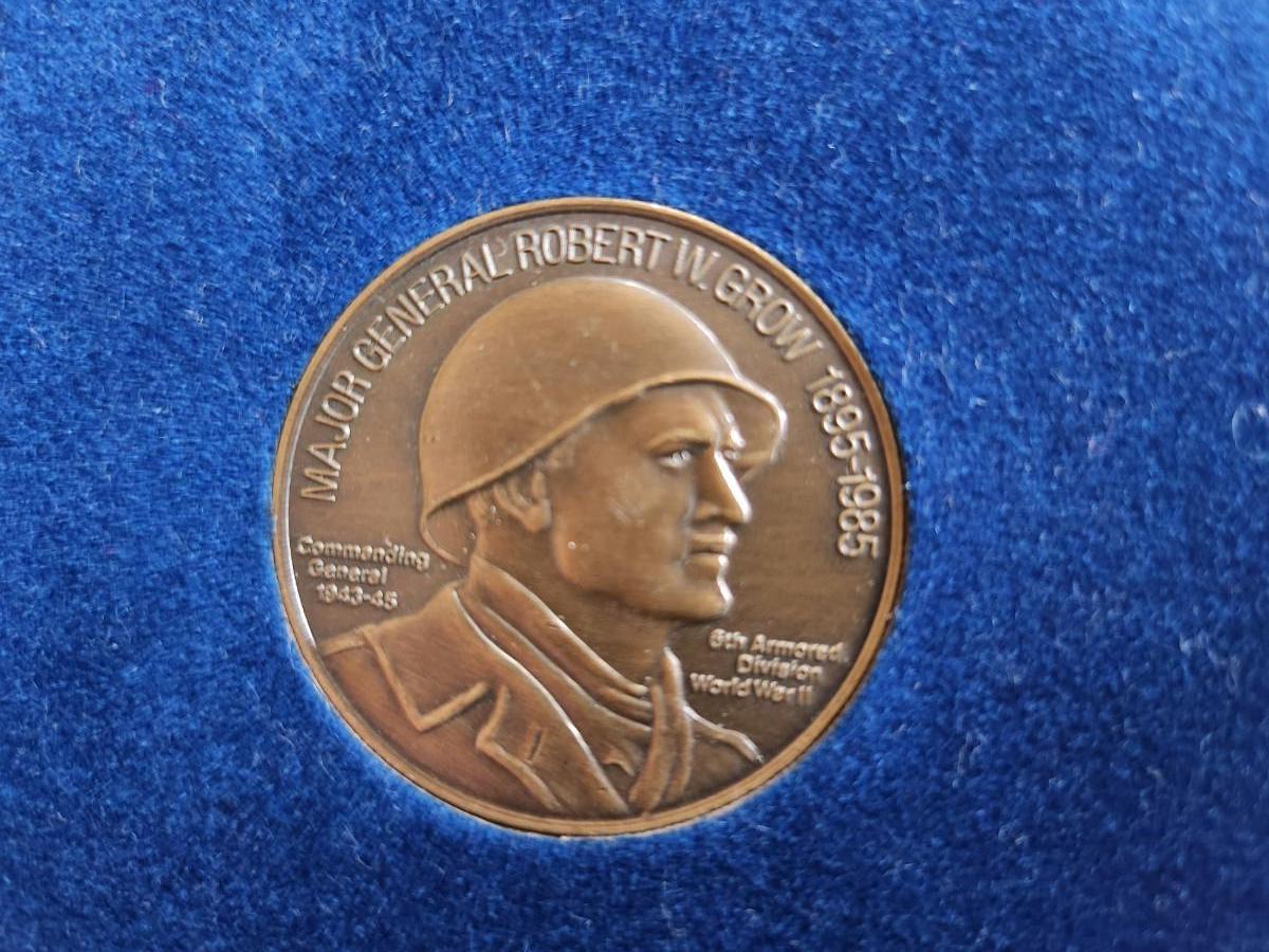 This auction lot is for a 50th Anniversary Commemorative Token for 6th Armored Division and also salutes Major General Robert Walker Grow (February 14, 1895 ““ November 3, 1985) who was a senior United States Army officer who commanded the 6th Armored Division during World War II. He was notable for his court-martial in 1951 for failing to safeguard classified information when posted in Moscow. The metal token is about 1.5-inches in diameter.