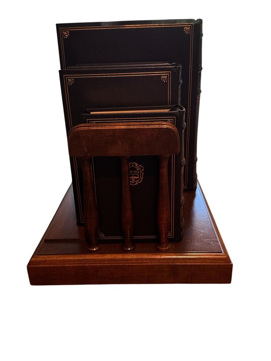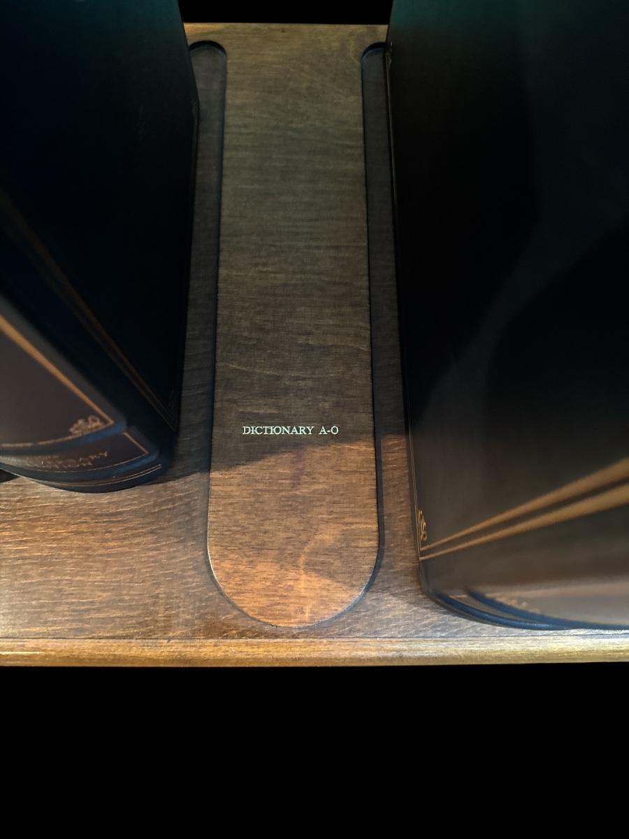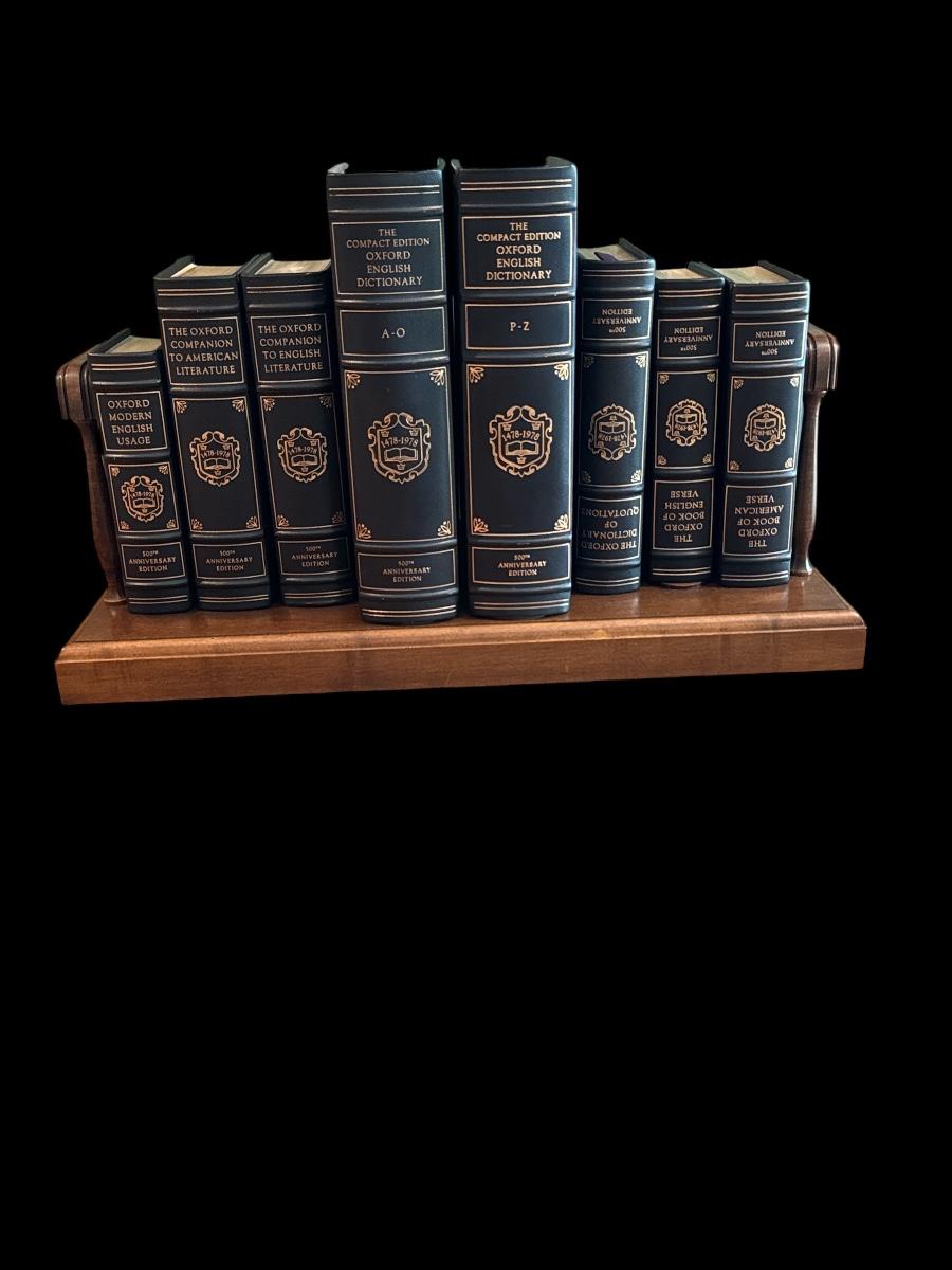 Complete set of the 50th Anniversary Compact Edition of the Oxford English Dictionary with custom wooden case. This impressive reference collection includes two main dictionary volumes (A–O and P–Z) , as well as companion volumes such as The Oxford Companion to English Literature, American Literature, Modern English Usage, and Oxford Dictionary of Quotations. Bound in elegant black with gold detailing and housed in a handsome custom wood stand with slotted dividers and spindled side supports. A collector’s treasure and a striking addition to any library or study.