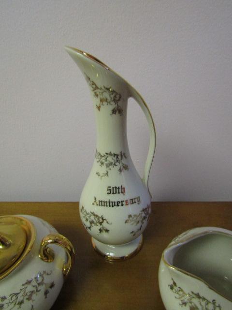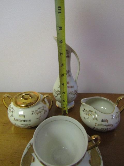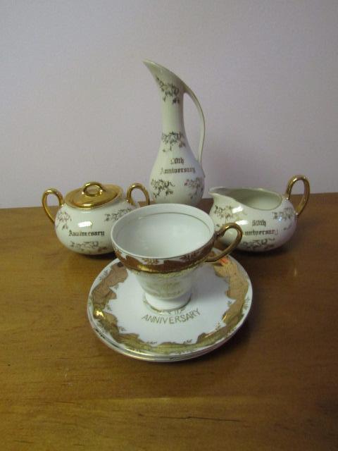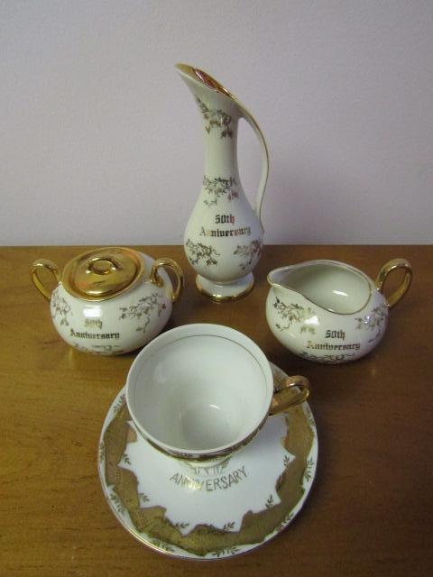 50th Anniversary Themed Chinaware. 1 cup, 2 saucers, covered sugar bowl, creamer, and cruet.