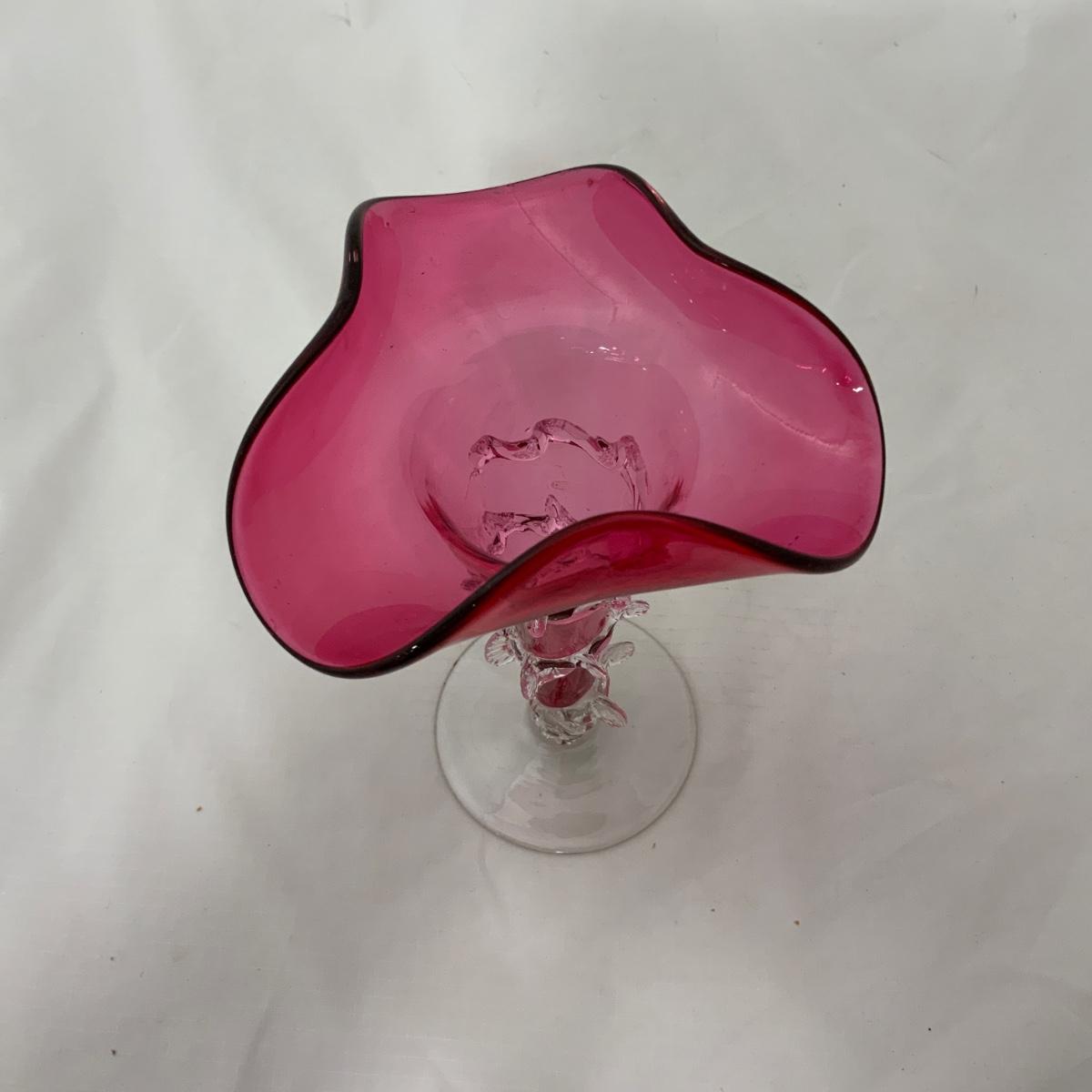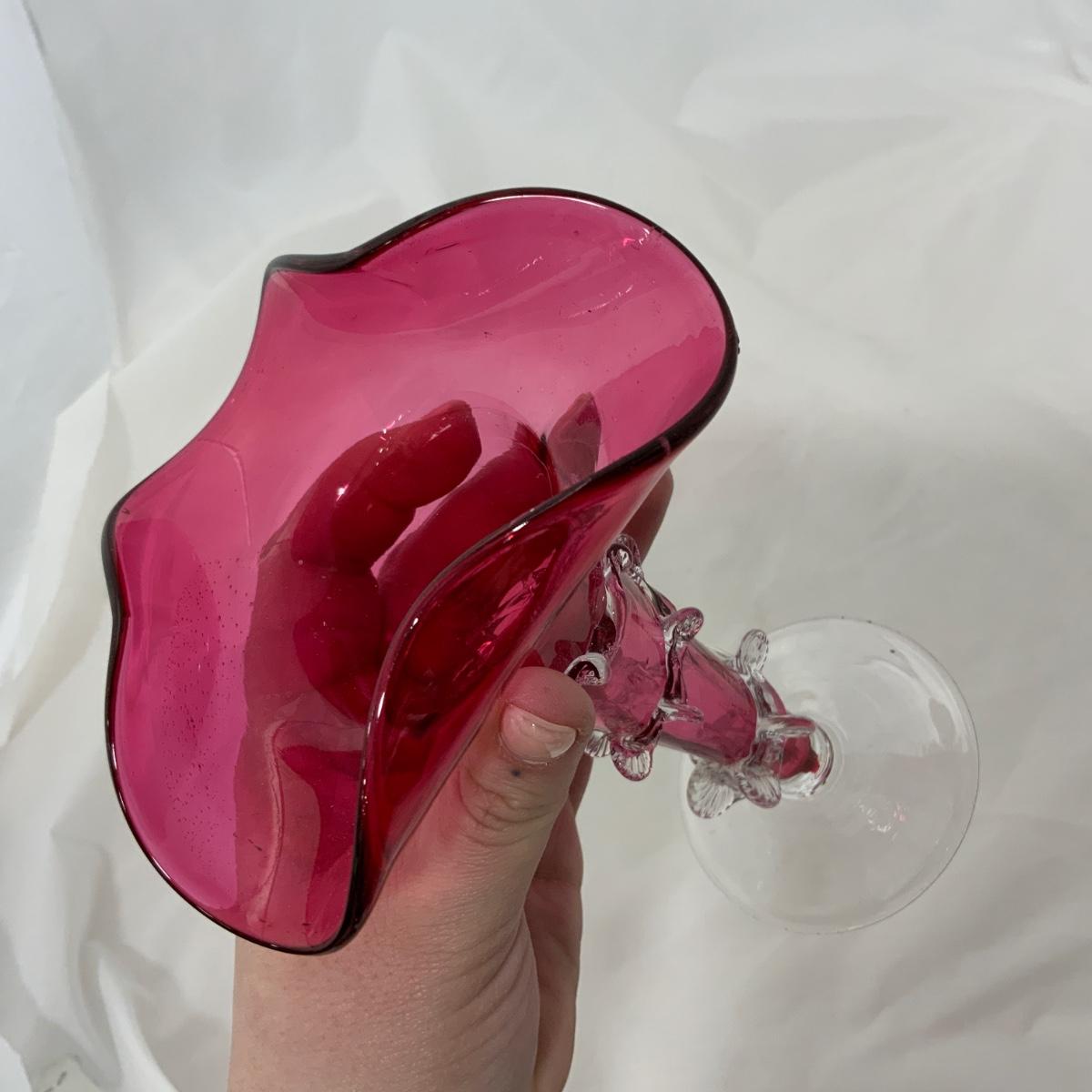 I’ve said it before, and I’ll say it again, you can’t go wrong with cranberry glass. This particular vase is really something else. The fluted top with the applied vine along the stem is gorgeous. There are some small flaws along the rim of the vase. There is a spot with extra glass and another spot where a bubble may have burst durning construction. Please see photos for details and condition. ::: Shipping is available on this lot. If you require shipping you must let us know at the close of the auction. We will coordinate with you after the item has been won. Shipping fees will include insurance up to or exceeding the value of all items being mailed. If you have any questions regarding this lot please contact the auctioneer either via this website, by direct email or by phone. PICK UP TIMES and other important information can be found in the TERMS and DESCRIPTION of the auction. Please take a look for pertinent information. Thanks!