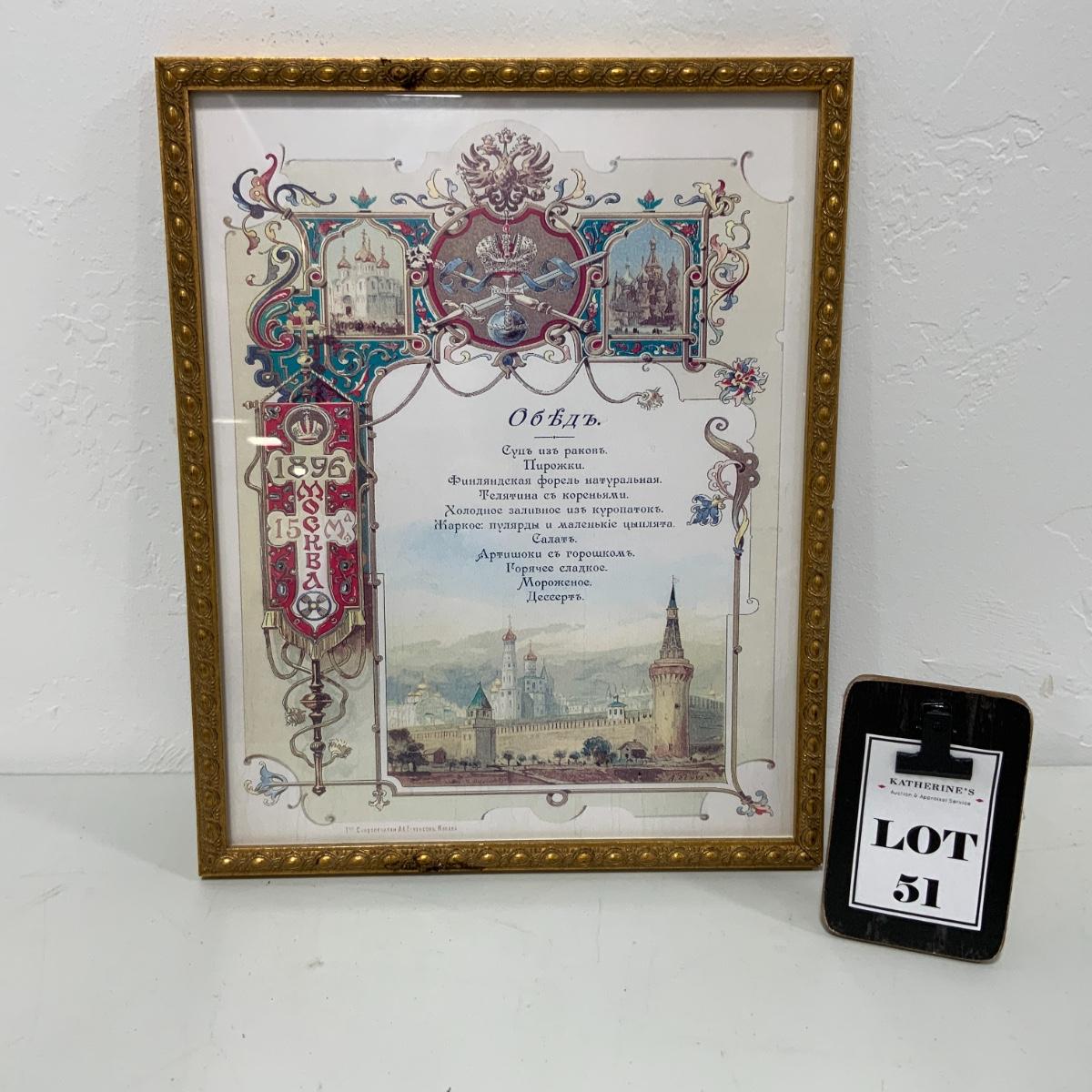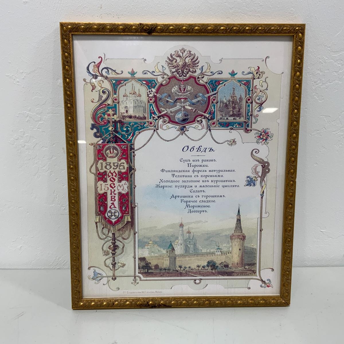 From the Estate of Peter Radovanovich: The most ornate menu that you’ve ever seen! This beautifully framed poster features pictures of the Kremlin and other beautiful buildings in Moscow. The menu consisted of Crayfish Soup, Pies, Natural Finnish Trout, Veal with root vegetables, Cold aspic from partridges, Roast poultry and small chickens. Salads, Artichokes with Peas, and sweets with ice cream for dessert. This framed piece would look incredible along side the plate in lot 15. Frame measures 14.25” x 11.5” Please see photos for details and condition. ::: Shipping is available on this lot. If you require shipping you must let us know at the close of the auction. We will coordinate with you after the item has been won. Shipping fees will include insurance up to or exceeding the value of all items being mailed. If you have any questions regarding this lot please contact the auctioneer either via this website, by direct email or by phone. PICK UP TIMES and other important information can be found in the TERMS and DESCRIPTION of the auction. Please take a look for pertinent information. Thanks!