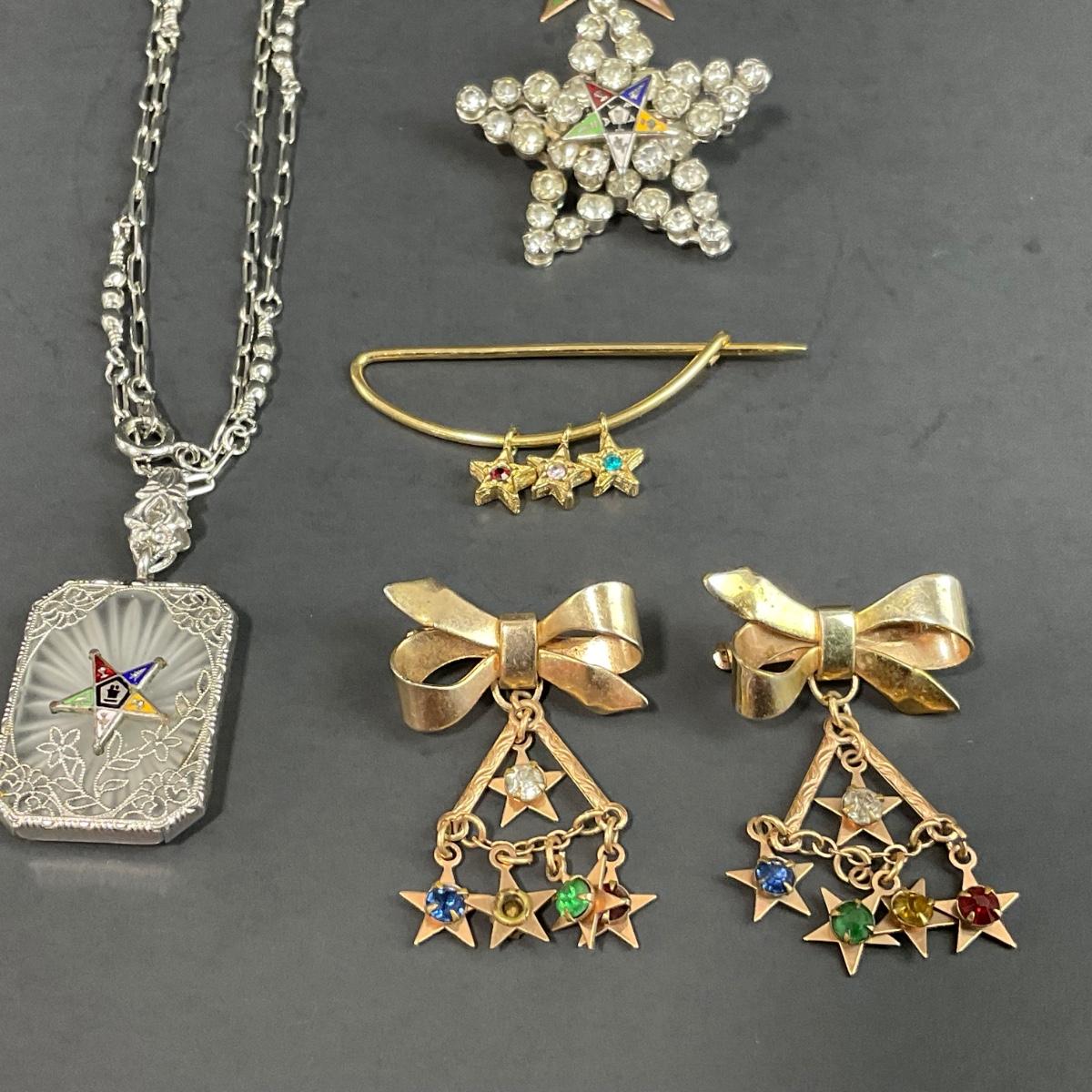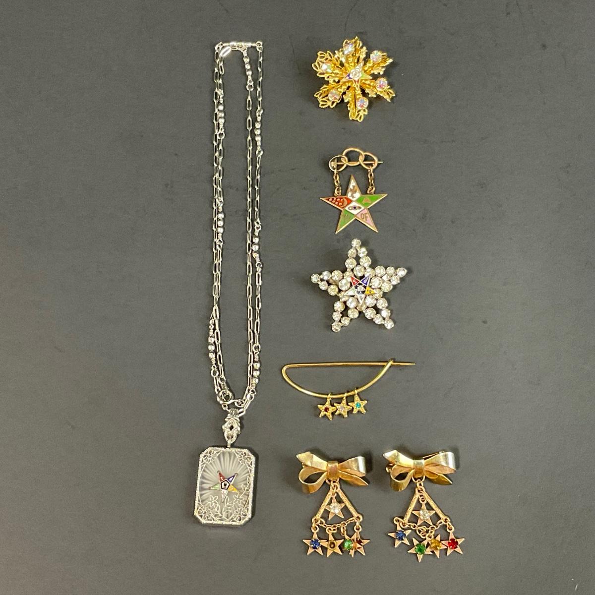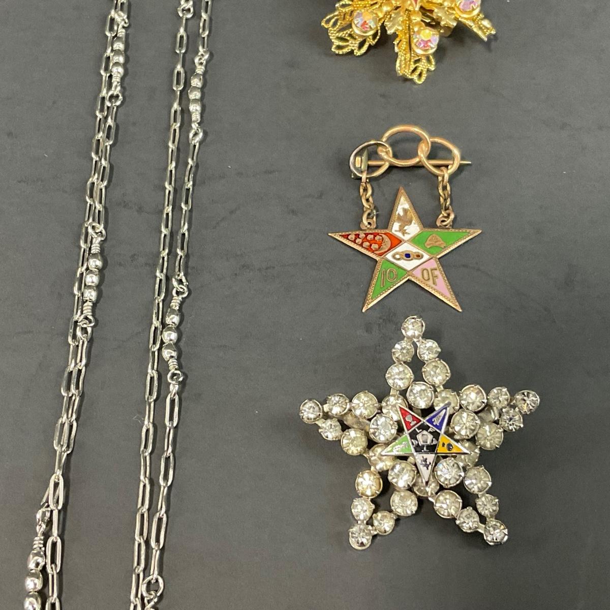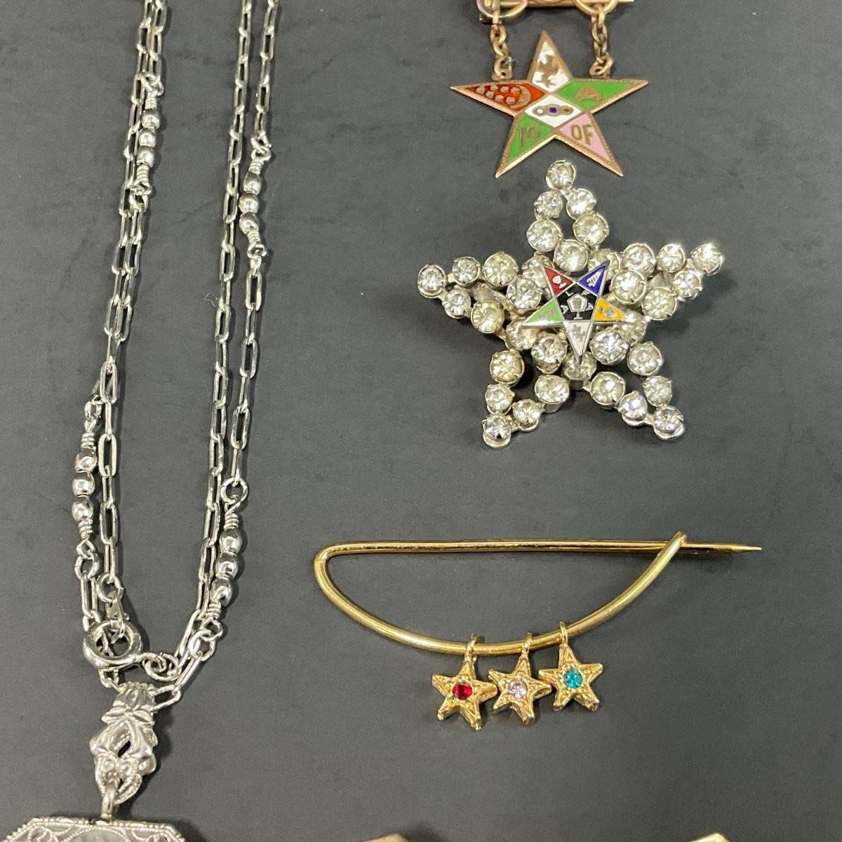 Assorted Masonic pieces including one antique Camphor glass sterling necklace, and six order of the Eastern Star Pins. Please see photos for details and condition. Any condition statement is given as a courtesy to a client, is an opinion, and should not be treated as a statement of fact. Reference to condition written, oral or within a condition report shall not be regarded as a full account of condition and may not include all defects, alterations, or restorations. Absence of a condition report does not imply a lot is flawless or lacking imperfections or damage. Katherine’s Auction & Appraisal Service shall have no responsibility for any error or omission. Returns shall not be accepted on the basis of condition. ::: Shipping is available on this lot. If you require shipping you must let us know at the close of the auction. We will coordinate with you after the item has been won. Shipping fees will include insurance up to or exceeding the value of all items being mailed. If you have any questions regarding this lot please contact the auctioneer either via this website, by direct email or by phone. PICK UP TIMES and other important information can be found in the TERMS and DESCRIPTION of the auction. Please take a look for pertinent information. Thanks!