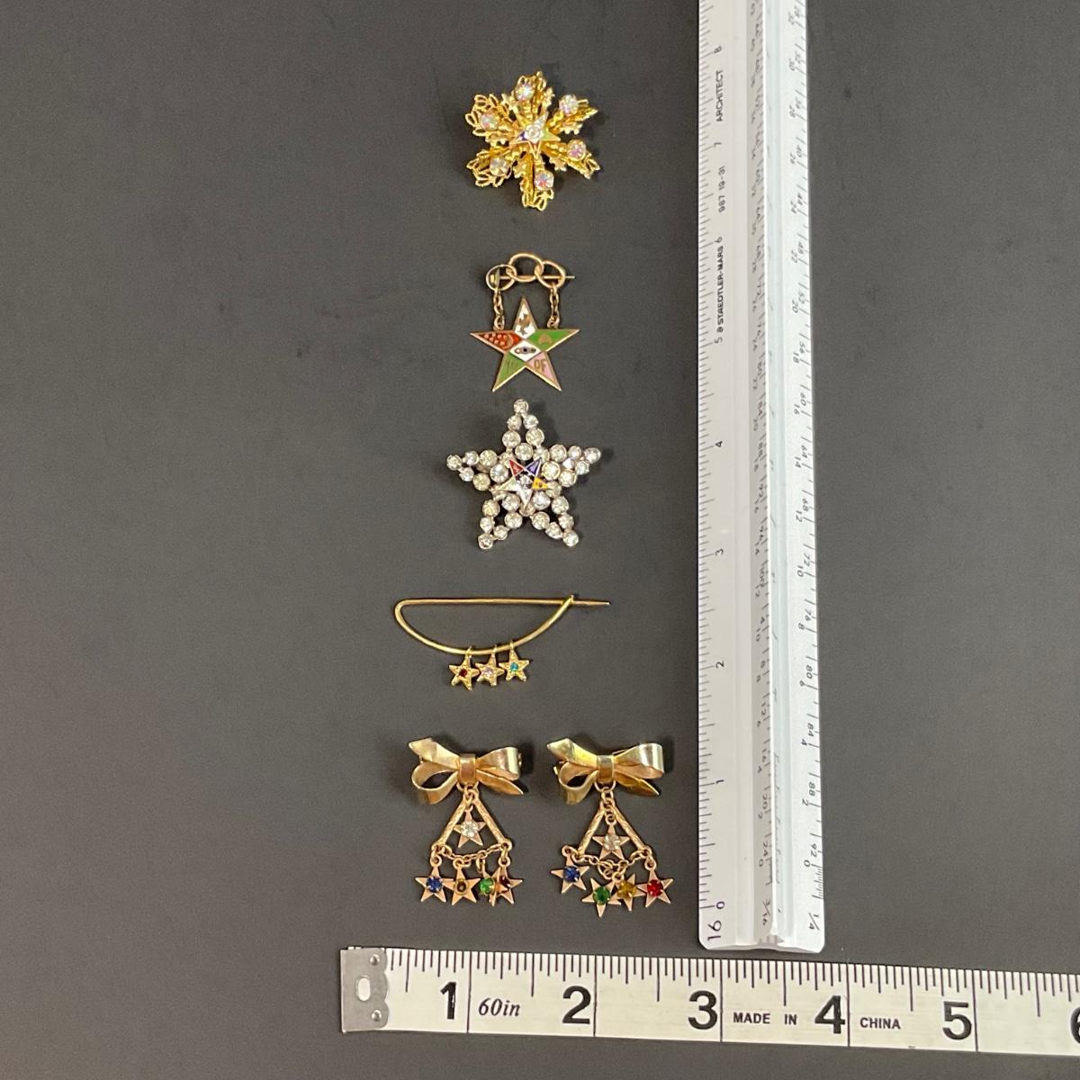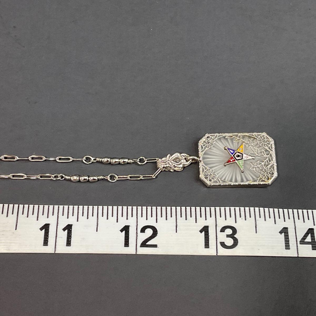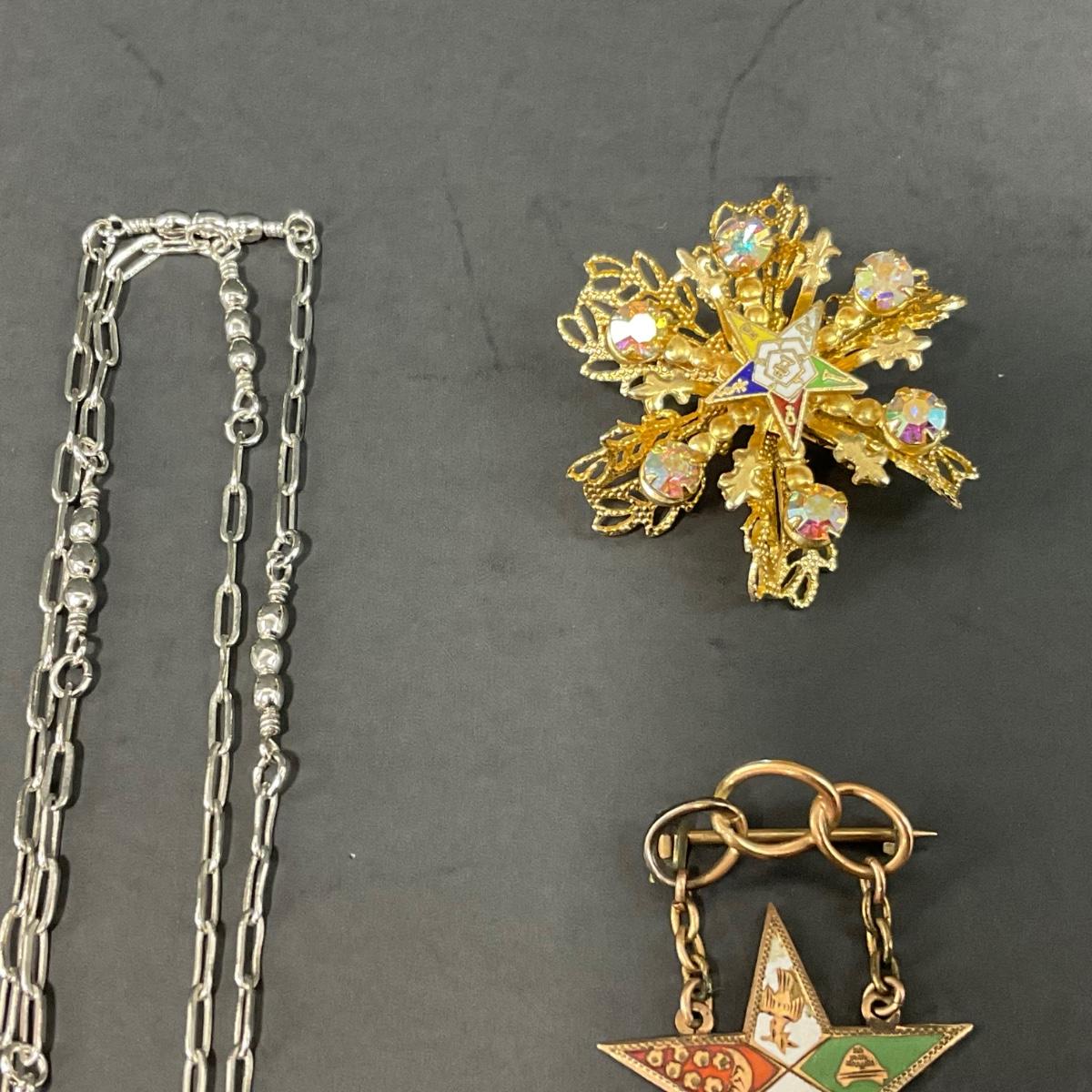 Assorted Masonic pieces including one antique Camphor glass sterling necklace, and six order of the Eastern Star Pins. Please see photos for details and condition. Any condition statement is given as a courtesy to a client, is an opinion, and should not be treated as a statement of fact. Reference to condition written, oral or within a condition report shall not be regarded as a full account of condition and may not include all defects, alterations, or restorations. Absence of a condition report does not imply a lot is flawless or lacking imperfections or damage. Katherine’s Auction & Appraisal Service shall have no responsibility for any error or omission. Returns shall not be accepted on the basis of condition. ::: Shipping is available on this lot. If you require shipping you must let us know at the close of the auction. We will coordinate with you after the item has been won. Shipping fees will include insurance up to or exceeding the value of all items being mailed. If you have any questions regarding this lot please contact the auctioneer either via this website, by direct email or by phone. PICK UP TIMES and other important information can be found in the TERMS and DESCRIPTION of the auction. Please take a look for pertinent information. Thanks!