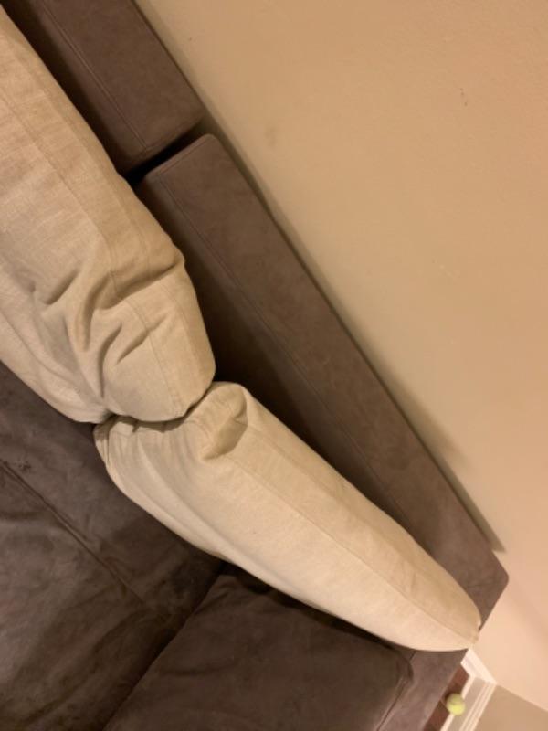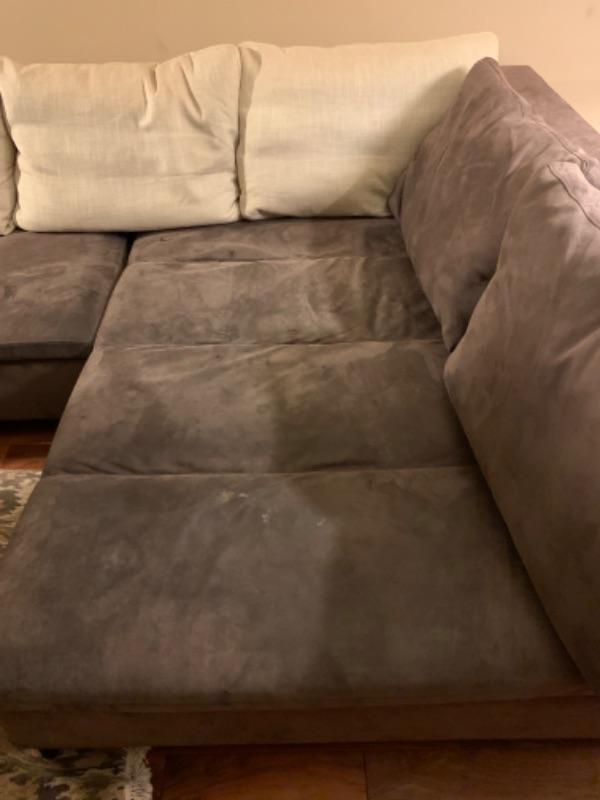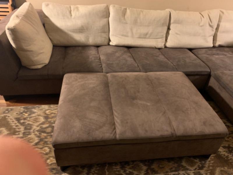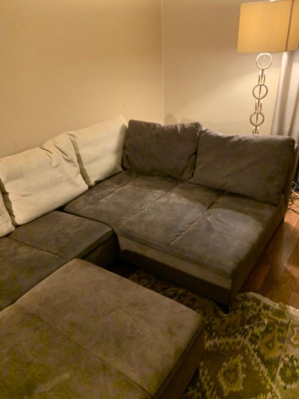 Ligne Roset Grey Suede Sectional Sofa, Ottoman and Down Pillows. Some staining on seat cushions, AS-IS.