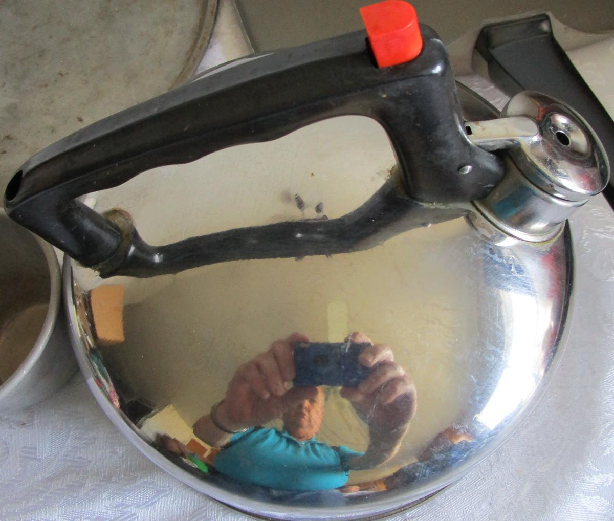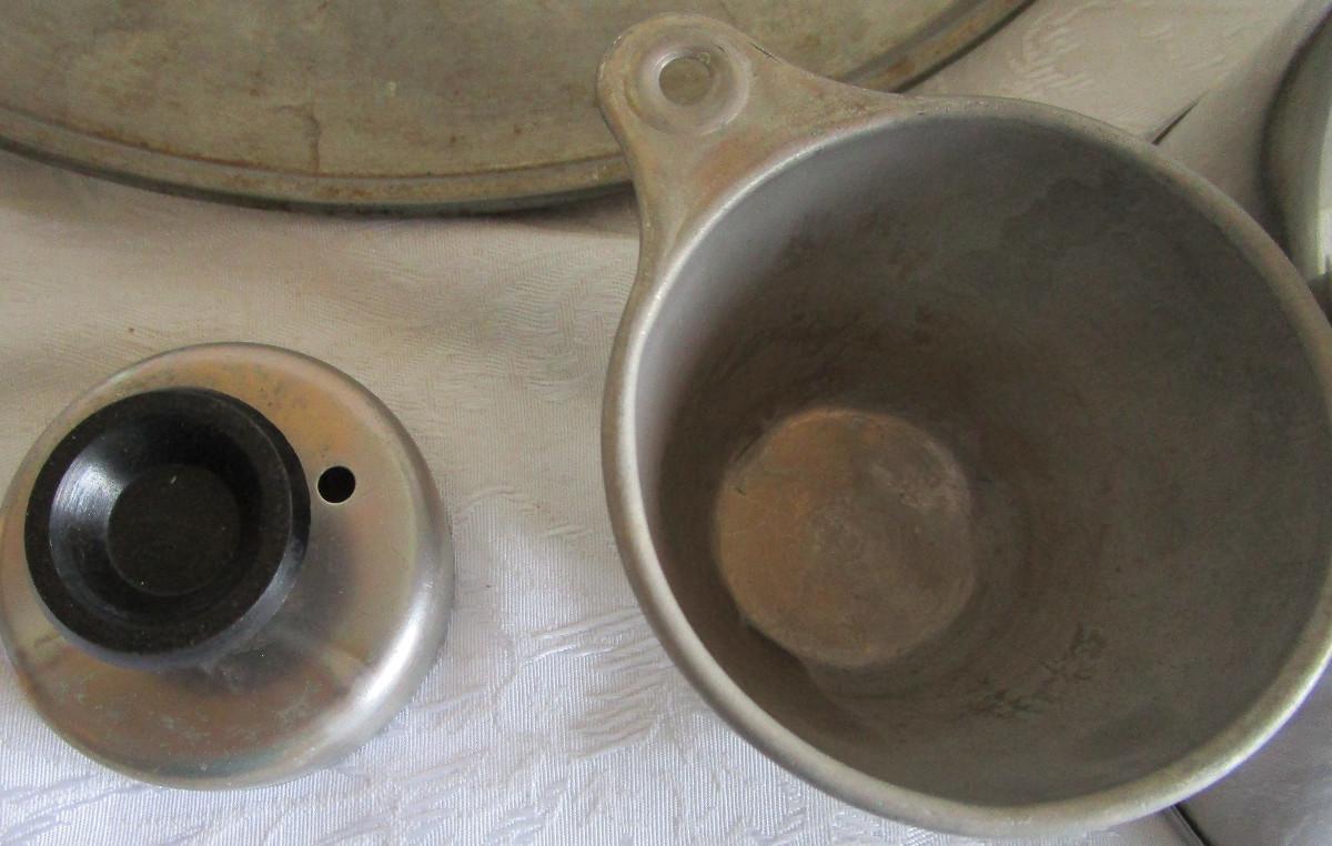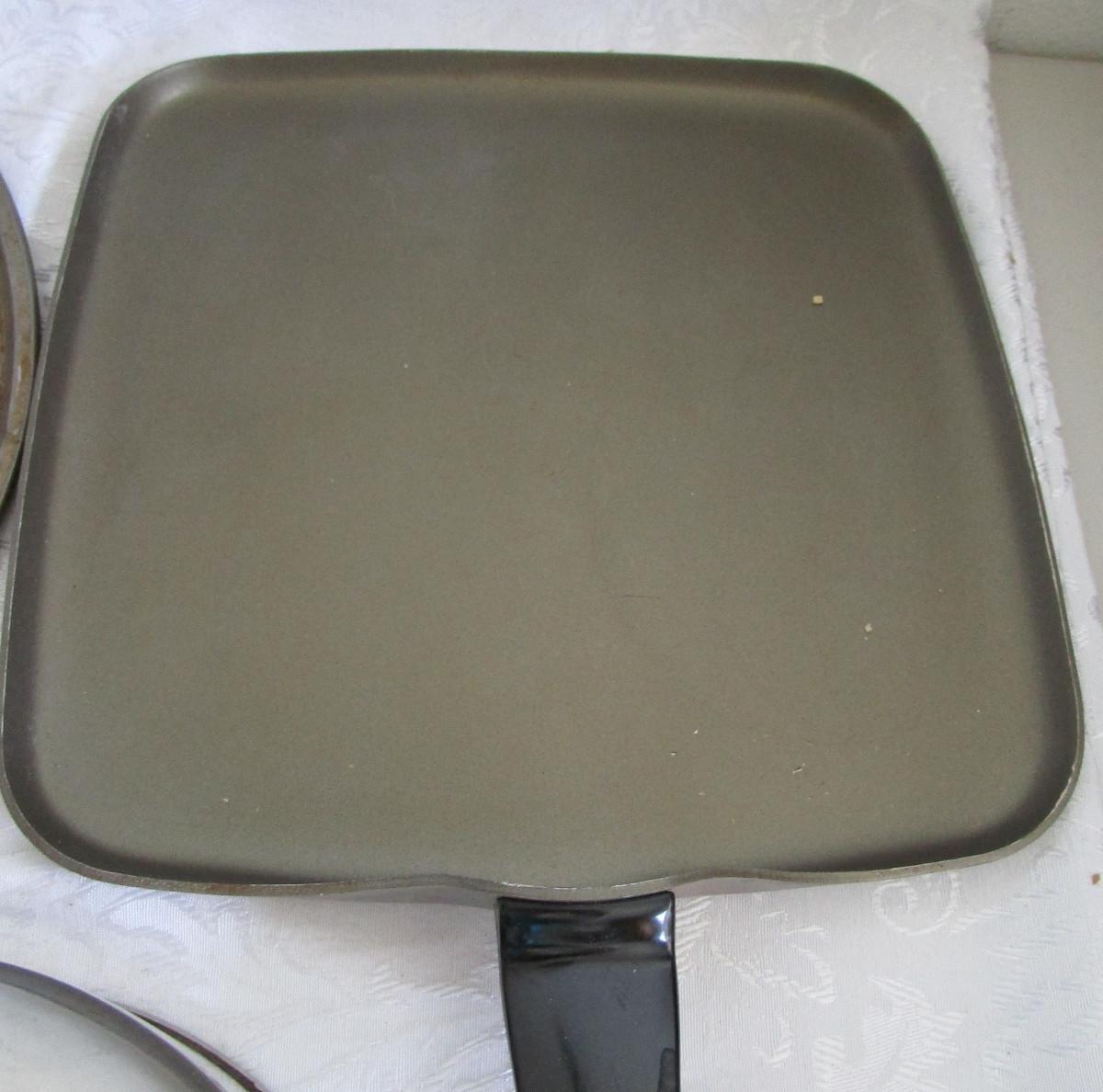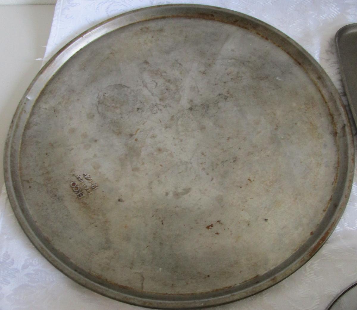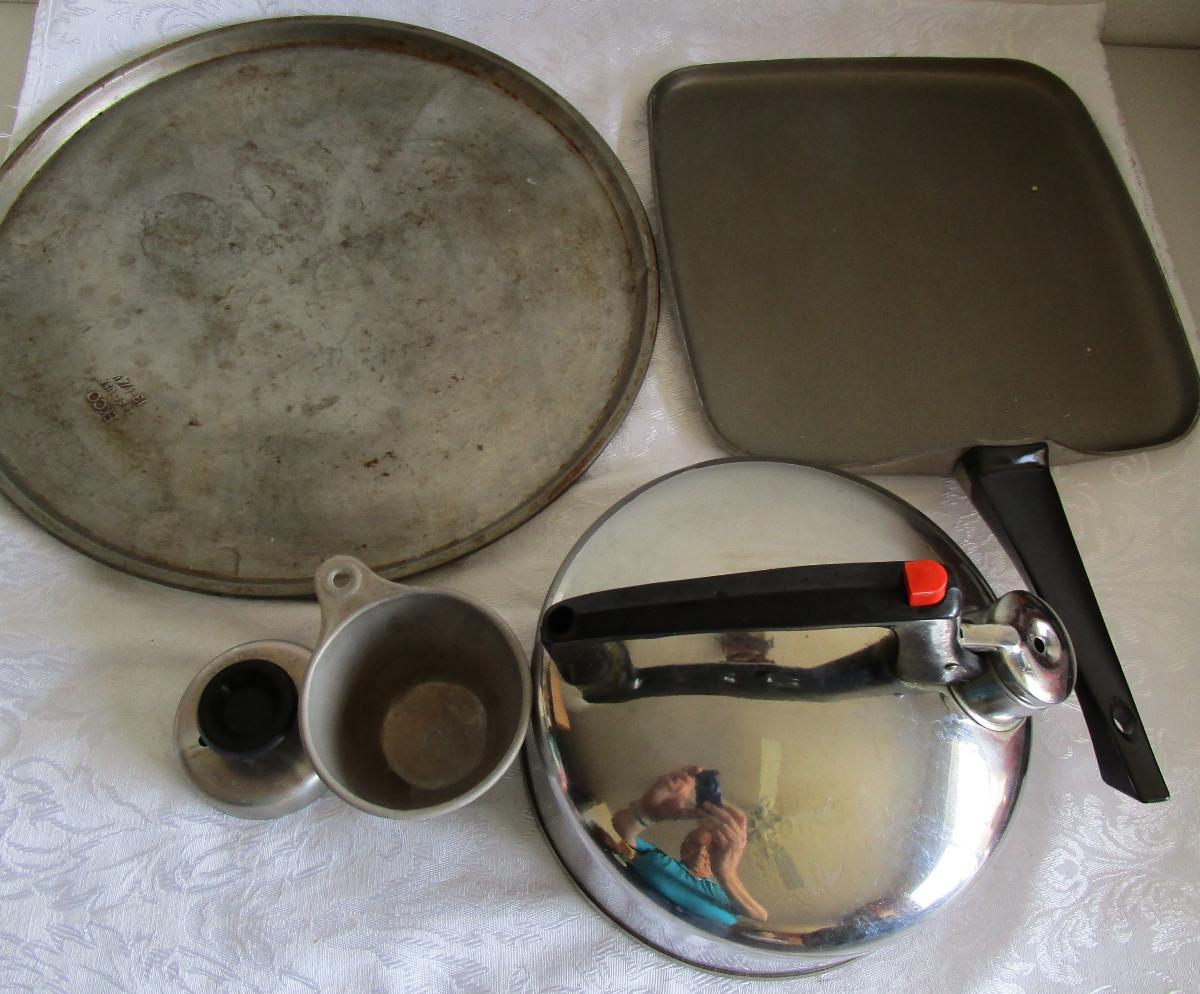 Ekco Pizza pan 13.25", 10.5" Square stove griddle, tea pot, One cup measuring cup, an biscuit cutter