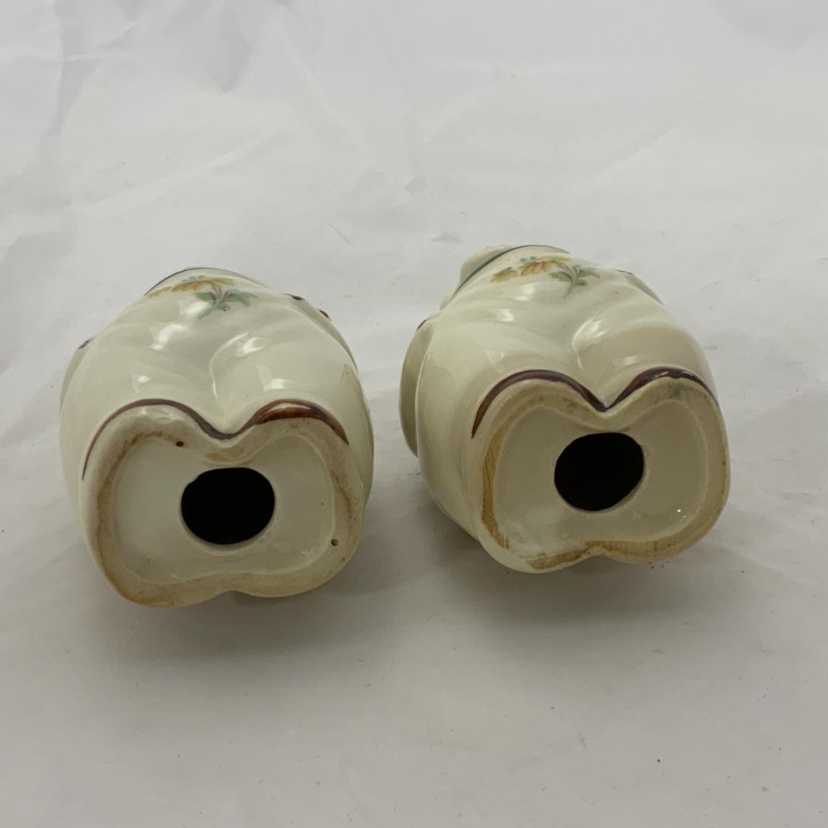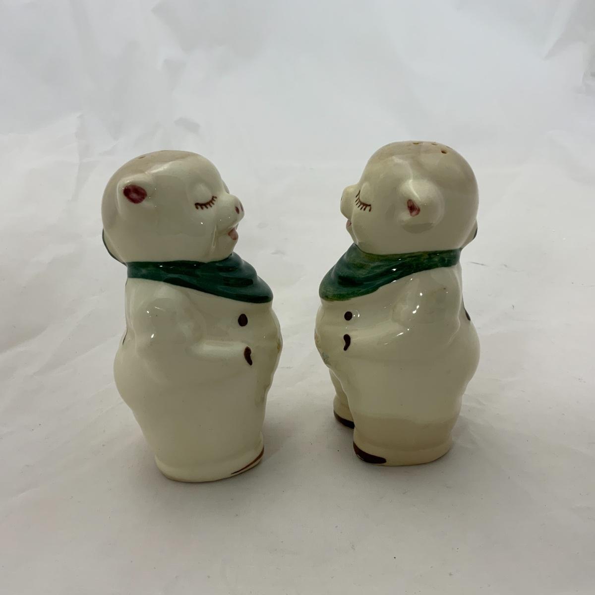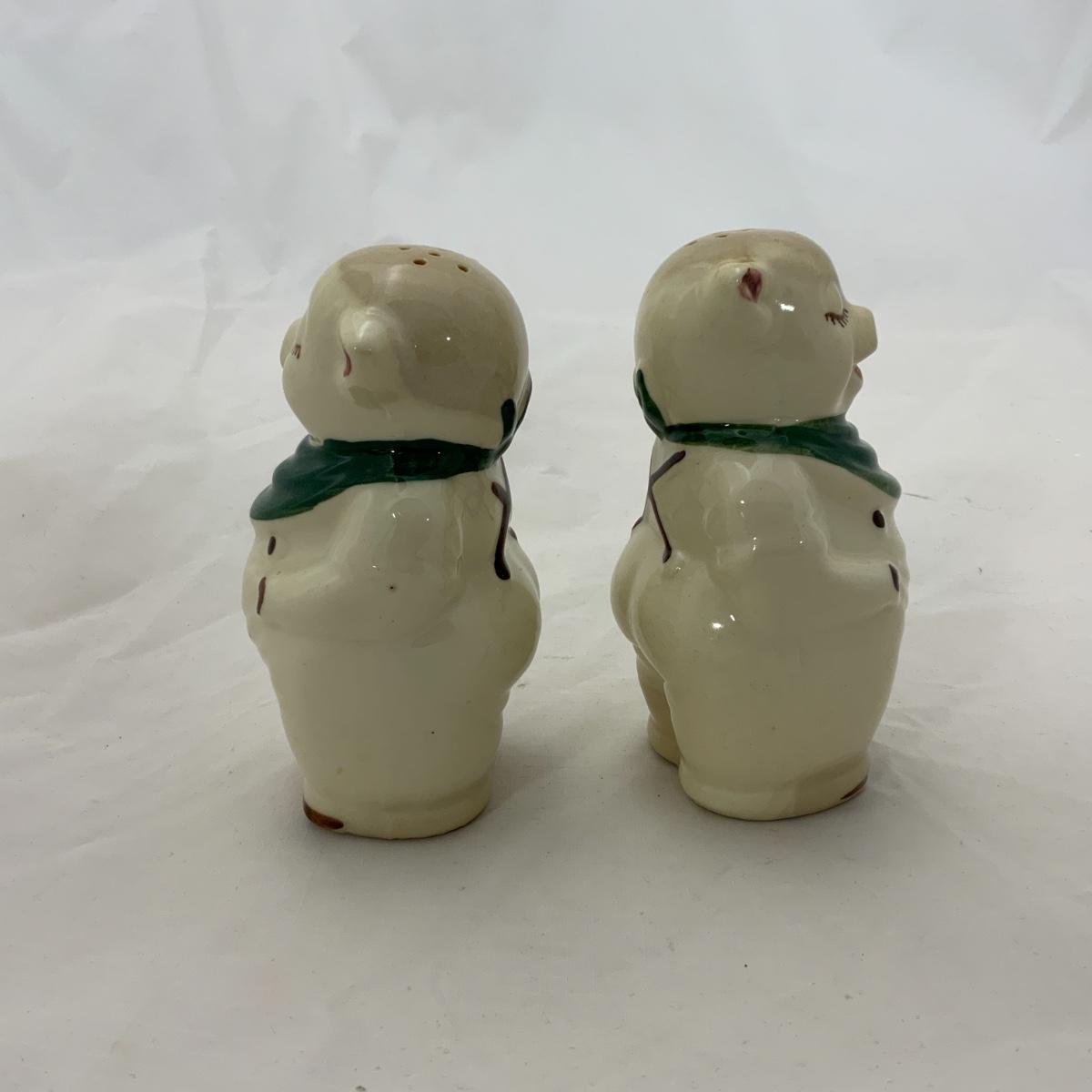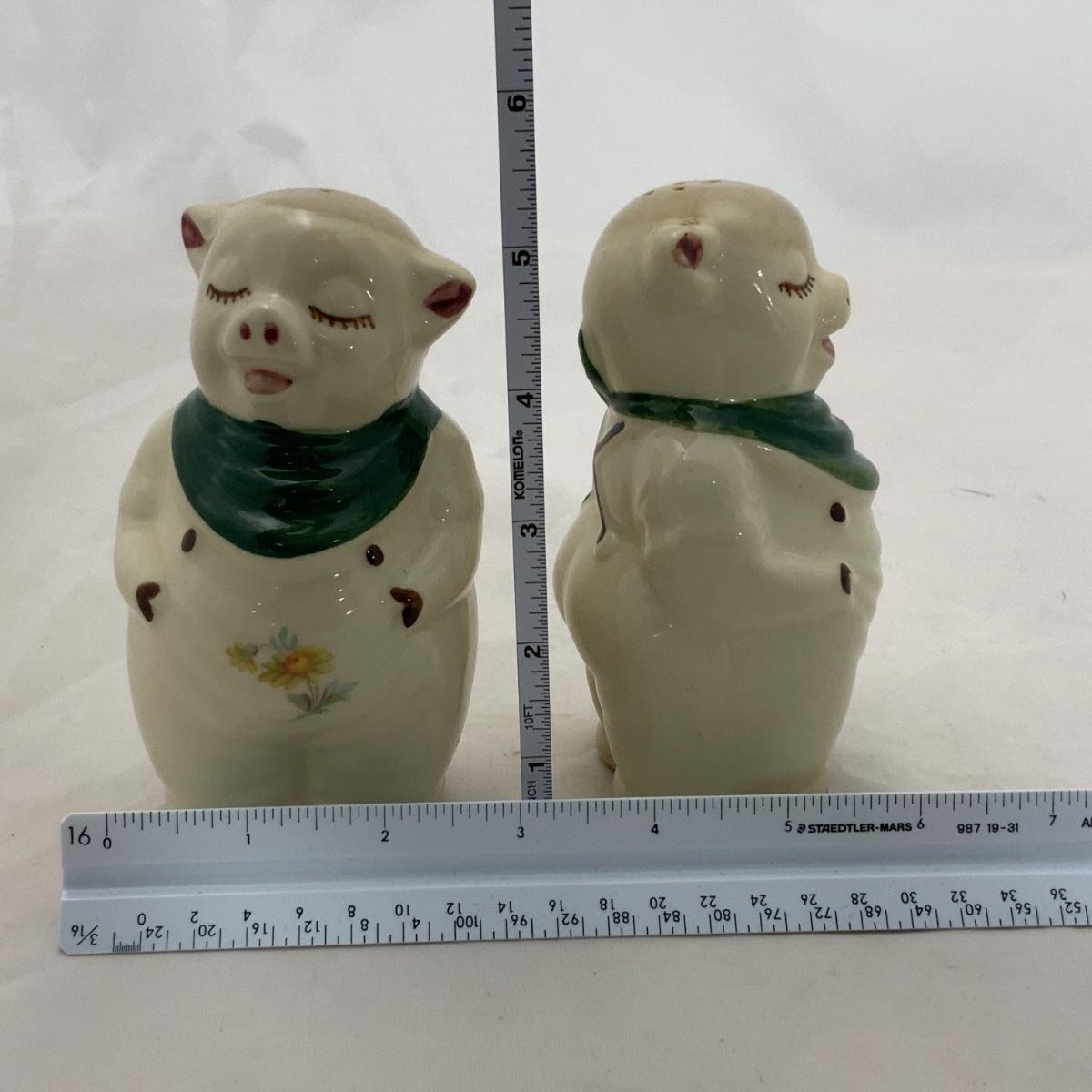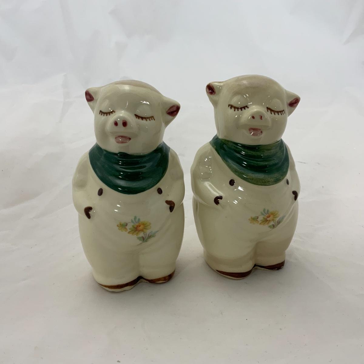From the Estate of Peter and Alice Radovanovich: Nice Matching set of Shawnee Pig Smiley Shakers. Both have discoloration on them to varying degrees. Both pigs have 5 holes and would accommodate pepper the best. Please see photos for details and condition. ::: Shipping is available on this lot. If you require shipping you must let us know at the close of the auction. We will coordinate with you after the item has been won. Shipping fees will include insurance up to or exceeding the value of all items being mailed. If you have any questions regarding this lot please contact the auctioneer either via this website, by direct email or by phone. PICK UP TIMES and other important information can be found in the TERMS and DESCRIPTION of the auction. Please take a look for pertinent information. Thanks!