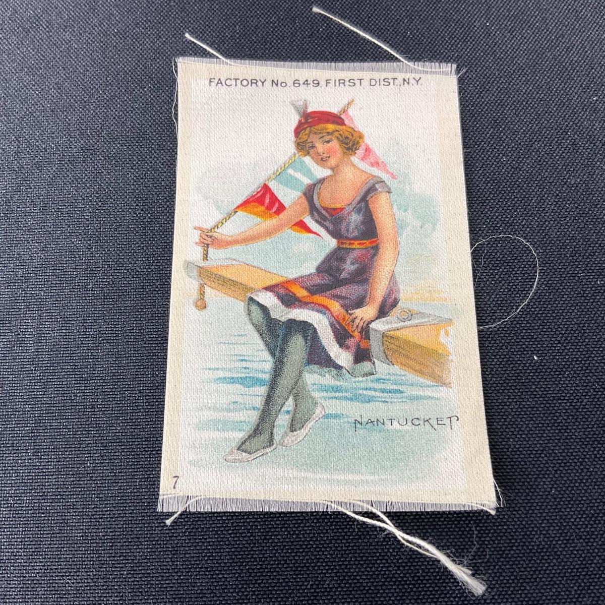 One antique Edwardian bathing beauty tobacco silk. #7 Nantucket Silk. Please see photos for details and condition. Any condition statement is given as a courtesy to a client, is an opinion, and should not be treated as a statement of fact. Reference to condition written, oral or within a condition report shall not be regarded as a full account of condition and may not include all defects, alterations, or restorations. Absence of a condition report does not imply a lot is flawless or lacking imperfections or damage. Katherine’s Auction & Appraisal Service shall have no responsibility for any error or omission. Returns shall not be accepted on the basis of condition. ::: Shipping is available on this lot. If you require shipping you must let us know at the close of the auction. We will coordinate with you after the item has been won. Shipping fees will include insurance up to or exceeding the value of all items being mailed. If you have any questions regarding this lot please contact the auctioneer either via this website, by direct email or by phone. PICK UP TIMES and other important information can be found in the TERMS and DESCRIPTION of the auction. Please take a look for pertinent information. Thanks!
