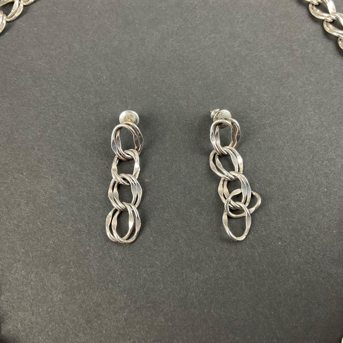 Vintage Sterling marked necklace and earrings set. The total weight of this piece is 27 grams. Please see photos for details and condition. Any condition statement is given as a courtesy to a client, is an opinion, and should not be treated as a statement of fact. Reference to condition written, oral or within a condition report shall not be regarded as a full account of condition and may not include all defects, alterations, or restorations. Absence of a condition report does not imply a lot is flawless or lacking imperfections or damage. Katherine’s Auction & Appraisal Service shall have no responsibility for any error or omission. Returns shall not be accepted on the basis of condition. ::: Shipping is available on this lot. If you require shipping you must let us know at the close of the auction. We will coordinate with you after the item has been won. Shipping fees will include insurance up to or exceeding the value of all items being mailed. If you have any questions regarding this lot please contact the auctioneer either via this website, by direct email or by phone. PICK UP TIMES and other important information can be found in the TERMS and DESCRIPTION of the auction. Please take a look for pertinent information. Thanks!