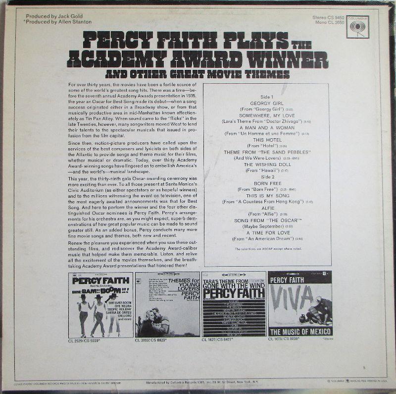 The Academy Award Winner Born Free and other Great Movie Themes. Academy Award winning and nominated songs arranged by Percy Faith for his orchestra
