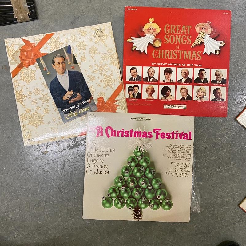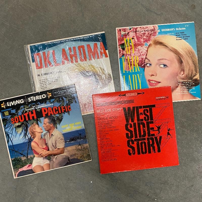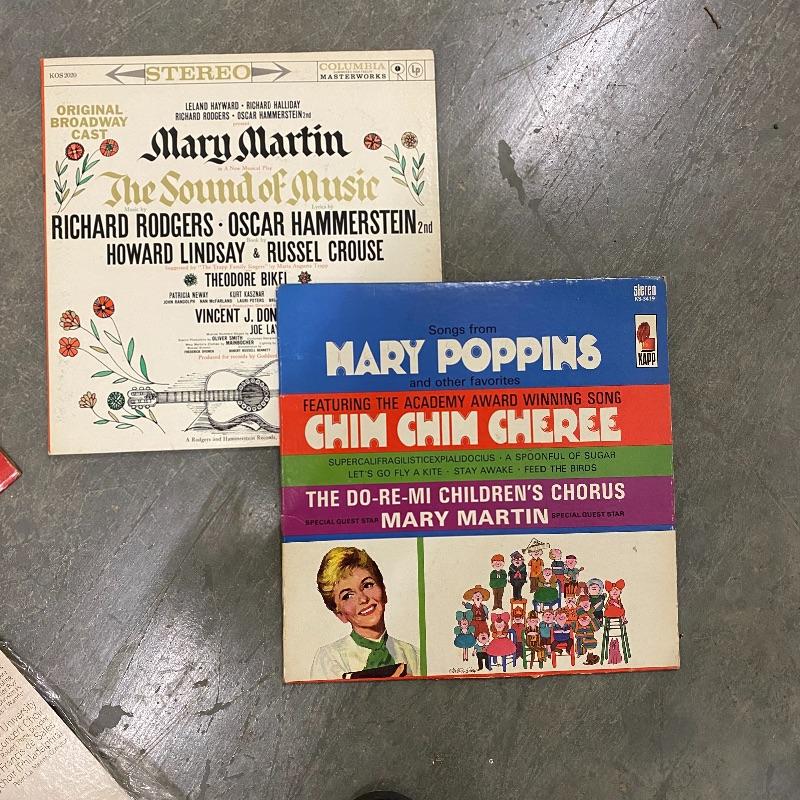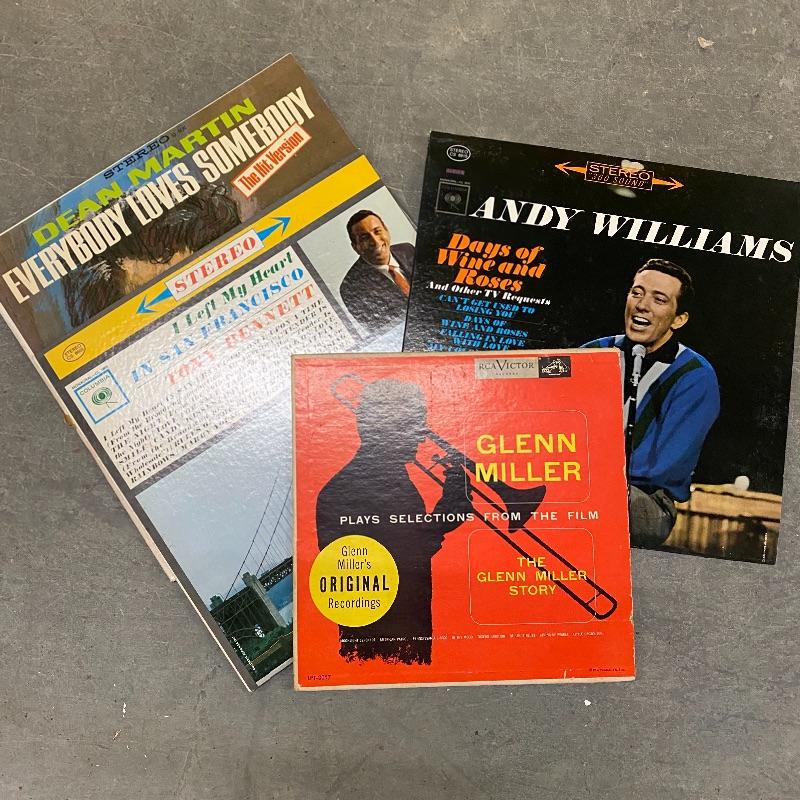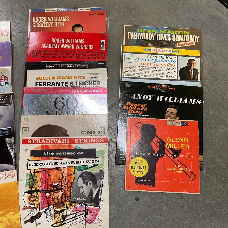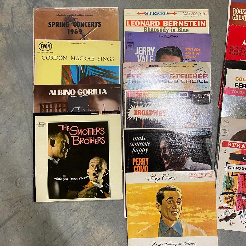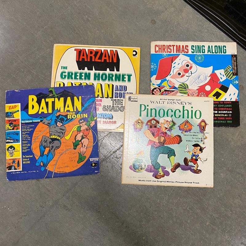 A group of vinyl records with everything from show tunes to Batman to Perry Como. Records seem to be in good condition but this is a used collection so some wear.