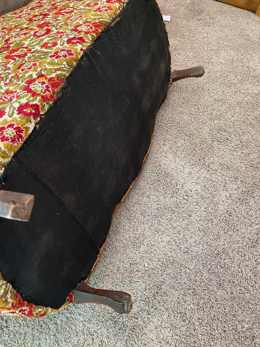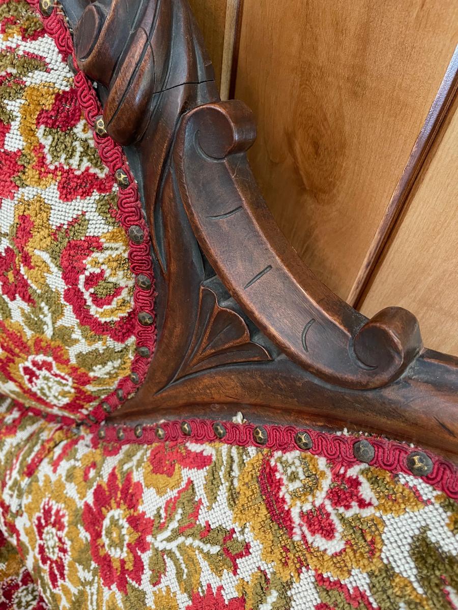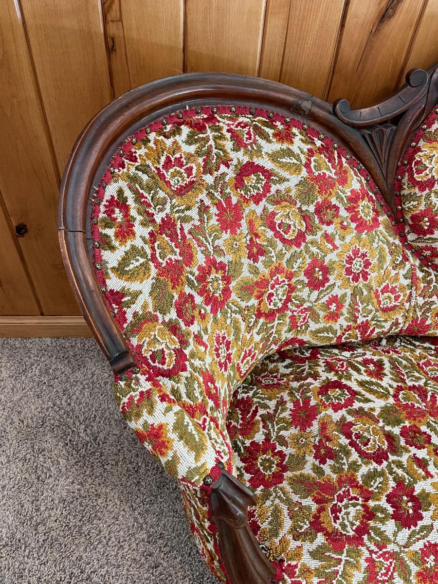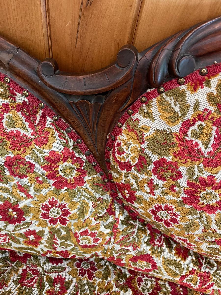 #51 Walnut Victorian Settee Baroque Tapestry Style Fabric.
