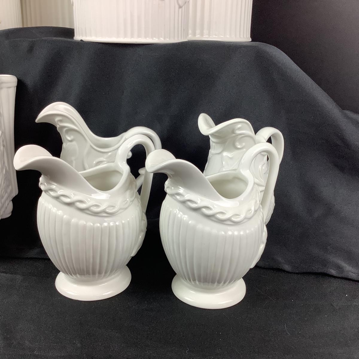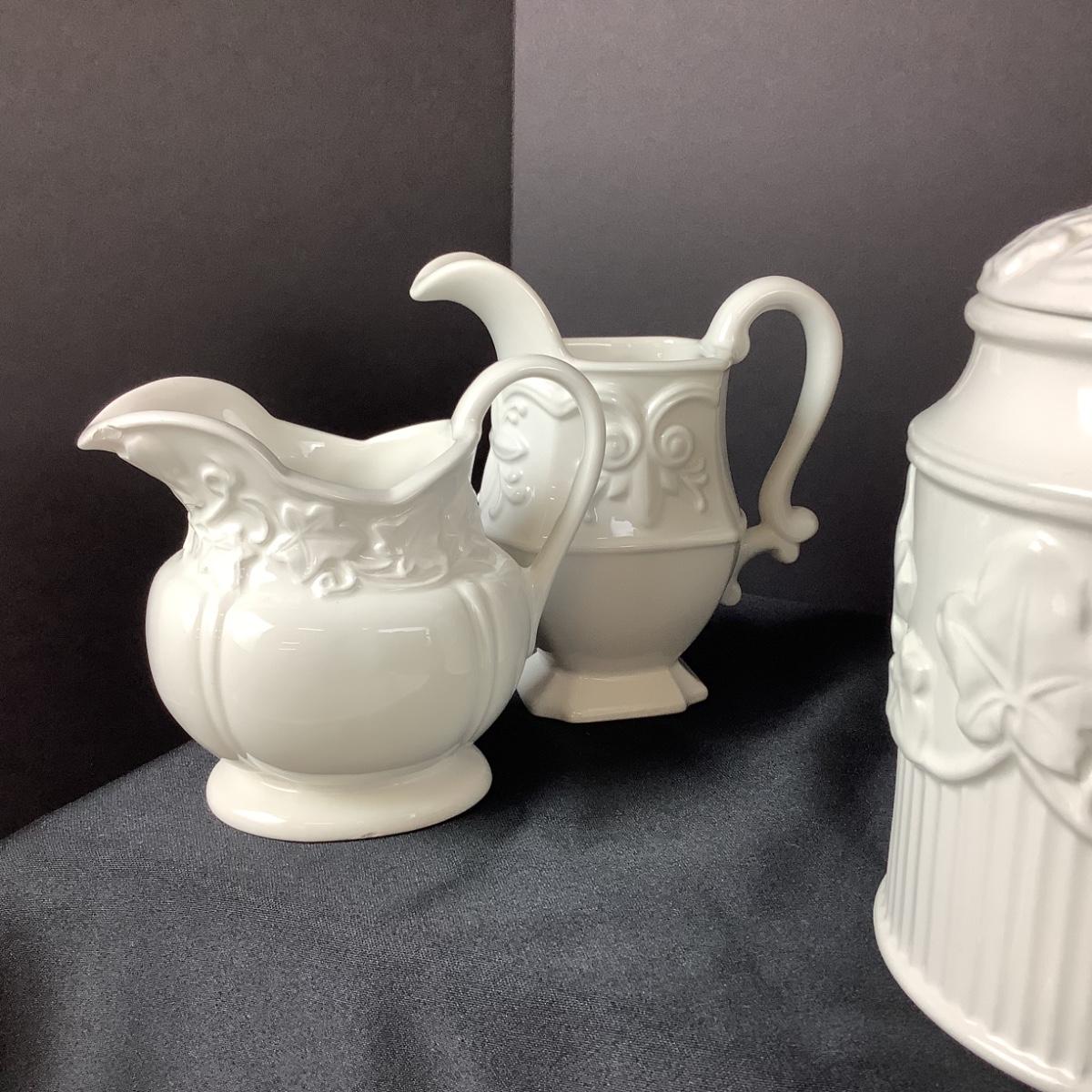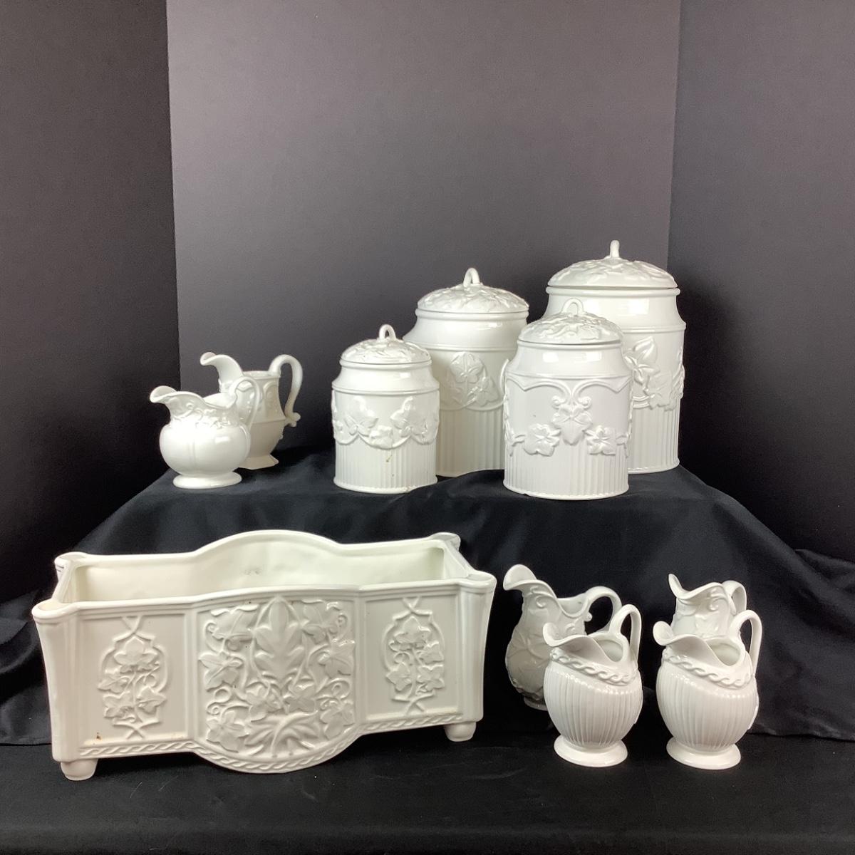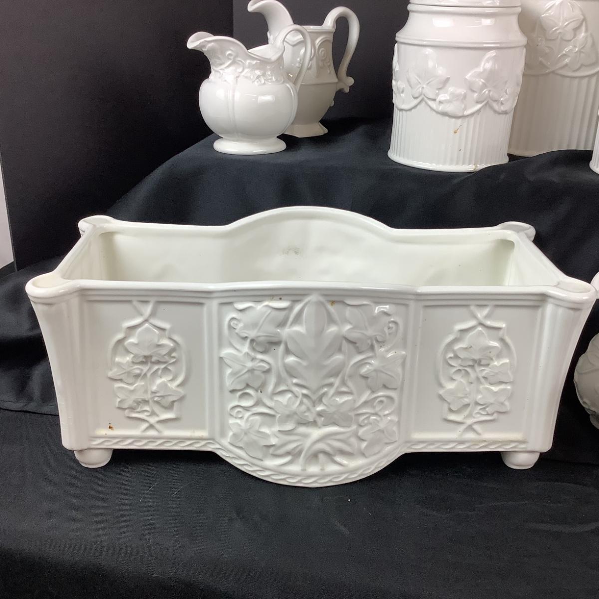 Set of 4 cannisters, one flower pot measuring 15" x 6.5" high x 6.75" deep , and 6 cream pitchers