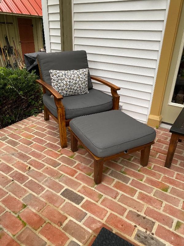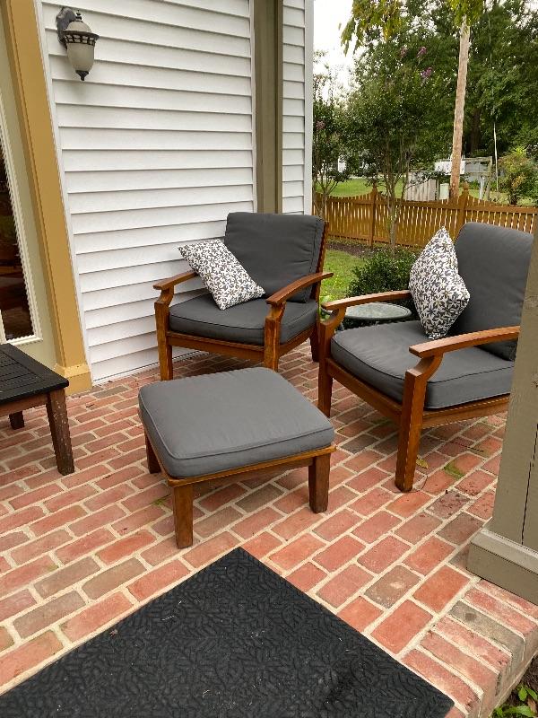 Smith and Hawken Teak 6 piece Patio Furniture Set Three Chairs with cushions and two Ottomans, with one coffee table and a round metal side table