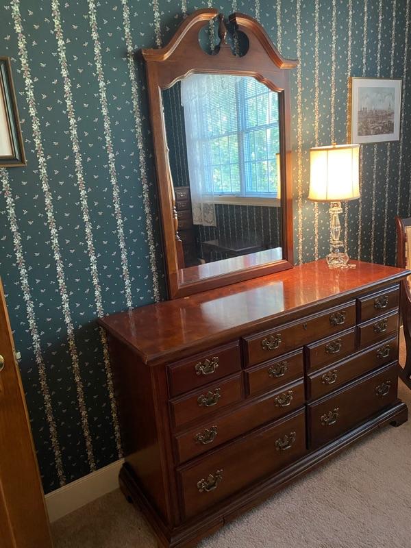 J - 513. 4 pc Queen American Drew Bed, Dressers, Mirrors, & Lamps
