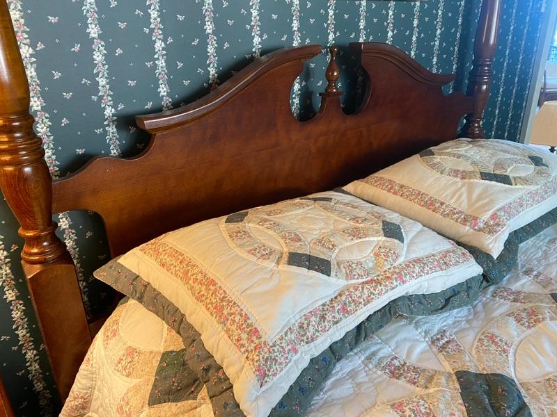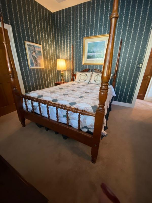 - Queen Size 4 poster Bed 76.5” at tallest point x 64” W. Bedding is included, MATTRESS & BOXSPRING ARE NOT INCLUDED