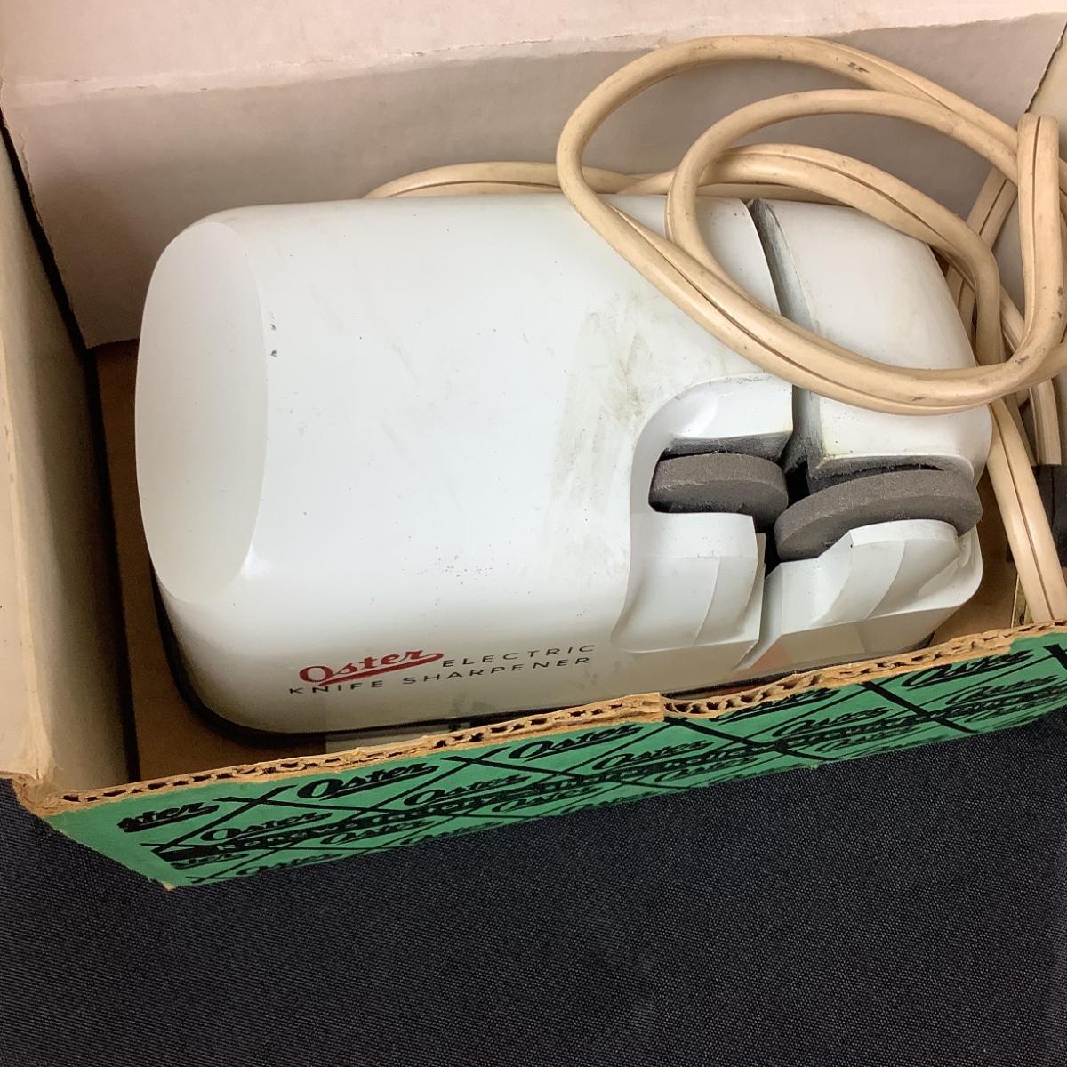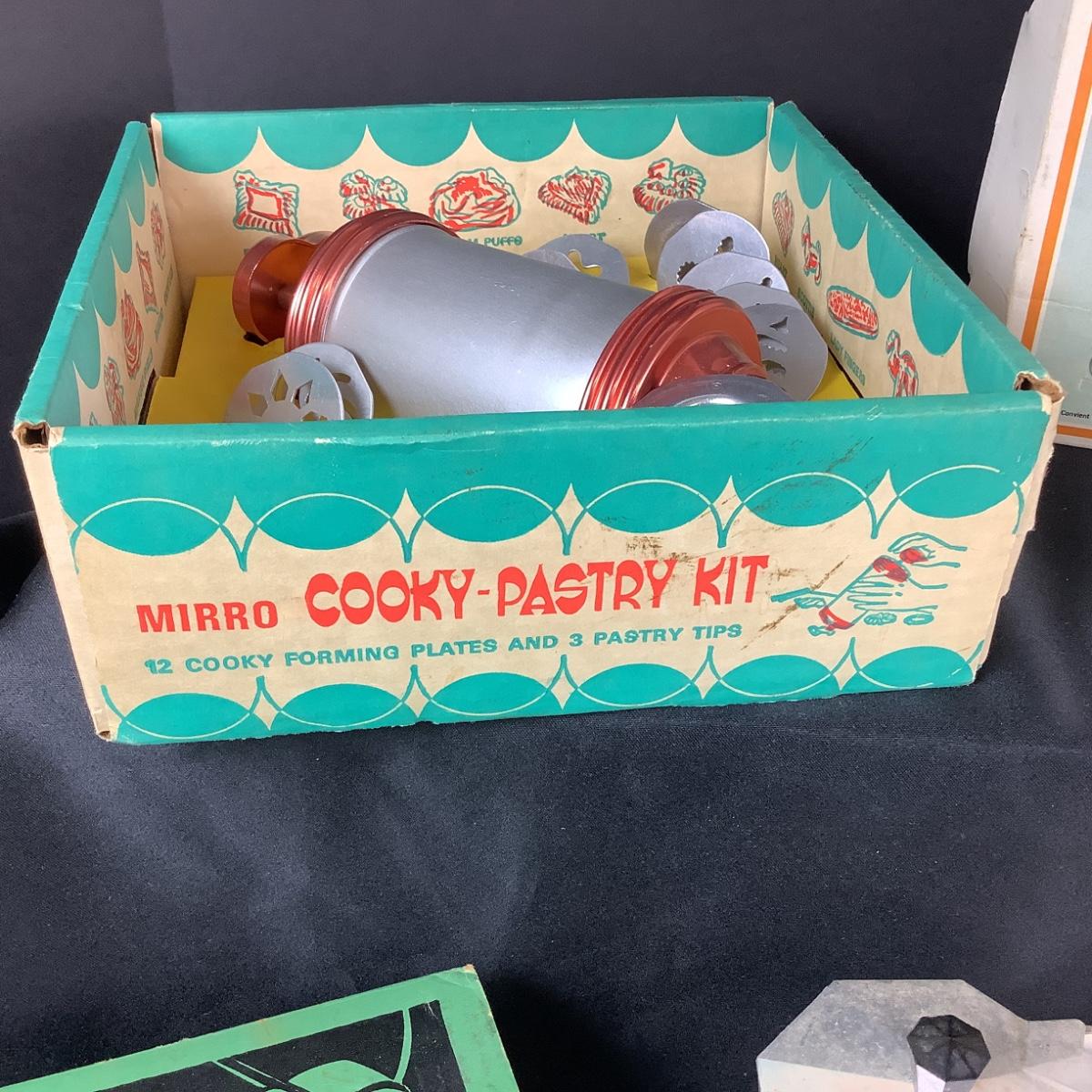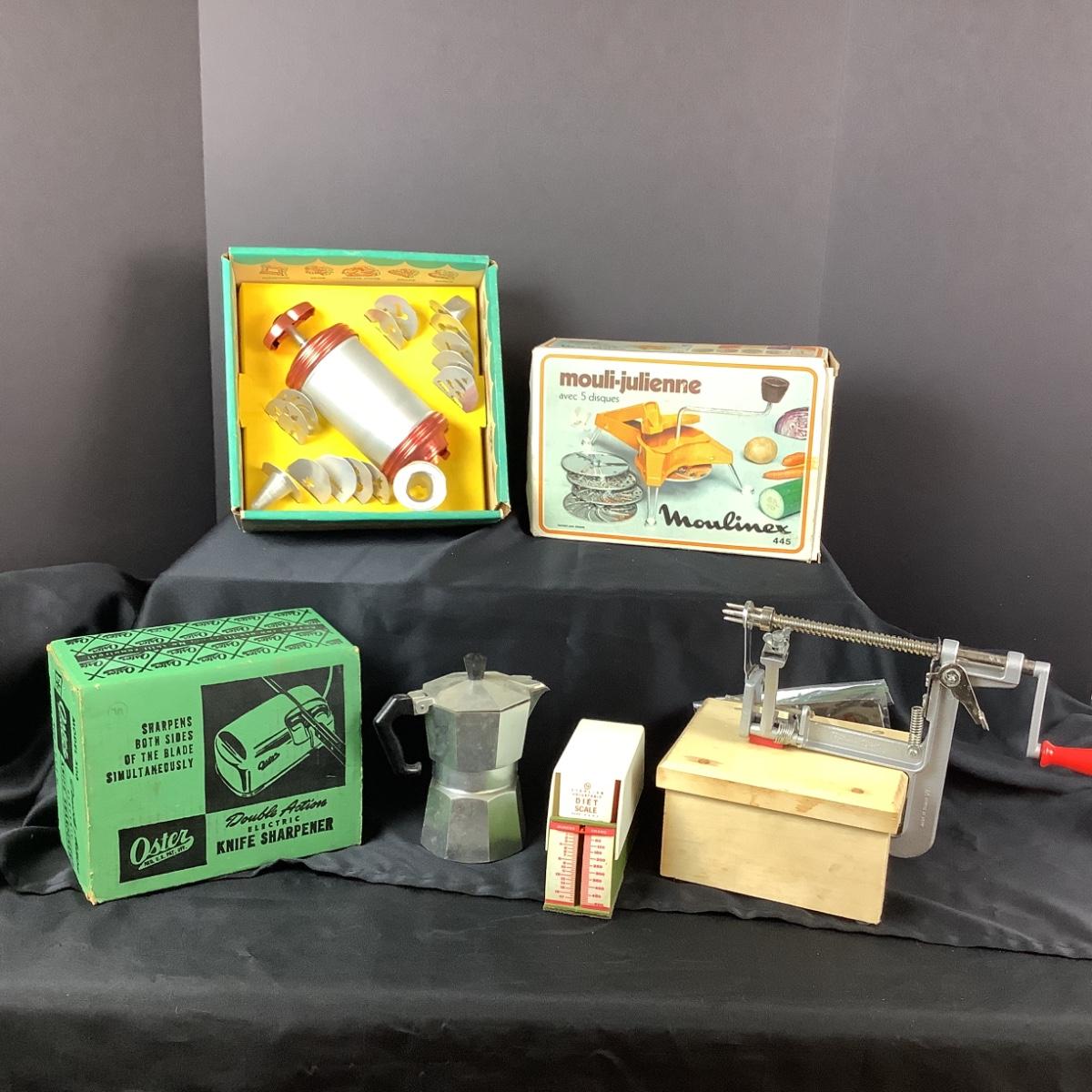 Vintage mirro cookie press, Moulinex slicer, oster knife sharpener , coffee pot , diet scale