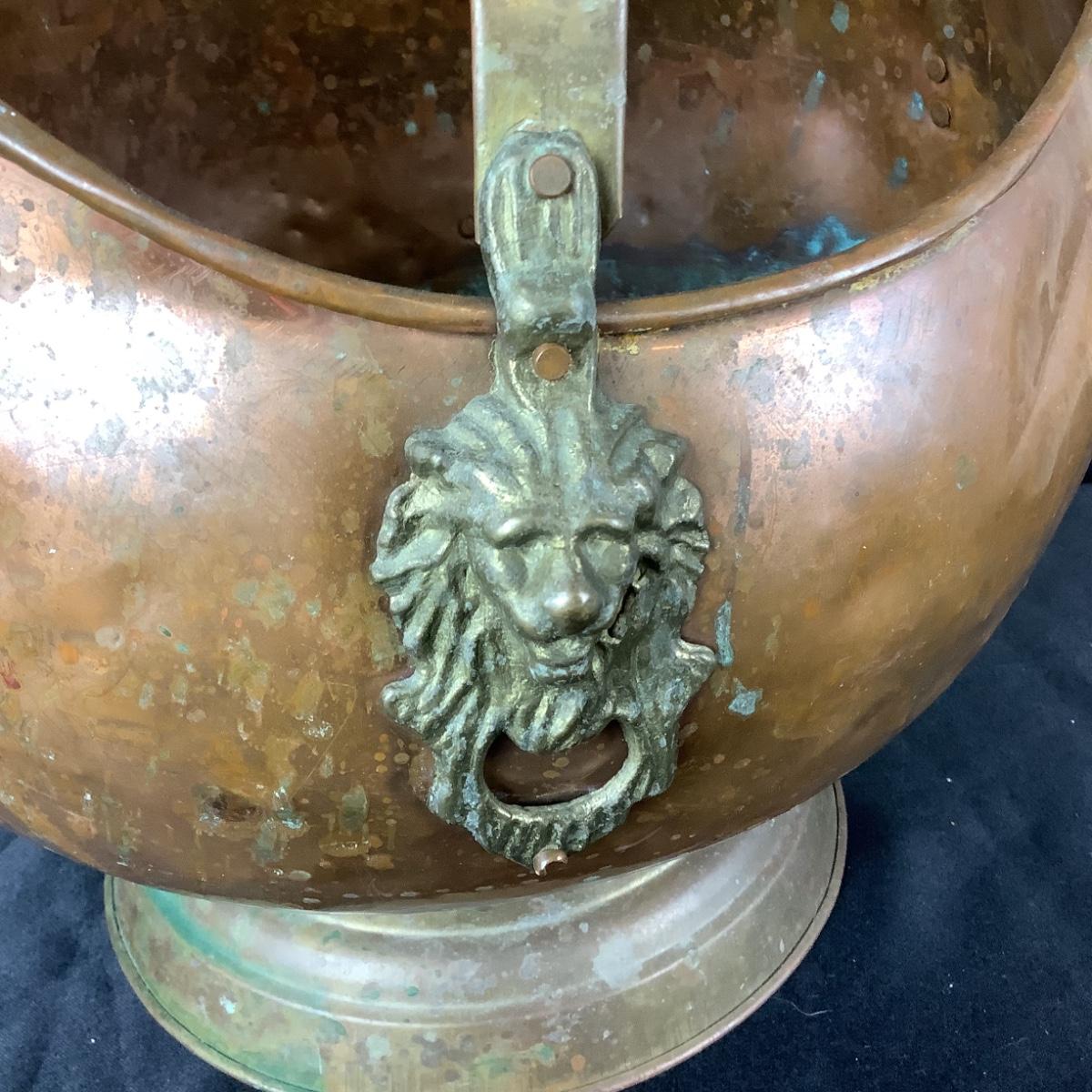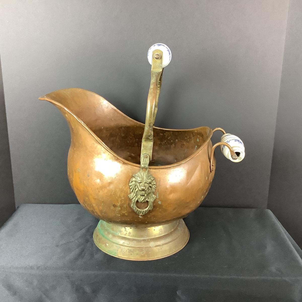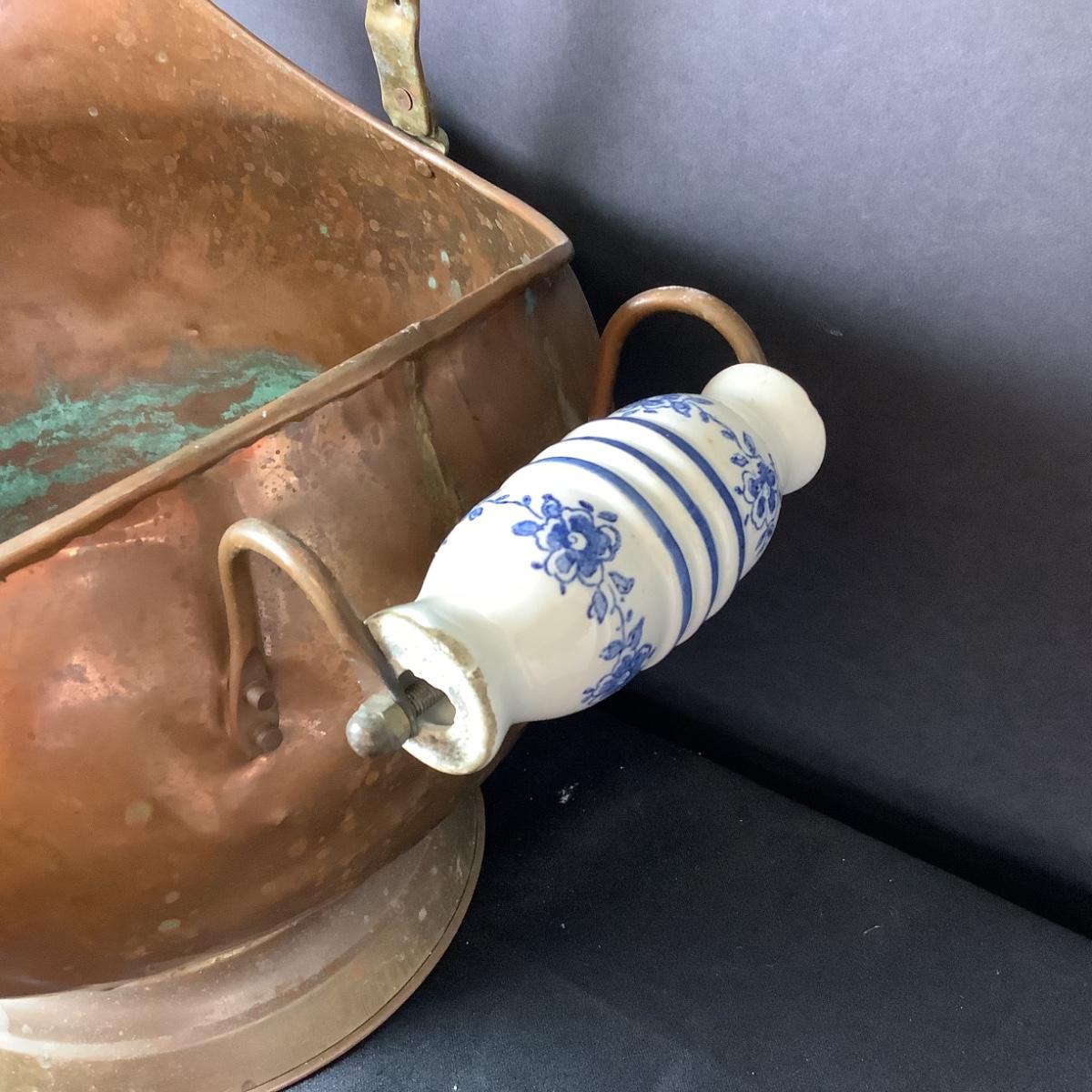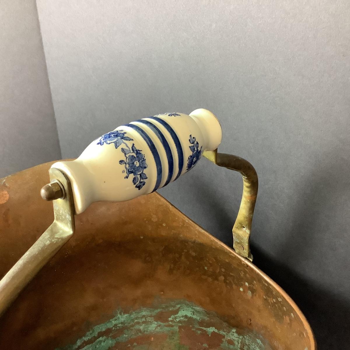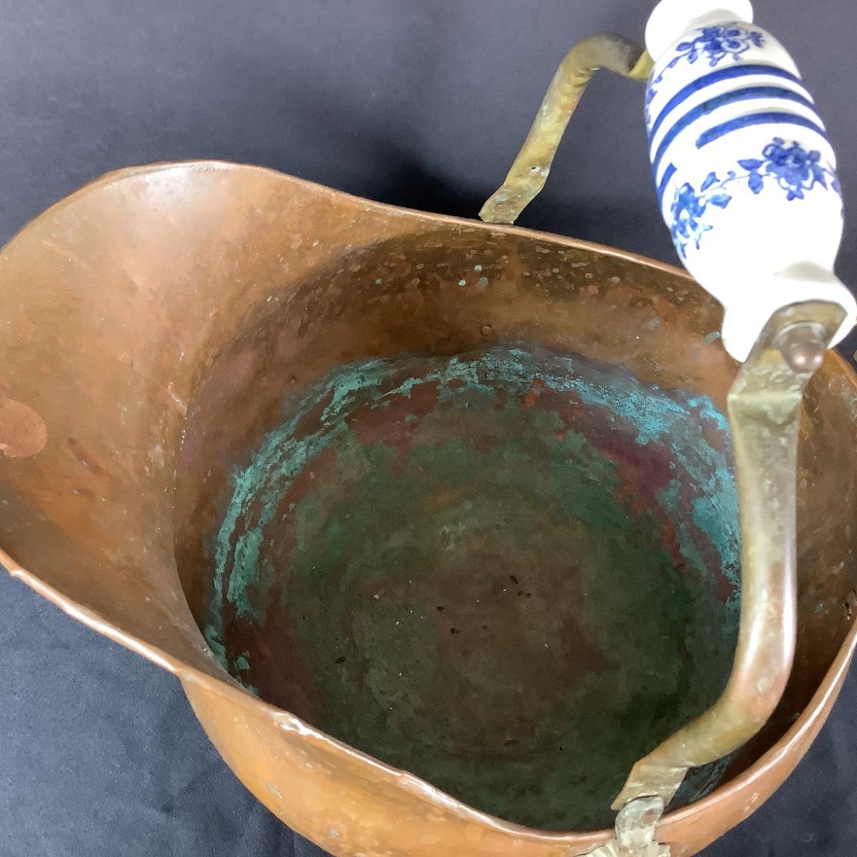 5140 Vintage Copper Coal Scuttle Ash Bucket Delft Porcelain Handles