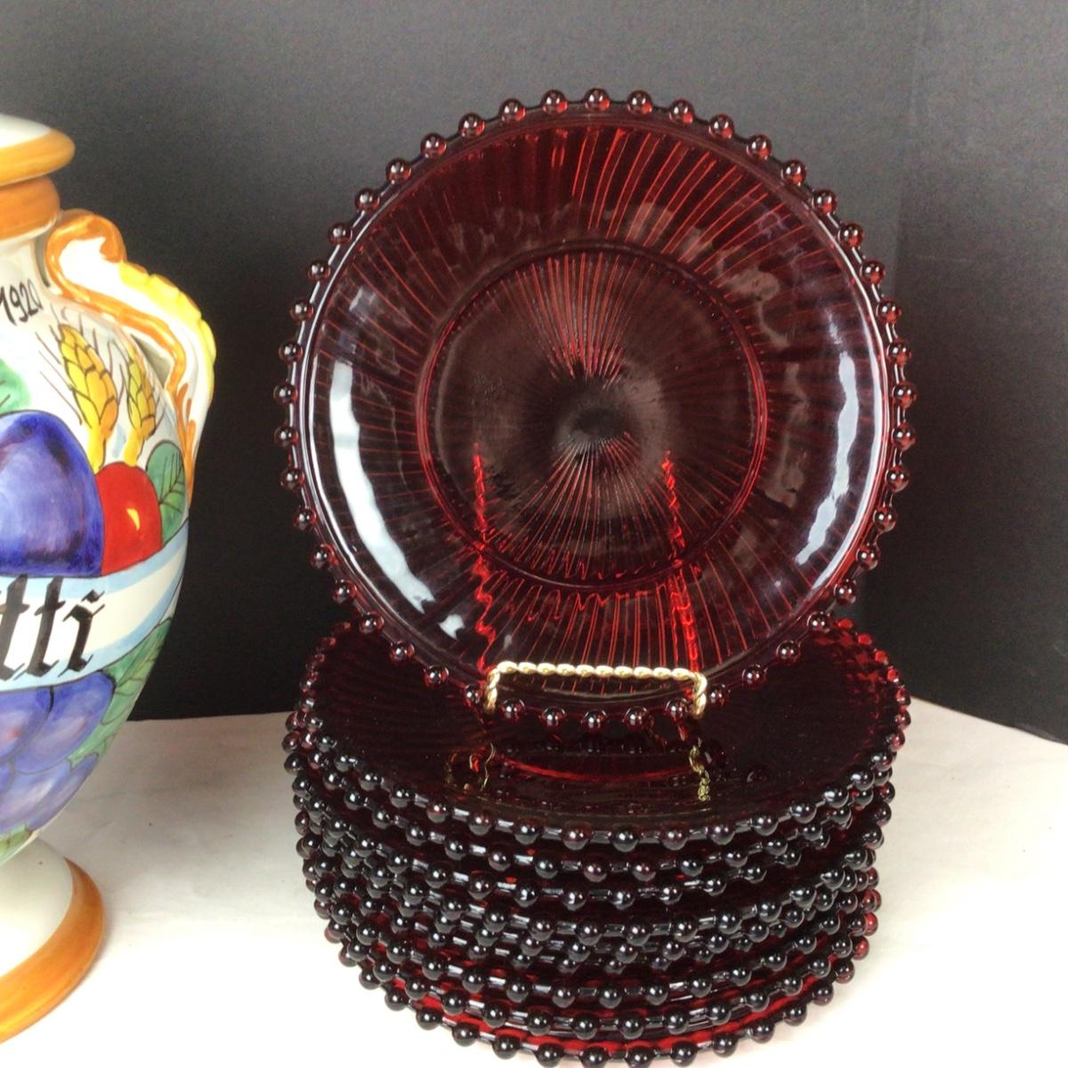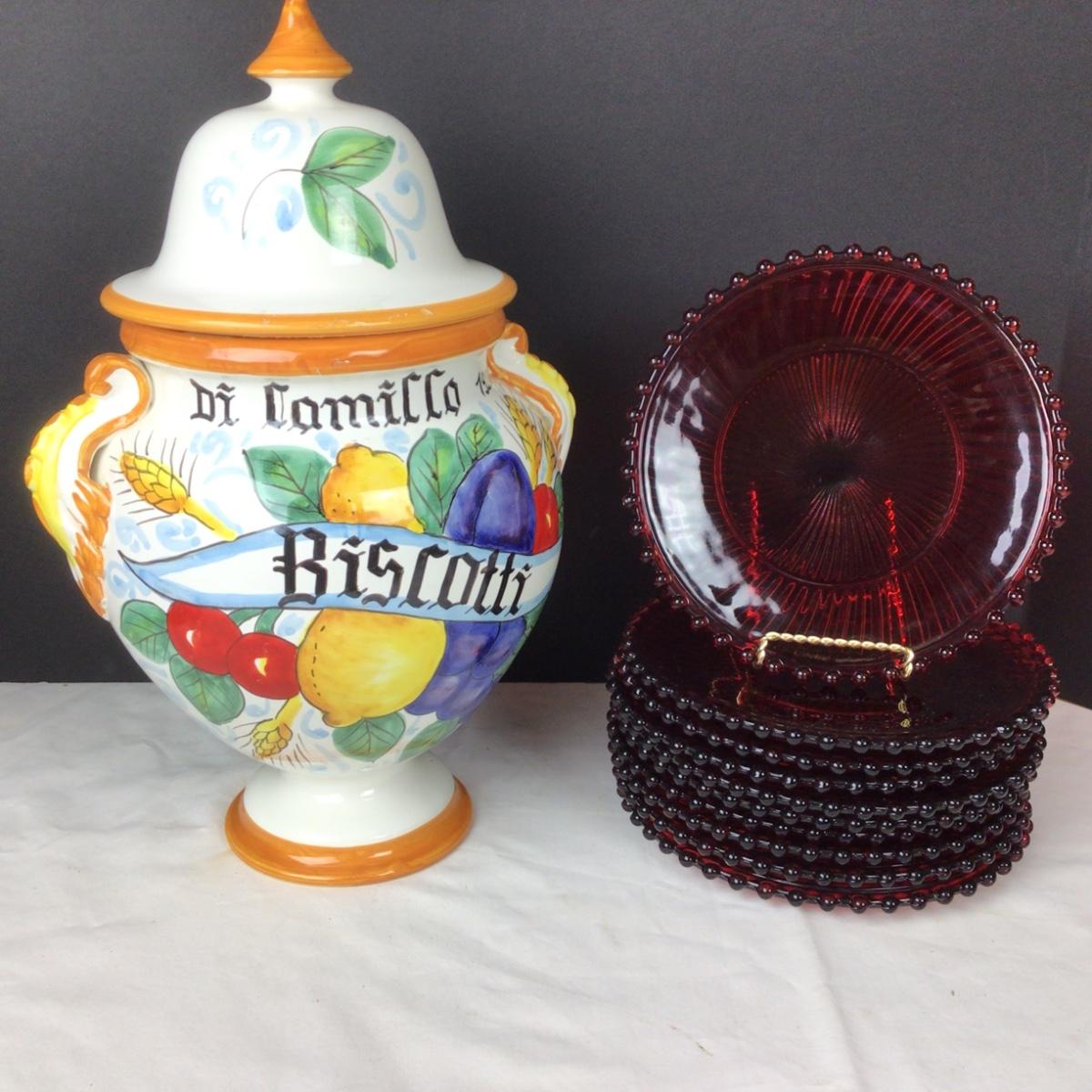 The jar is made in Italy and measures 15” x 9” and there are 10 red glass plates with knobby edge that are 8” in diameter.