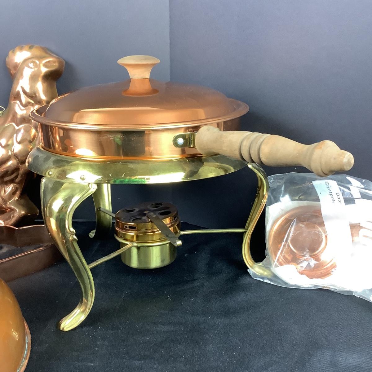 Copper Lot Cookware. 3 Pans, Tea Kettle, Creamer, Chafing Dish w/ Brass Bottom