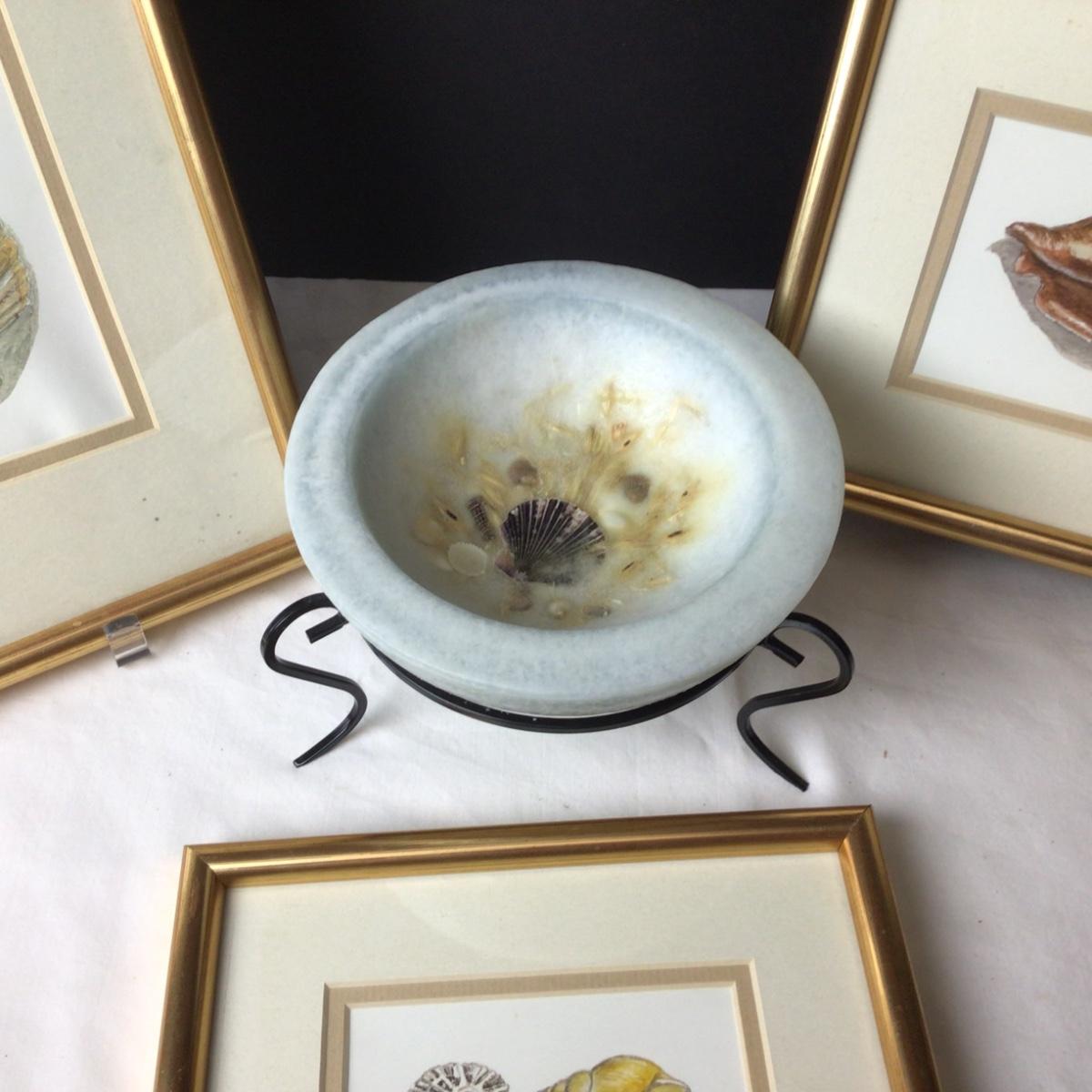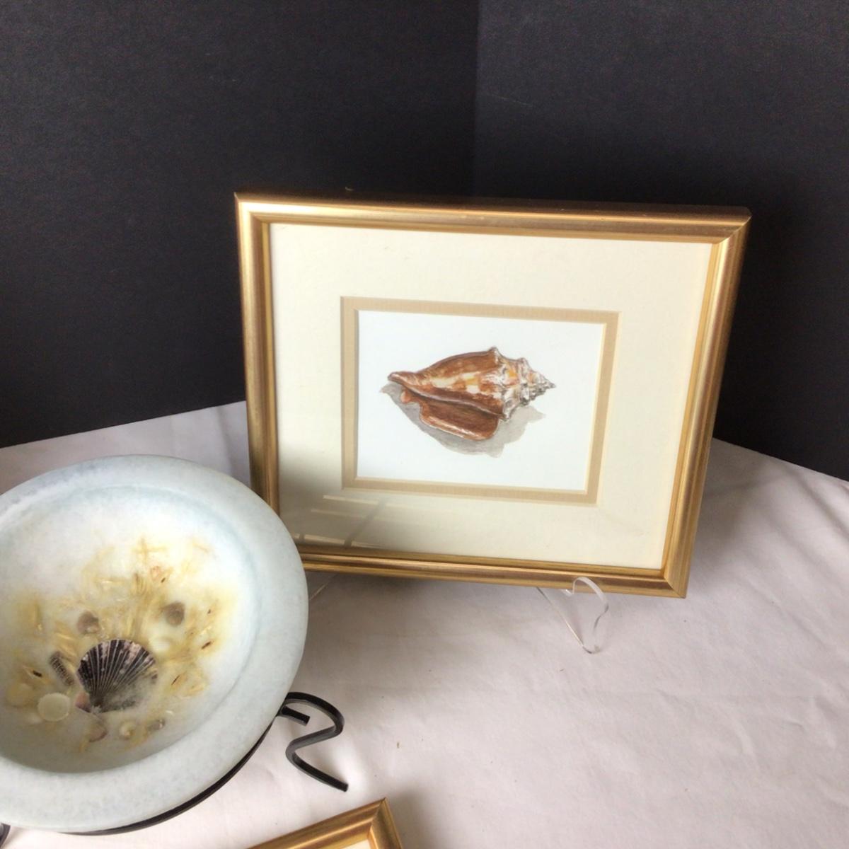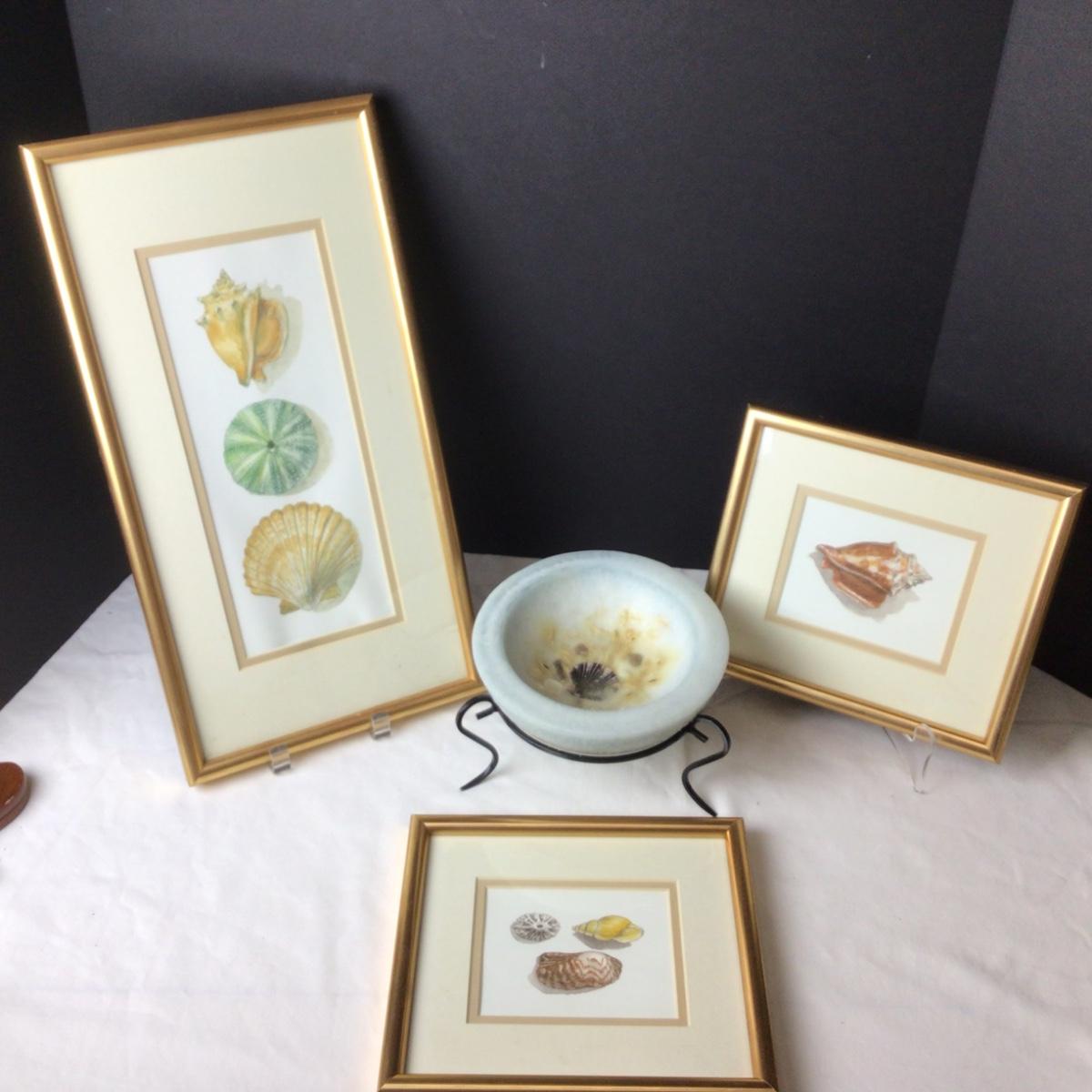 There are 3 framed seashell pictures-the largest is 16” x 9” and the 2 square ones are 8” x 8”. There is also a Habersham Candle Co. Pottery Vessel.