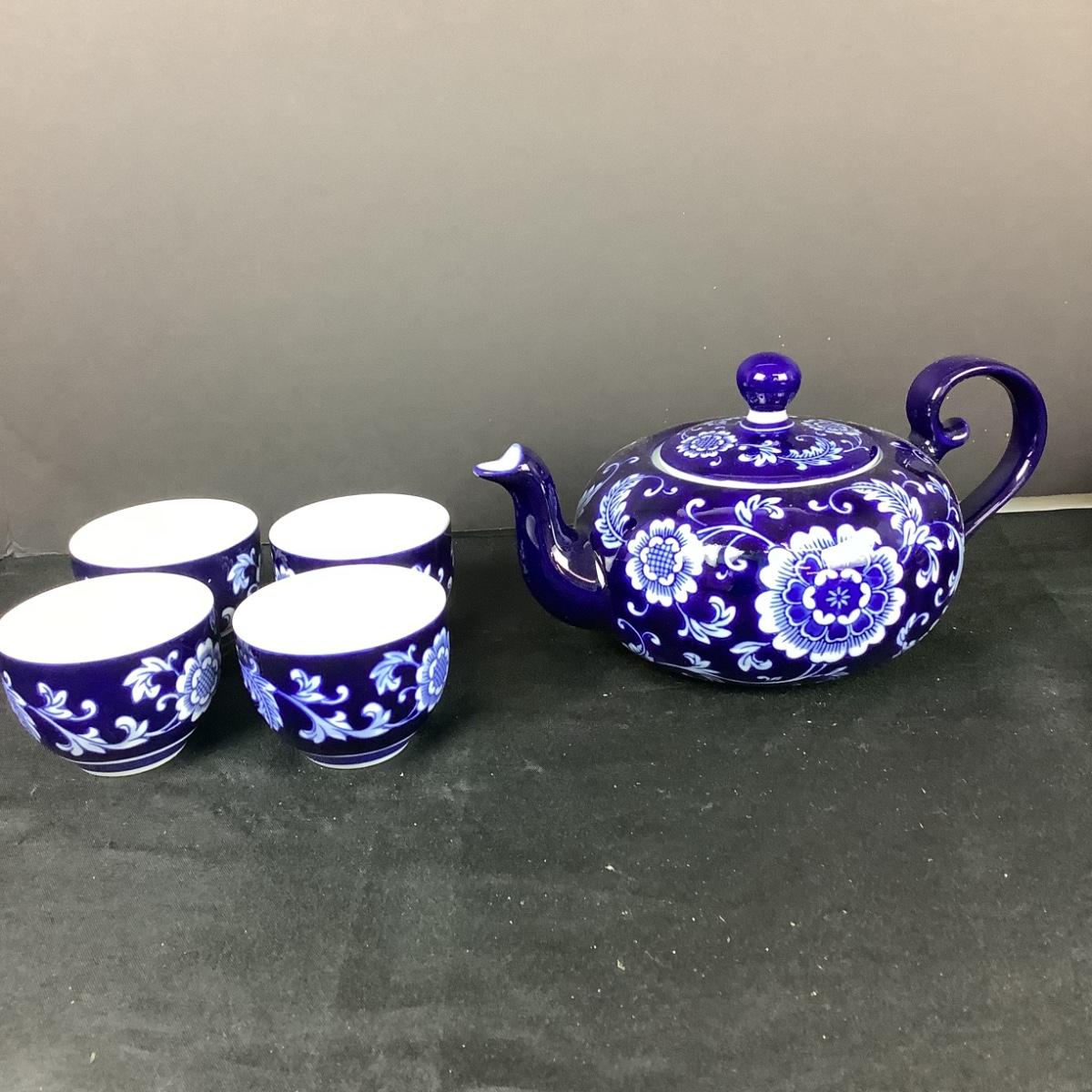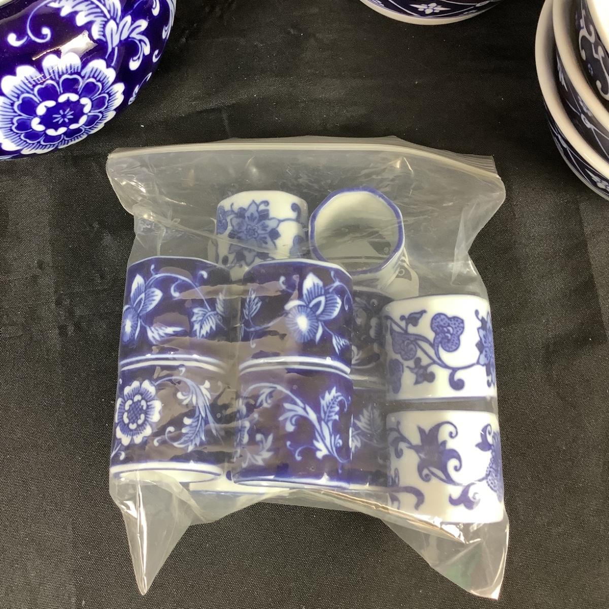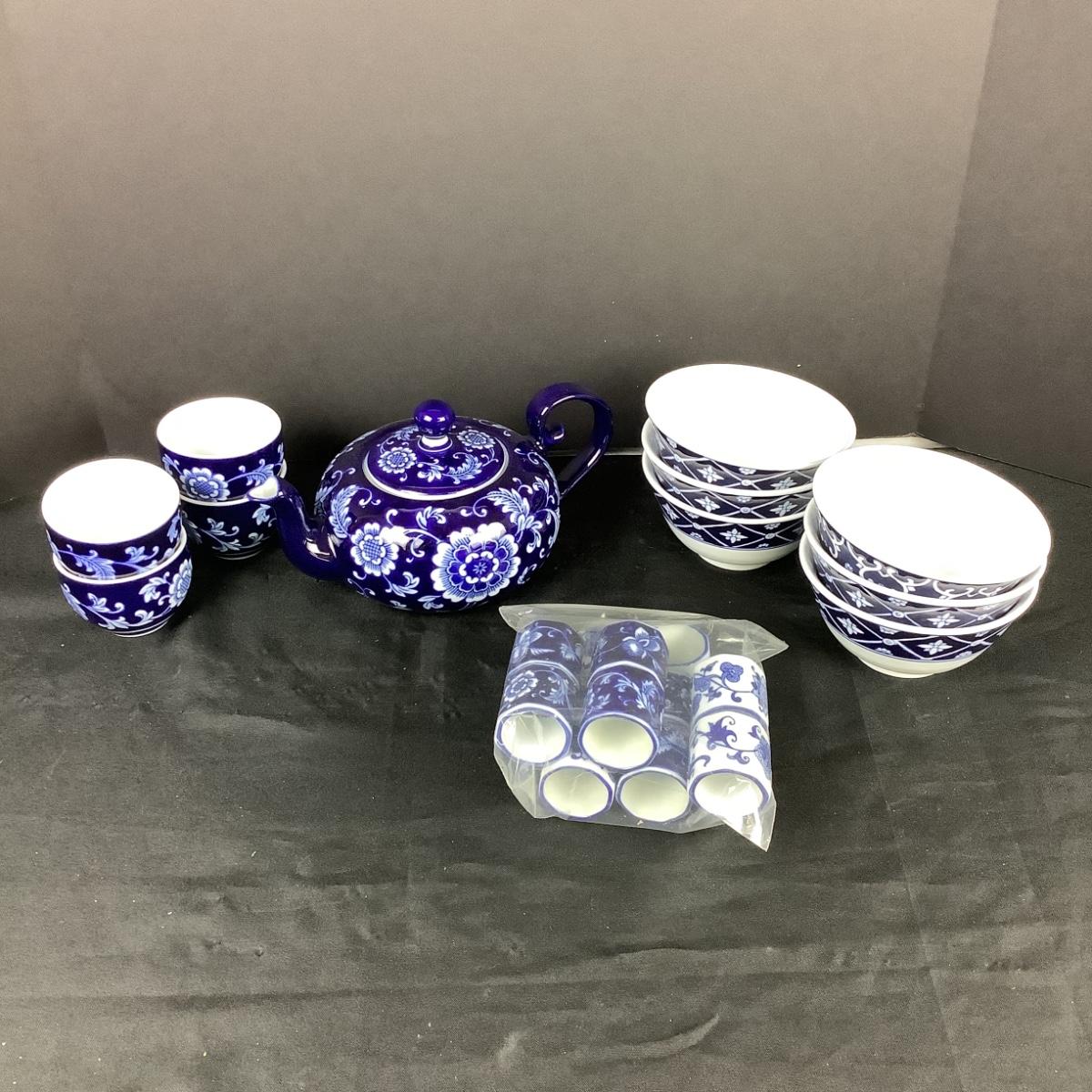 Pier 1 Hand Painted China Tea Set & 12 Napkin Rings