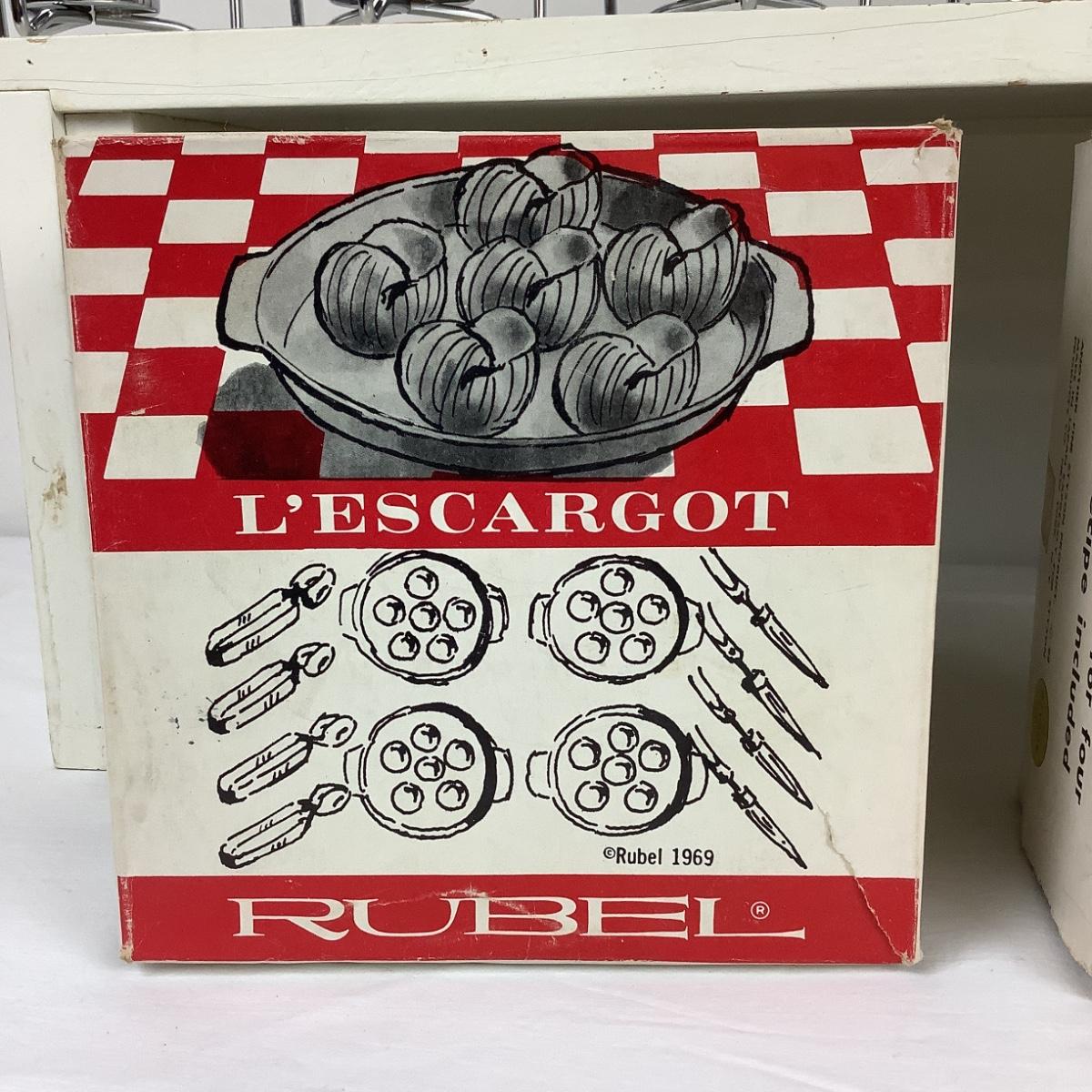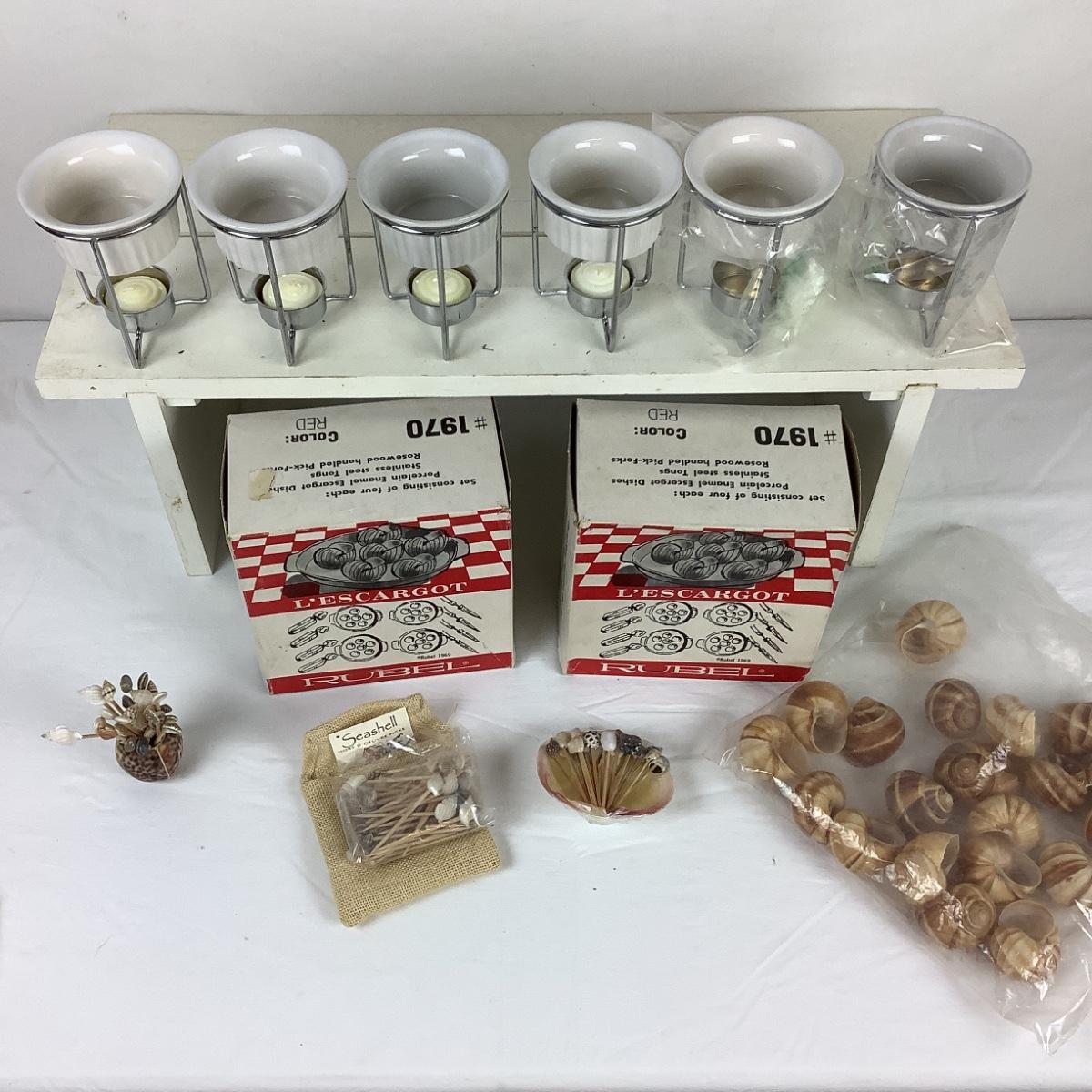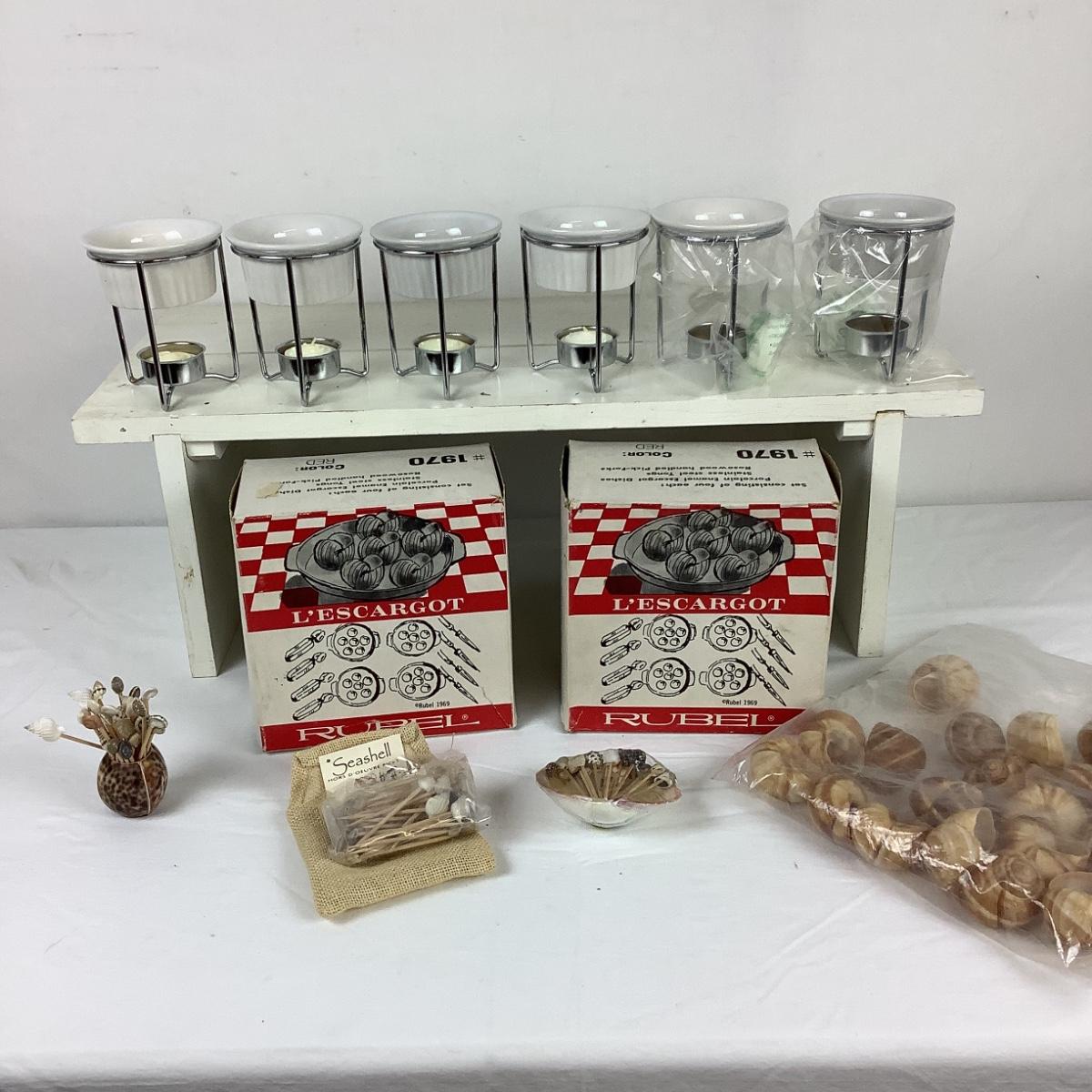 Escargot Lot, Seashell toothpicks, (2) L'Escargot Rubel Kits, Shells, & Escargot Heaters.