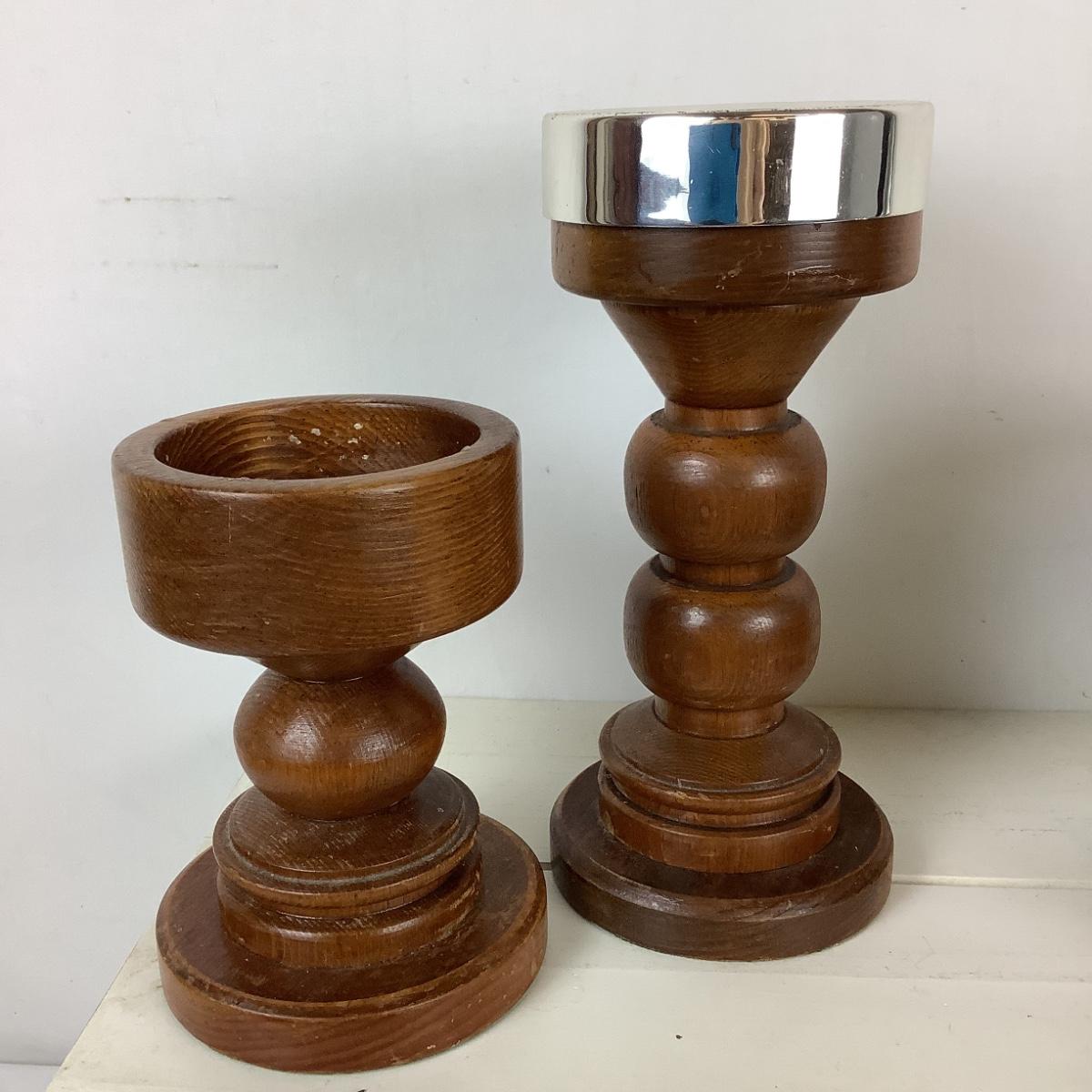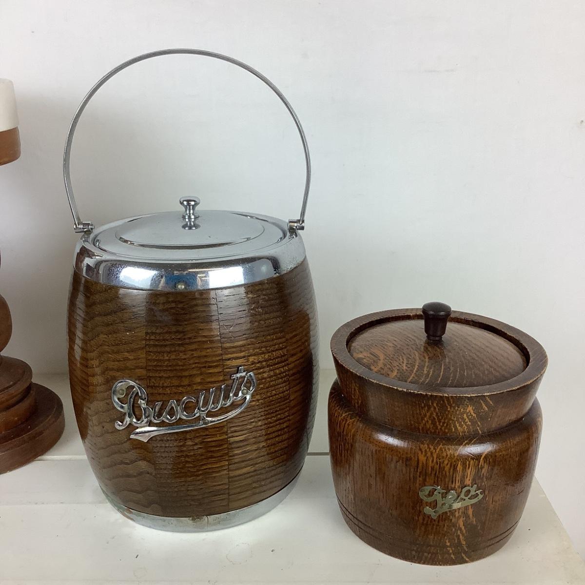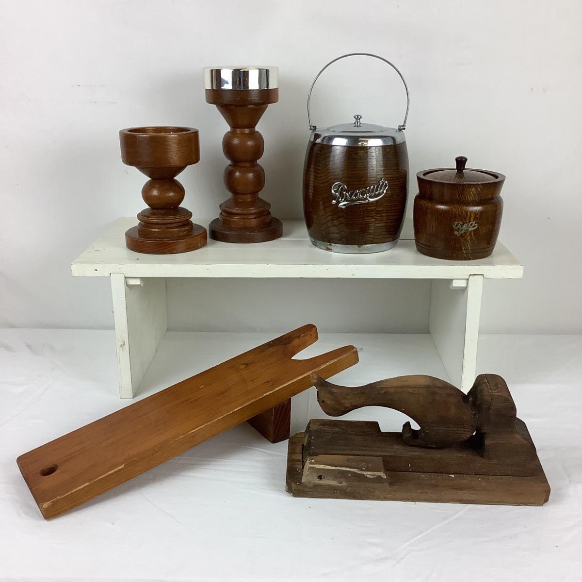 Early 1900s Tea Caddy, Wood Decor Lot. Biscuit Caddy, 2 Candle Stick Holders, Boot Remover, Door Knocker Carving