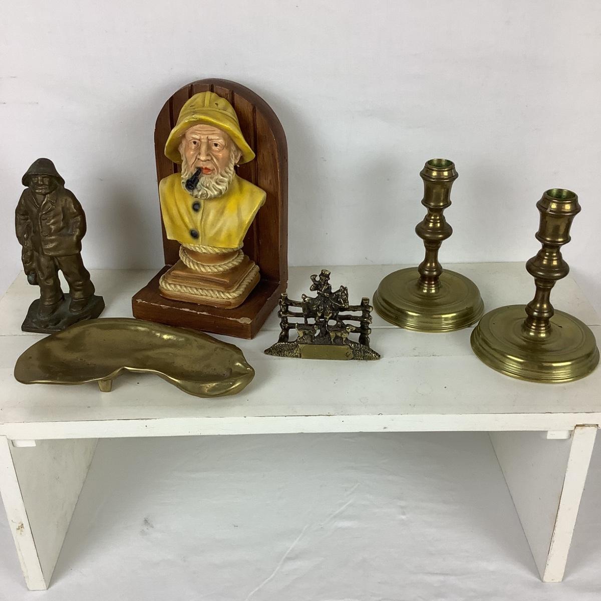 Assorted Brass Lot Candle Stick Holders, Oyster Bowl, Fisherman Figure & Bookend
