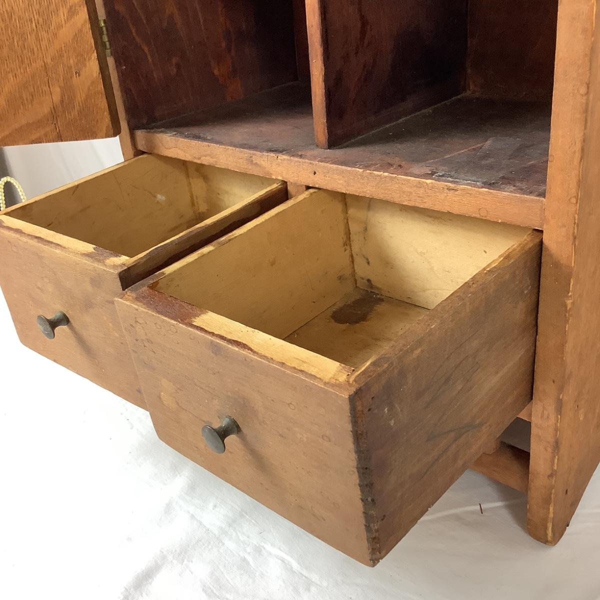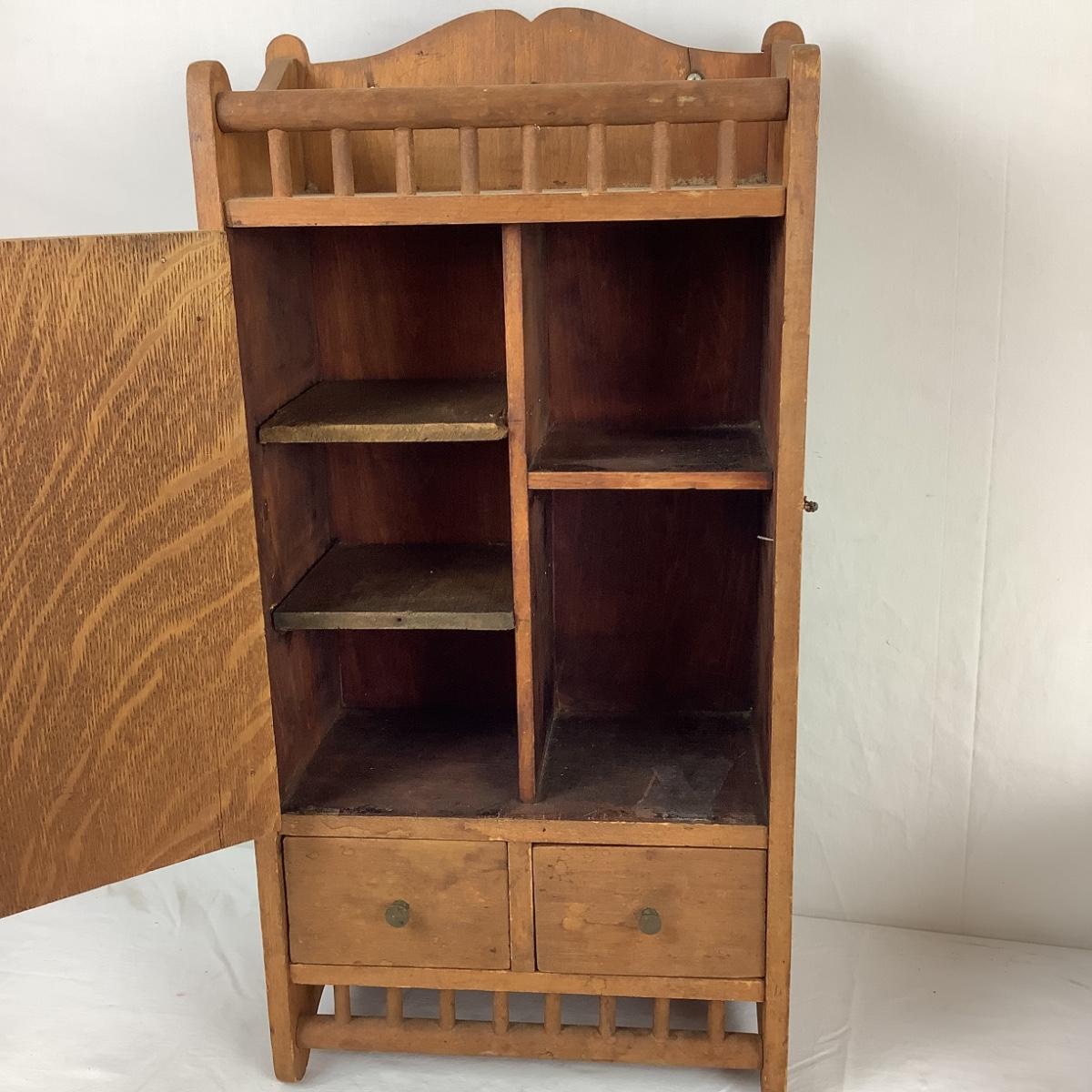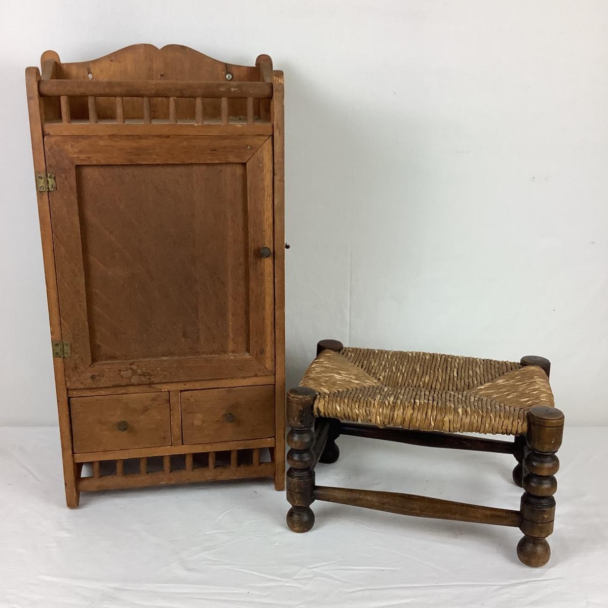 Antique Wall Cabinet & Rush Seat Spool Leg Stool