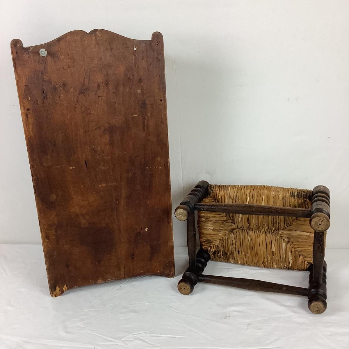 5185 Antique Wall Cabinet & Rush Seat Spool Leg Stool