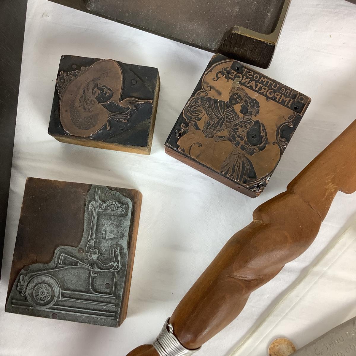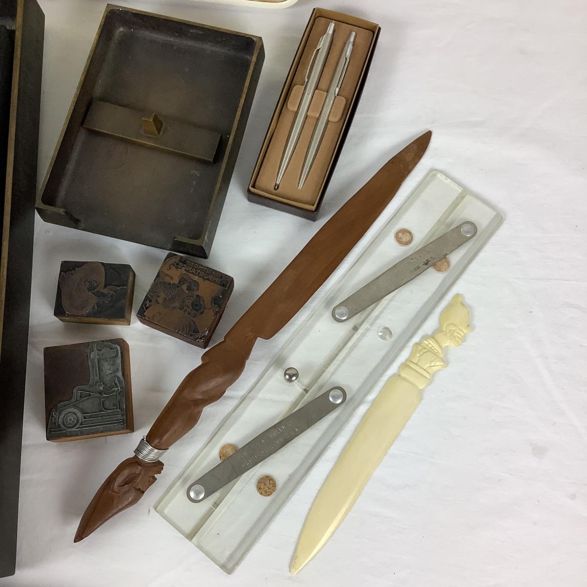Lot of Office Supplies & Tools. vintage stamps, architectural tools, gold pen, heavy desk organizers, letter openers, vintage Road Overseers receipts.