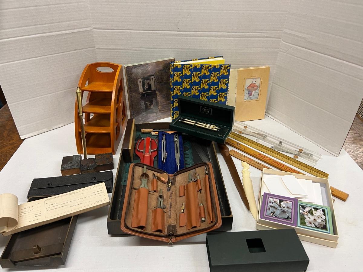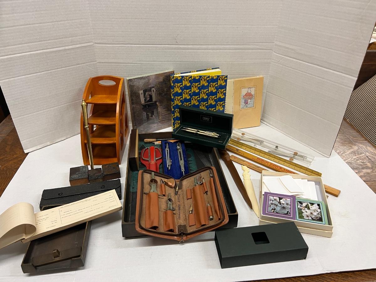 5188 Lot of Office Supplies & Tools Vintage Stamps, Architectural Tools, Gold Pen