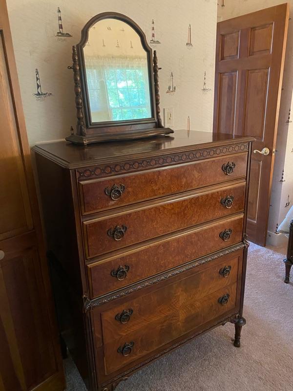 Dresser has 5 Drawers and measures 36” W x 20.5” D x 48” T ( mirror Is removable, it adds 21.5” to overall height of the dresser)